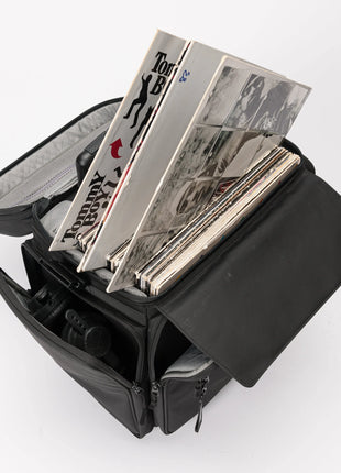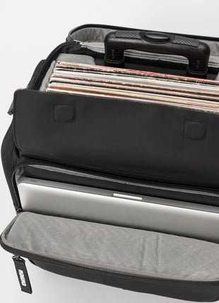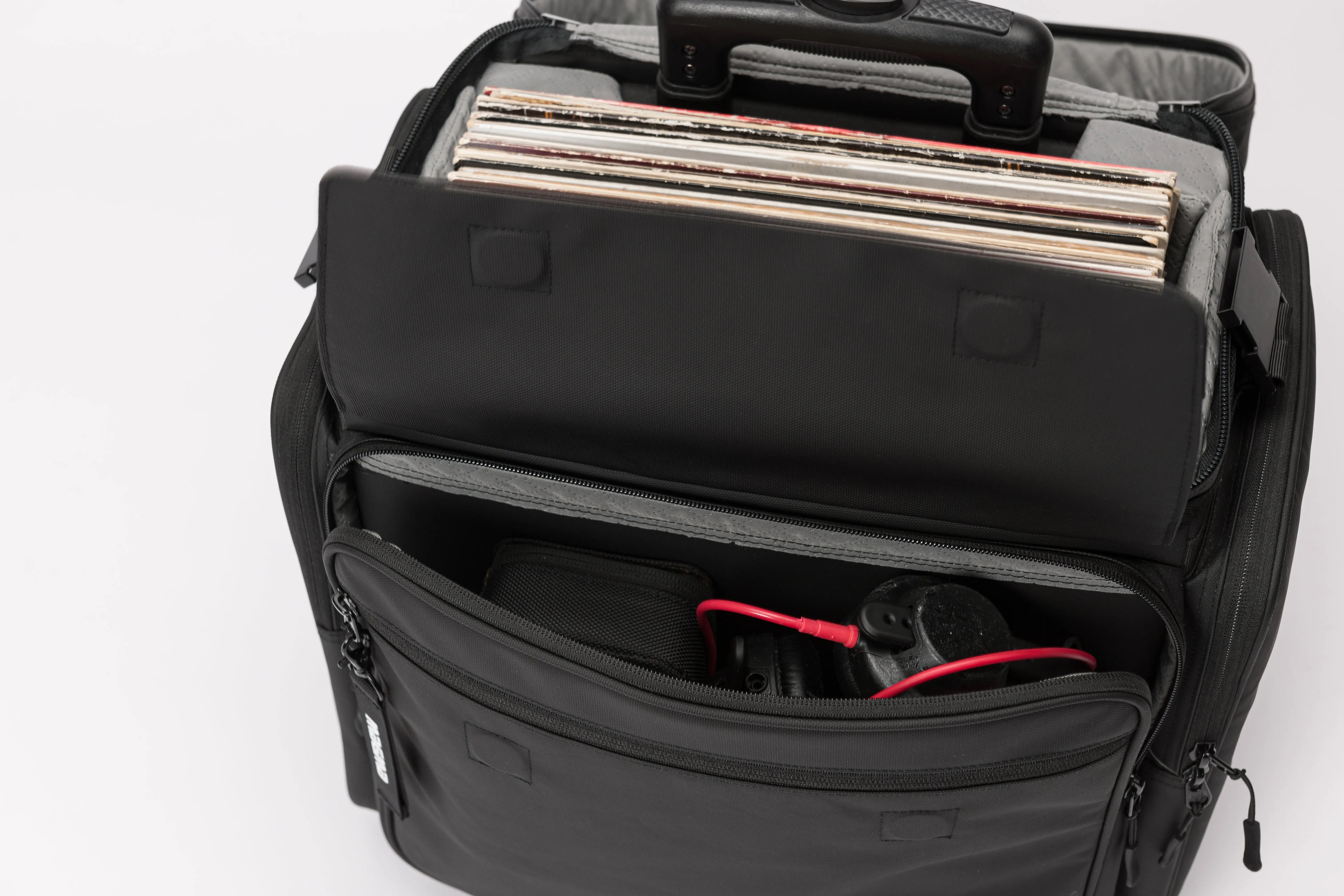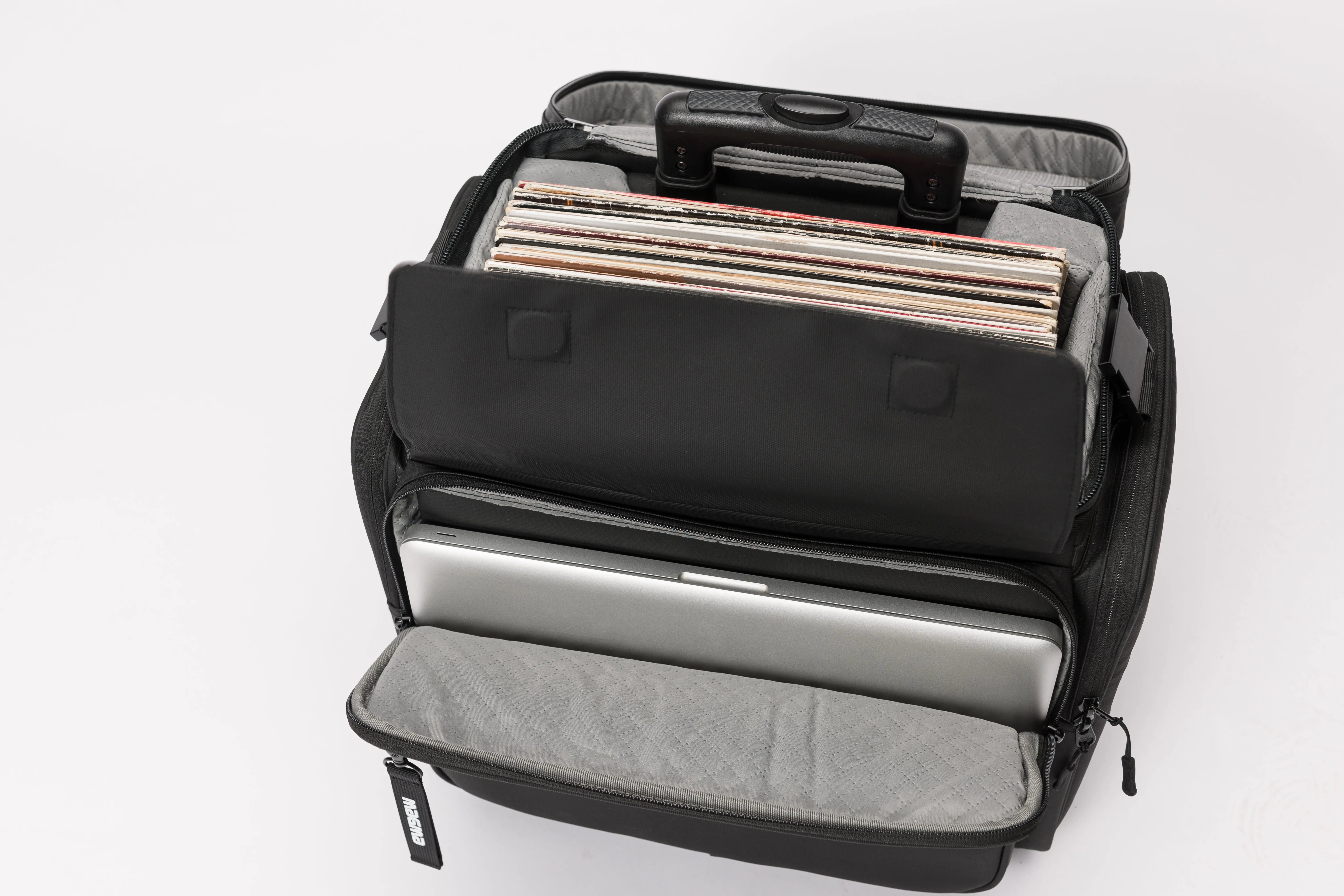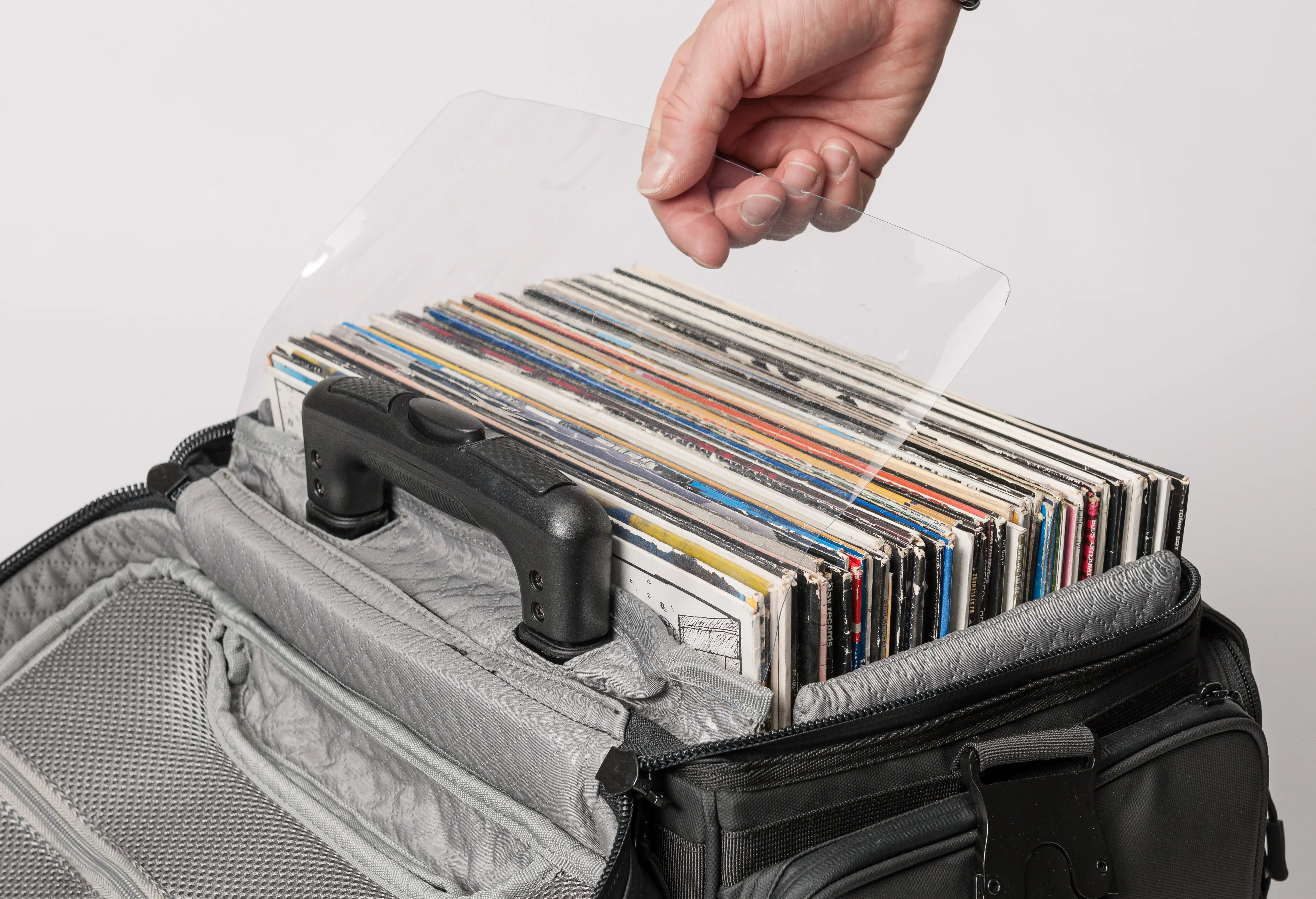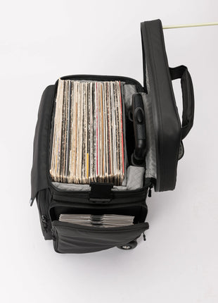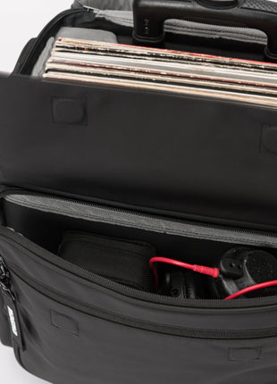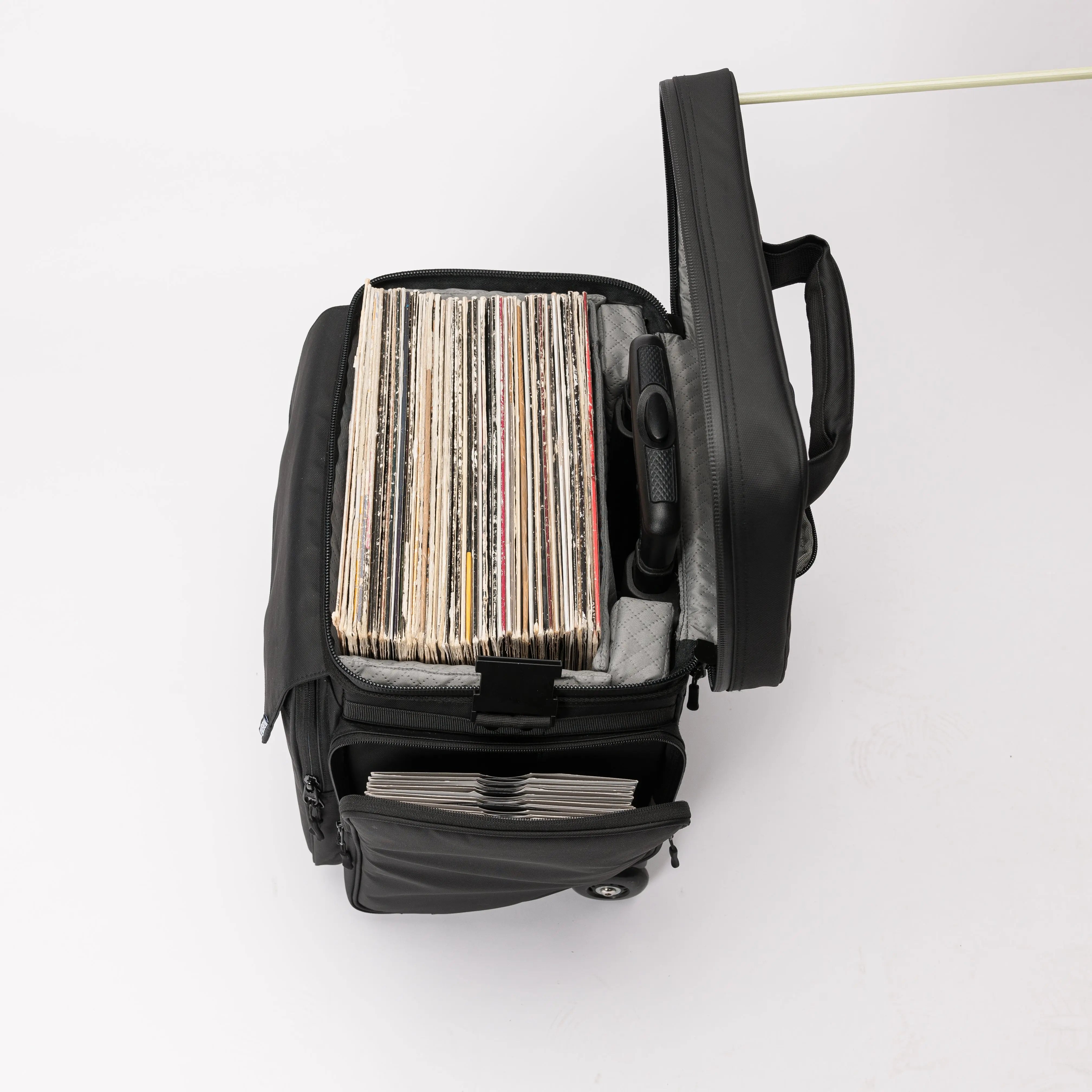 This stylish and practical vinyl trolley is designed for DJs on the go. It's crafted from sustainable materials and features interchangeable parts for long-lasting use, along with ample storage for your DJ essentials.