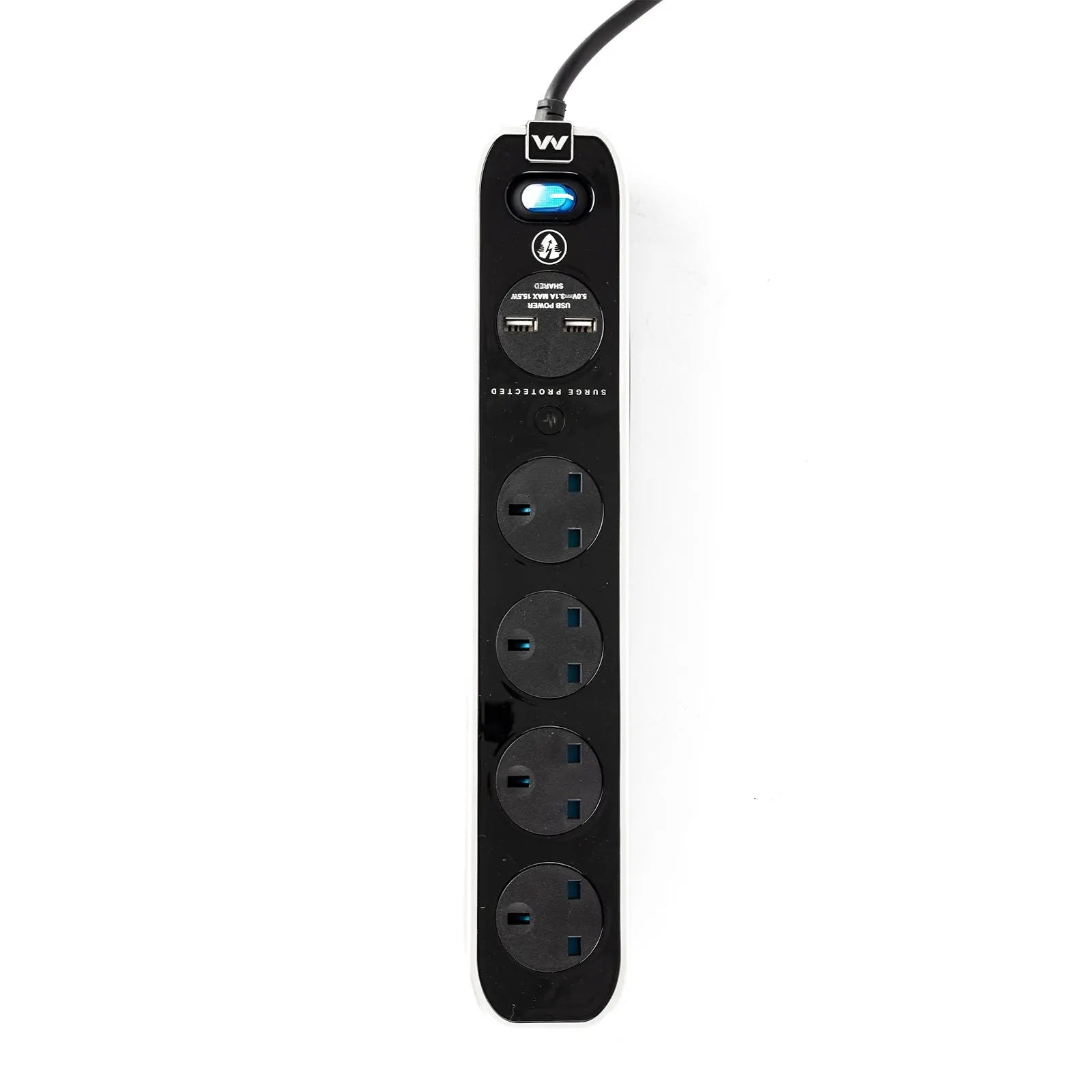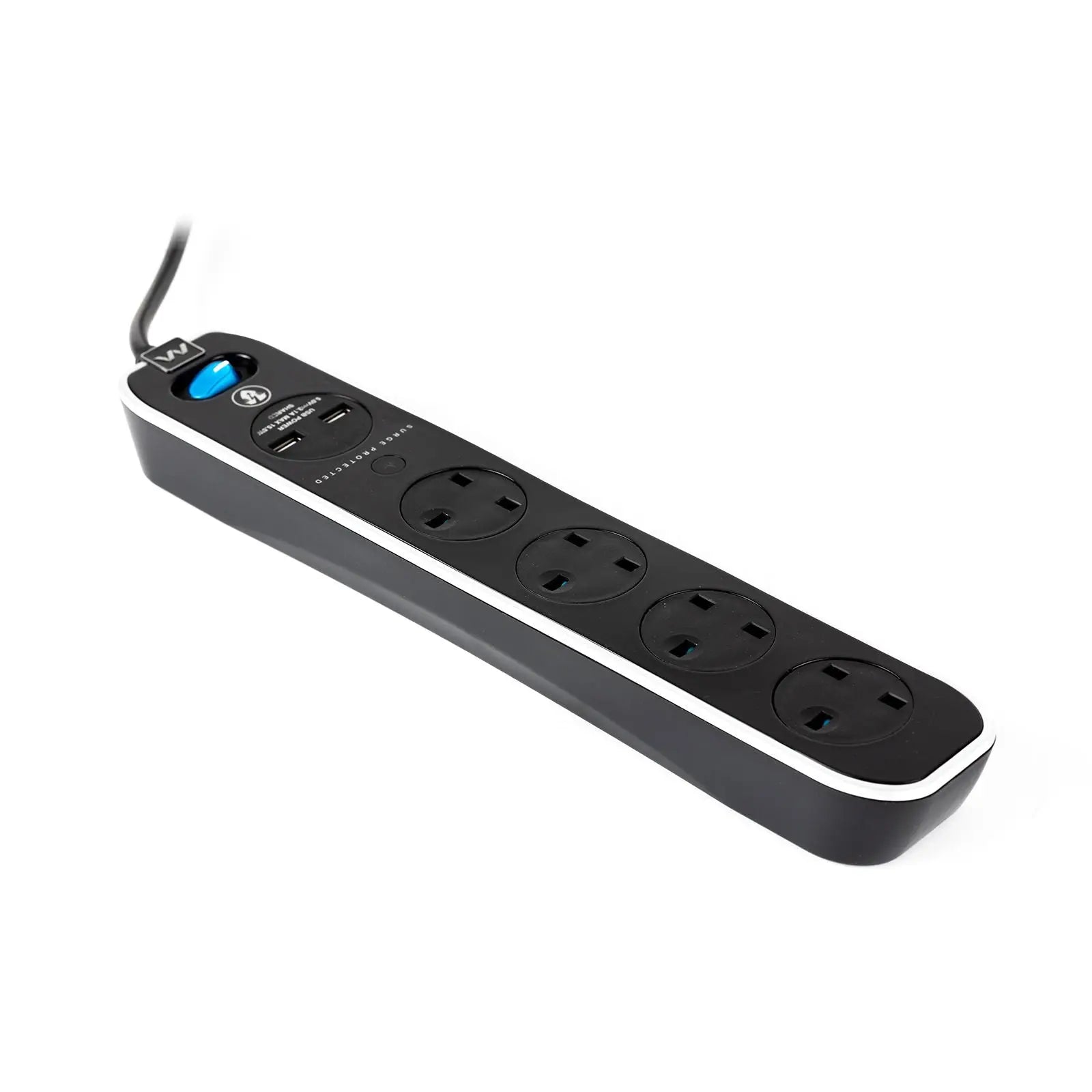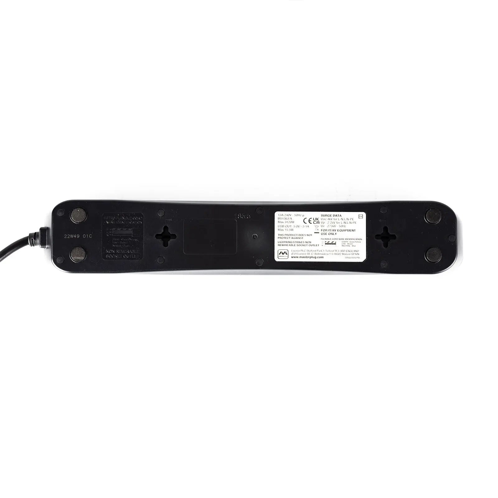The Masterplug SRGLSU42PB-MP Surge Protected Extension Lead is designed to provide safe and efficient power distribution for your home office or workspace. This premium extension lead features four surge-protected sockets ensuring protection against power surges and spikes safeguarding your valuable devices from damage.Incorporating two USB charging ports (3.1A shared) this power strip eliminates the need for additional USB adapters allowing you to charge mobile devices tablets and other electronics efficiently while keeping other outlets free for other appliances. The high-gloss black finish provides a sleek modern look making it suitable for desk or workstation use. 4 surge-protected sockets for safe multi-device connection 2 USB ports (3.1A shared) for charging smartphones tablets and more Integrated surge protection prevents damage from power spikes Safety shutters block accidental insertion of foreign objects Power & surge indicators show protection status Dedicated power switch for easy on/off control Wall-mountable for a neat space-saving setup 2m cable for extended reach to power sources High-gloss finish suits home and office use BS1363-2 certified for UK electrical safety 1-year manufacturer warranty for peace of mind