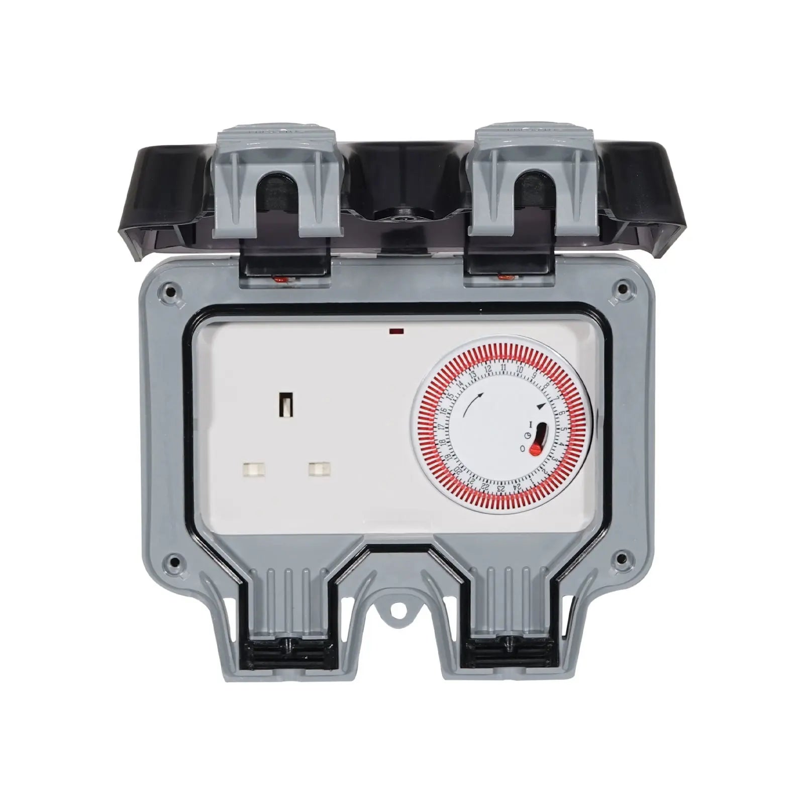 A 13A single socket IP66 rated outdoor time controlled socket outlet offering a 24 hour timer with 15 minute intervals an override switch 8 cable entries and LED power indicator. IP66 Rated with plug in use and cover sealed Socket manufactured to BS 1363-2 24 hour mechanical timer 1 segment = 15 minutes. With override switch and LED power indicator Weather and dust protection: Protection against ingress from water jets and dust the durable seals will maintain integrity over the products life Ergonomic front cover/lid: Bright LED power indicator visible via see-through cover - Hinged cover has simple press to open or press to close operation with neck feature that accommodates most plugs with bulky moulded strain relief lockable cover Robust construction: Polycarbonate high impact resistance long lasting casing will not crack or fade and housing incorporates cable entry seals Supplied with multiple knock-out mounting box