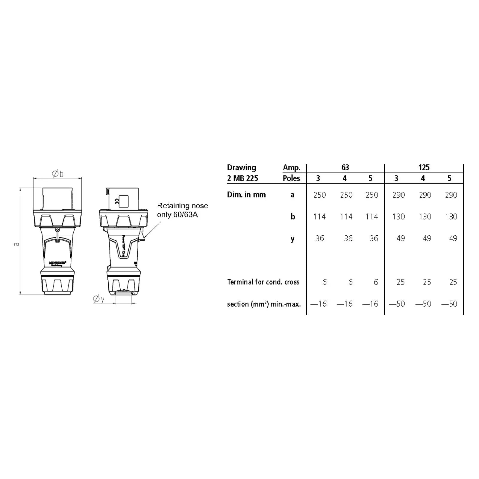 As a specialist for plugs and sockets Mennekes is known worldwide for setting standards. With the PowerTOP® Xtra it has always been their aim to deliver the highest quality products for practical use. Mennekes have combined all their know-how into a clearly structured product family and completely redefined their CEE plugs sockets and phase inverters. In the future there will only be ONE PowerTOP® Xtra family with solutions for any area of application. Plugs and sockets inverters have been completely redesigned and optimised in every detail! Together with the well-proofed PowerTOP® Xtra in 63A or 125A the new PowerTOP® Xtra family sets the CEE with X-CONTACT inside! 63A 415V 3P+N+E male configuration Screw terminals Rubberised grip area Frame terminals Highly heat resistant contact carrier Nickel plated X-CONTACT for minimal insertion forces Cable gland and sealing Strain relief and protection against kinking Enclosure with thread lock and two safety slides IP67 Rated
