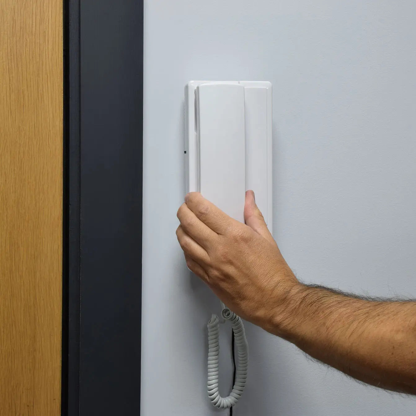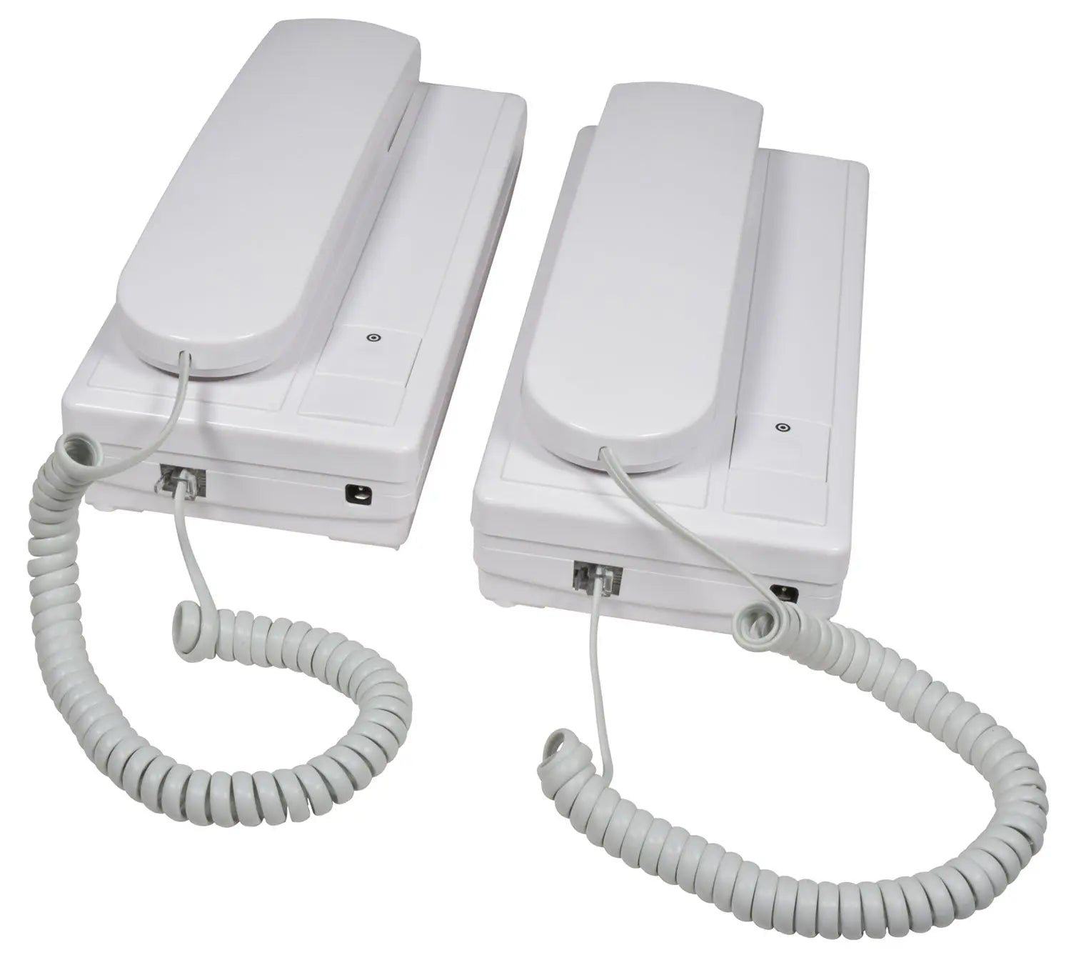 A two station, energy saving, telephone style intercom with a simple two wire connection, allowing 2-way conversation. It features a call button with adjustable call tone level. Both units are powered by 4x AA batteries (not supplied).
