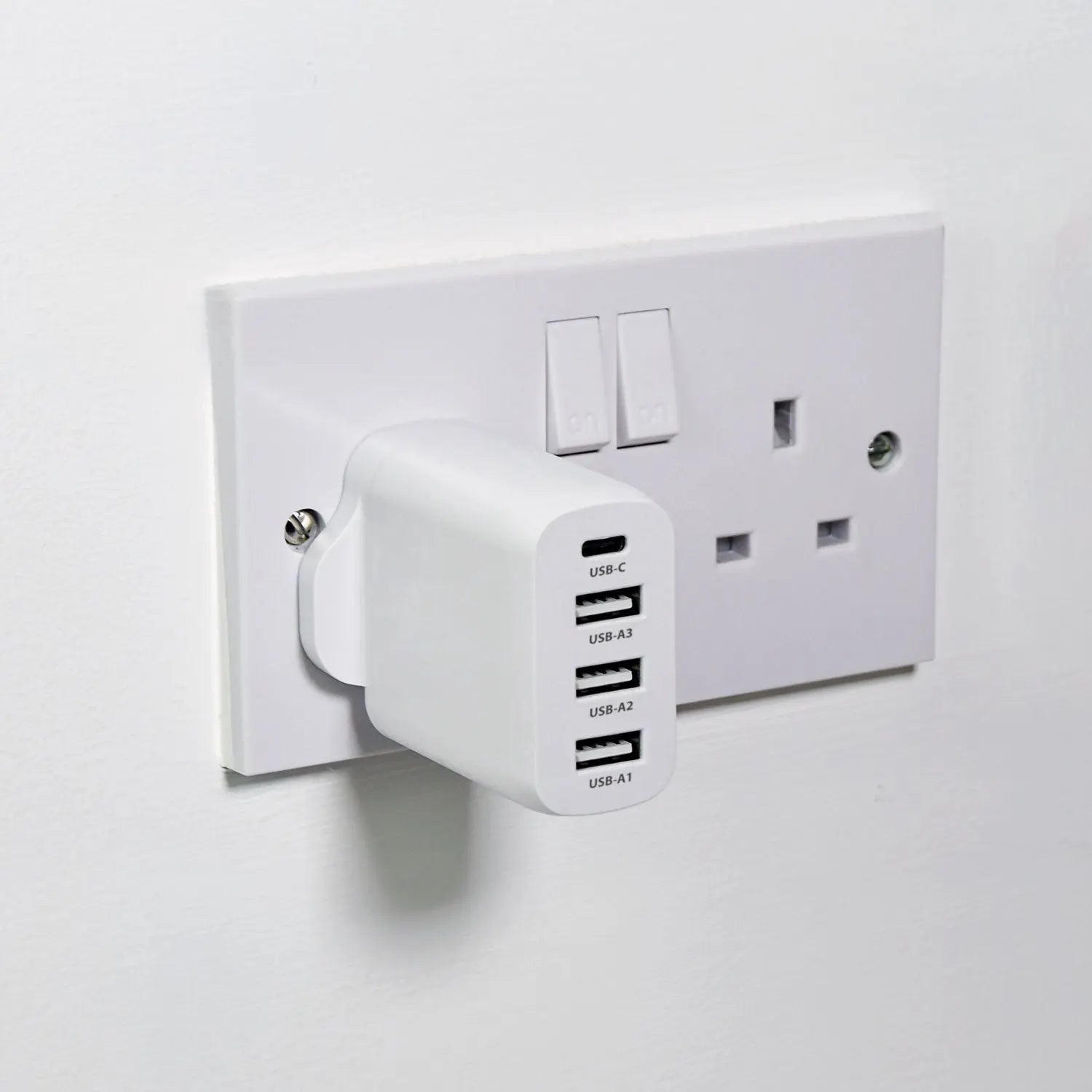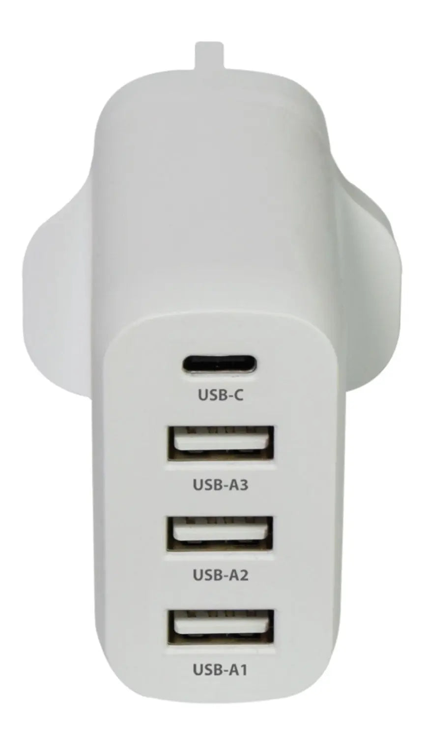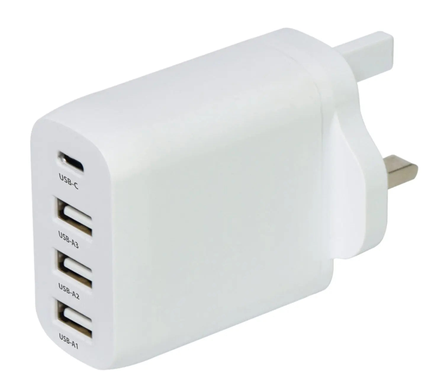 A mains charger with 3 USB Type-A ports and 1 fast charge USB Type-C port. Ideal for charging multiple devices at once.