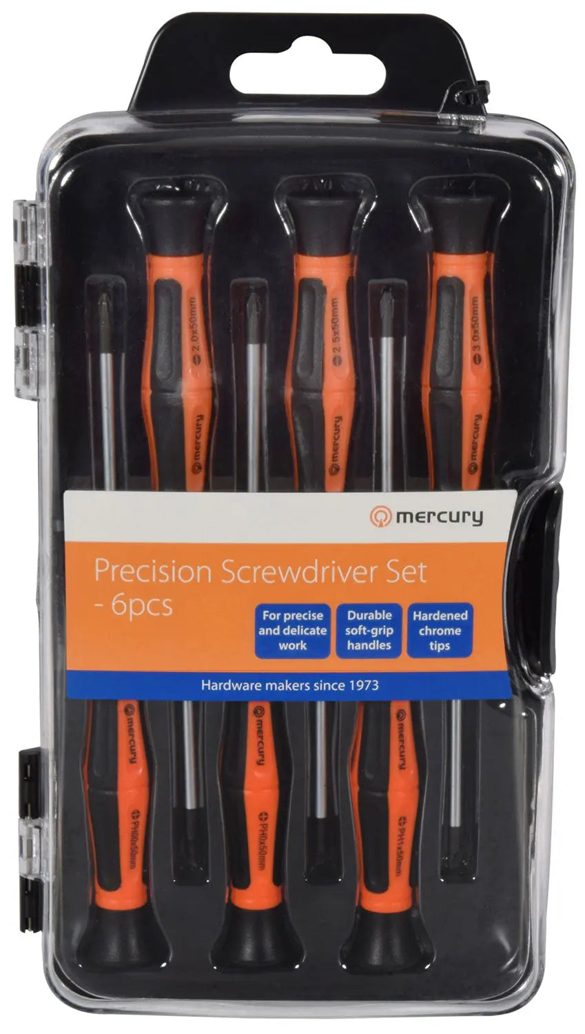 A handy set of precision screwdrivers, including 3 slotted and 3 Phillips tipped models. Each driver is manufactured with a chrome vanadium tip and durable, soft-grip handle, and comes clearly labelled for quick and easy identification. Spinning end caps enable gentle palm or finger pressure to be applied while simultaneously turning with one hand; perfect for delicate and precise work. Supplied in a convenient, plastic storage case.