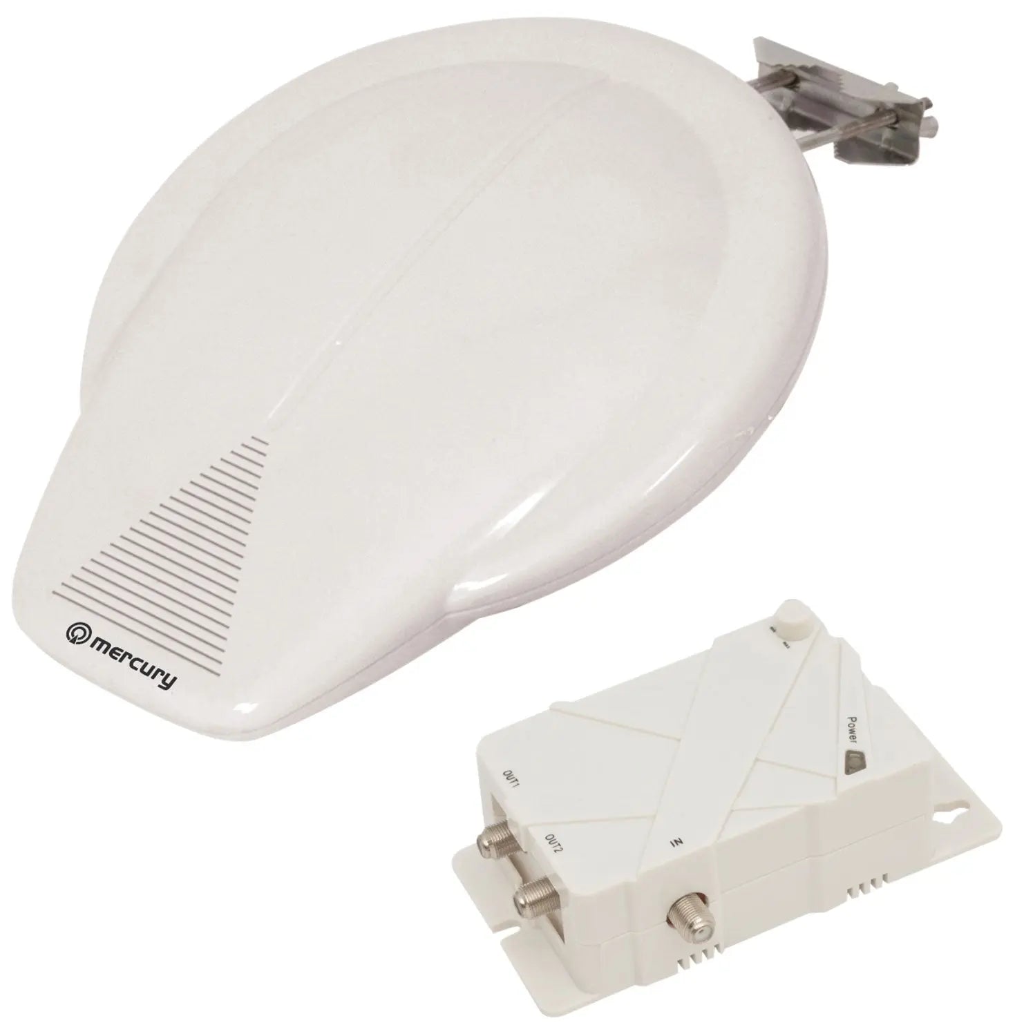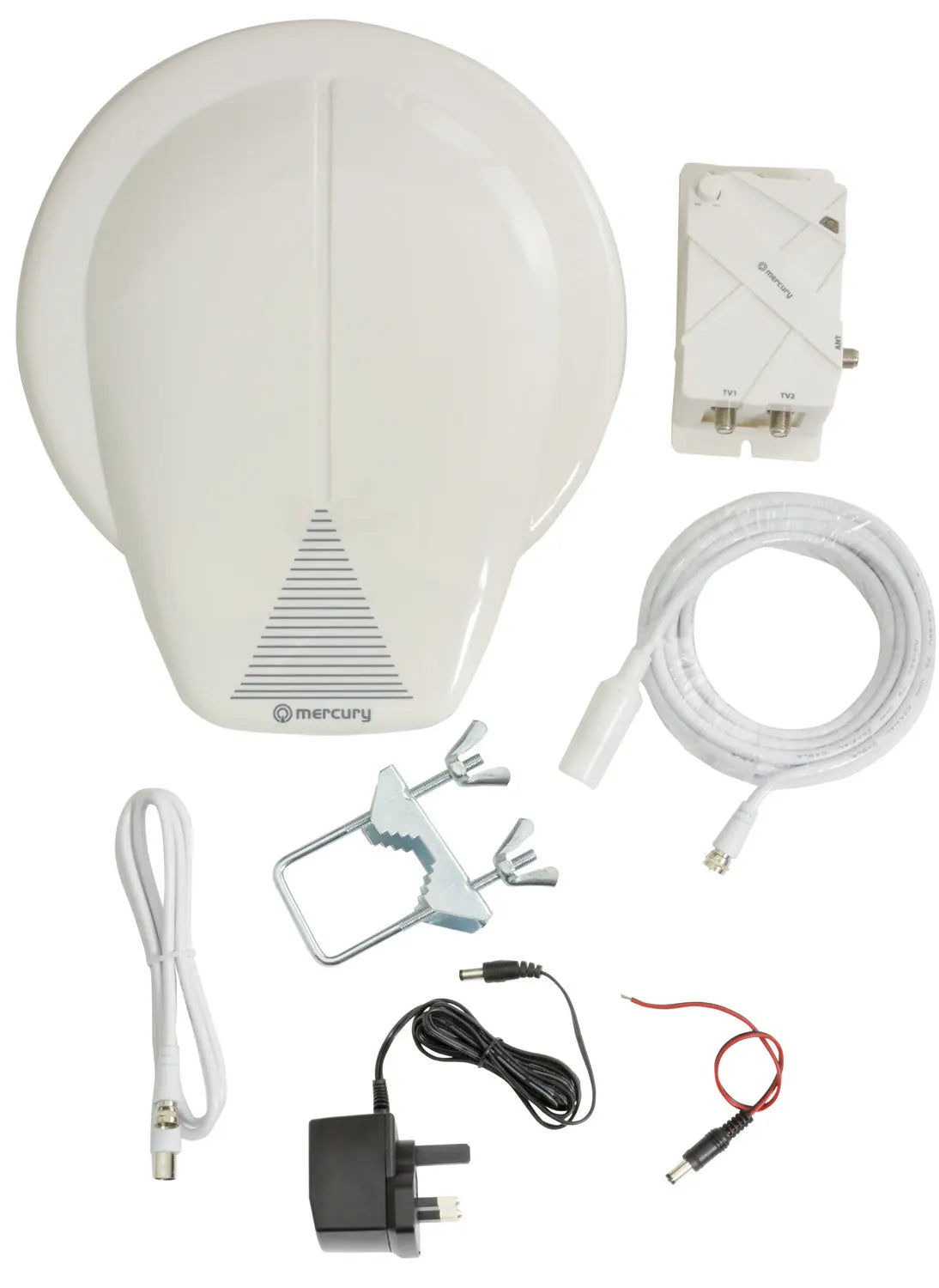 Outdoor HDTV aerial specially designed for camping and marine use and compatible with Digital Terrestrial TV and DAB/FM radio signals. The built-in amplifier gives a clear picture even if the signal reception is weak. Can be mounted on a pole of up to 38mmØ using the clamp supplied.