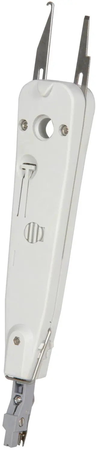A convenient tool for professionally installing wires from computer, telecom and network cables into patch panels, telephone sockets, keystone faceplates and more, without soldering. The tool uses a pressure-based mechanism to secure wires into compatible connectors while breaking the insulation and establishing contact. The spring-loaded blade automatically trims excess wire in the process. A pull-out hook and blade are incorporated, to remove existing wires from connectors and to trim and strip new wires as required.