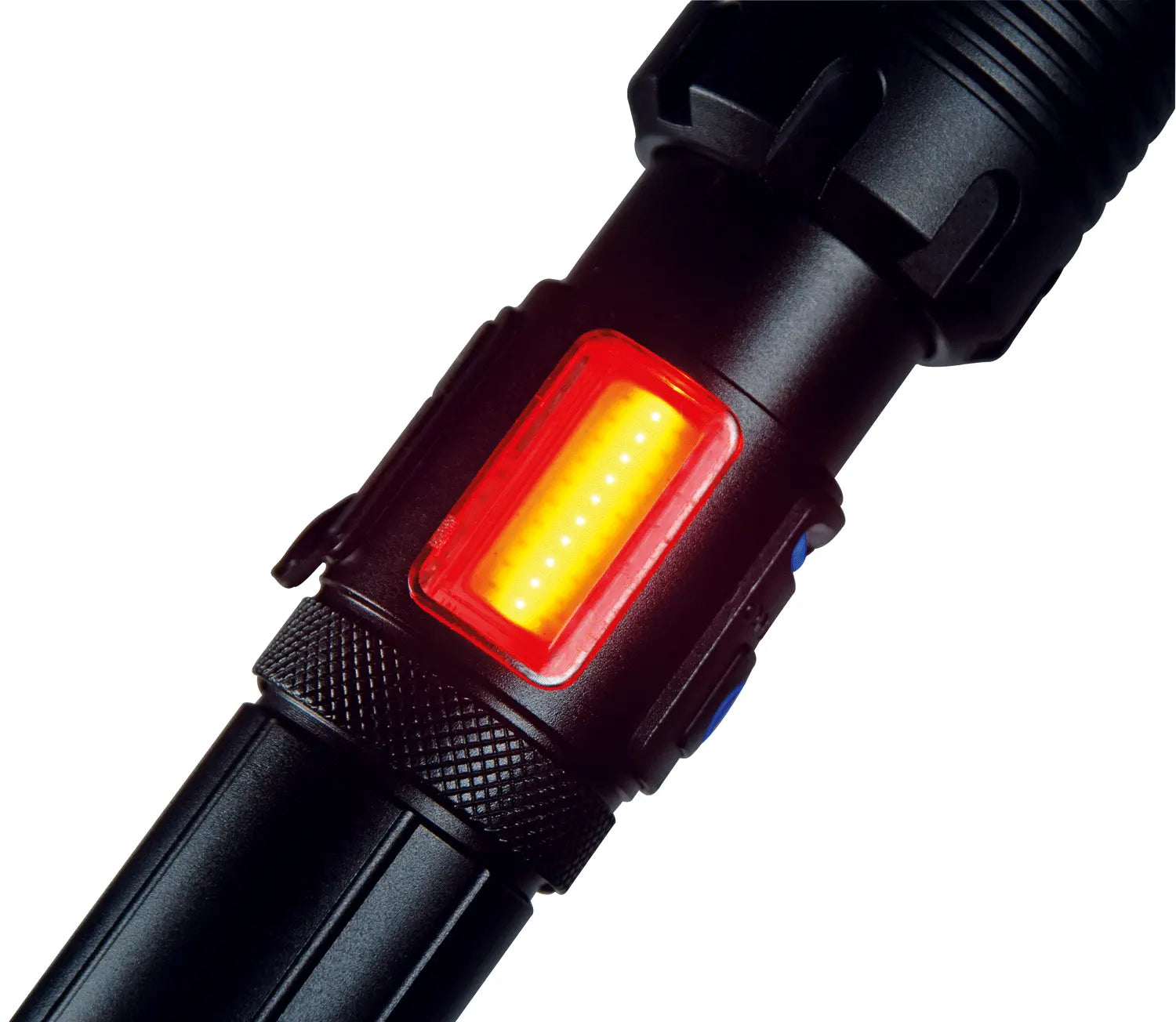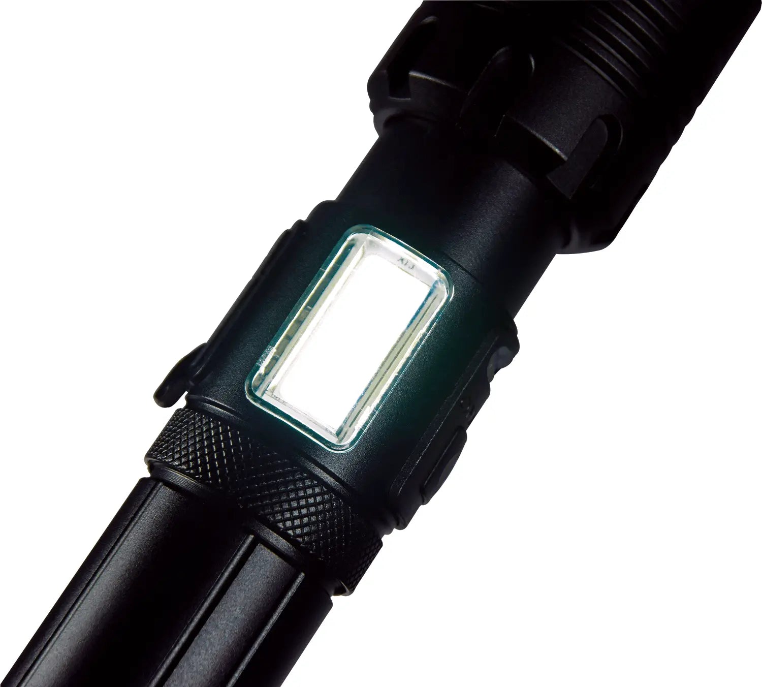 Rugged metal bodied, super bright USB Rechargeable COB LED Flashlight with 7 lighting modes. Useful for hiking, camping, or keeping in a car, this flashlight will give you up to 8 hours use on a single charge. Featuring a main beam and side lamp that can act as a work light or emergency warning light. Can also be used as an emergency powerbank via the 5000mAh battery and USB A port