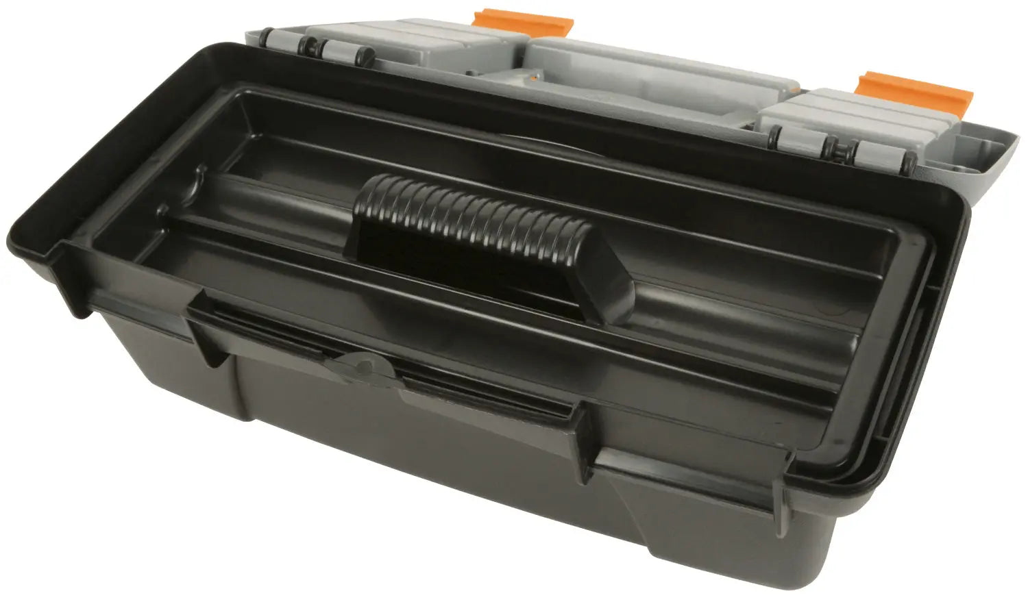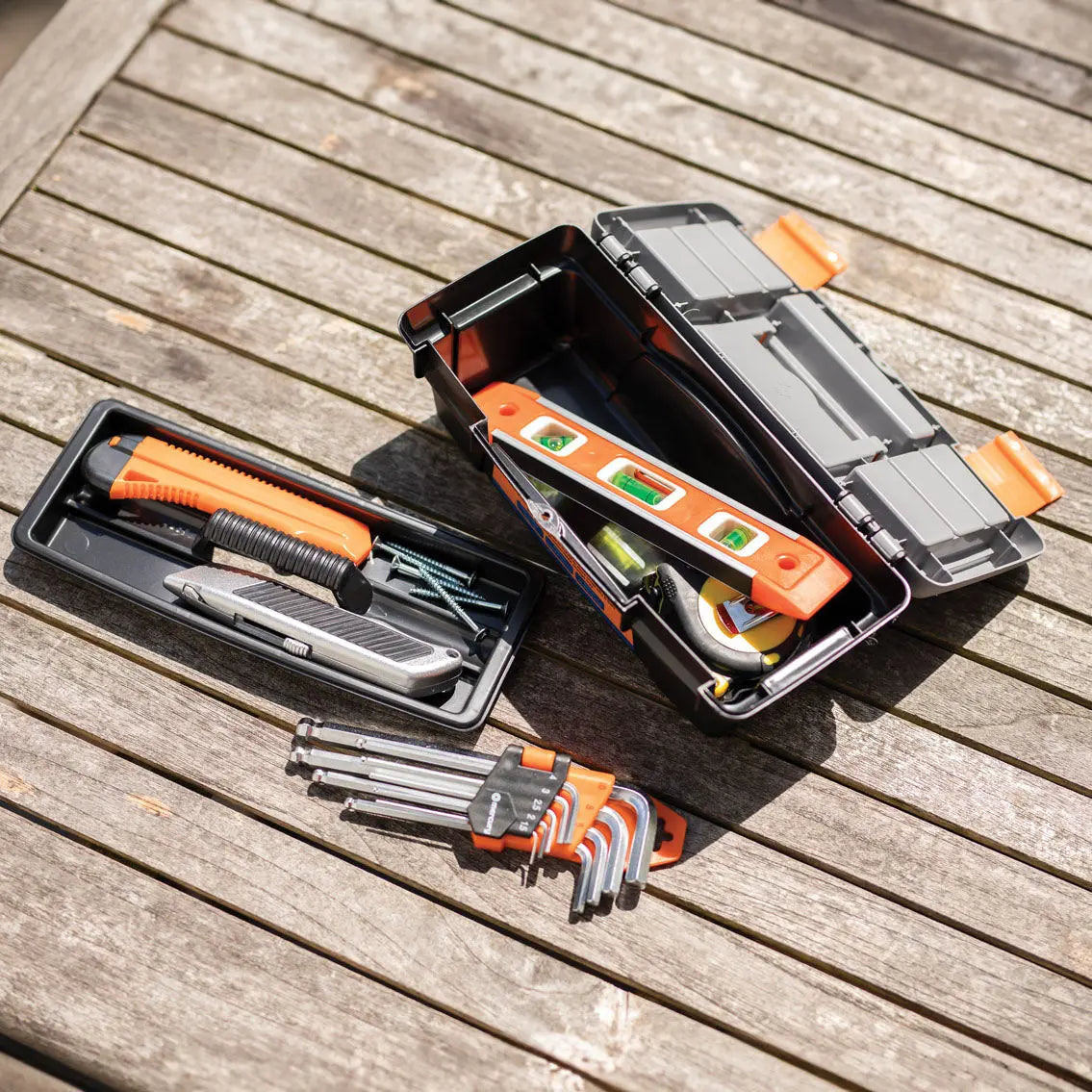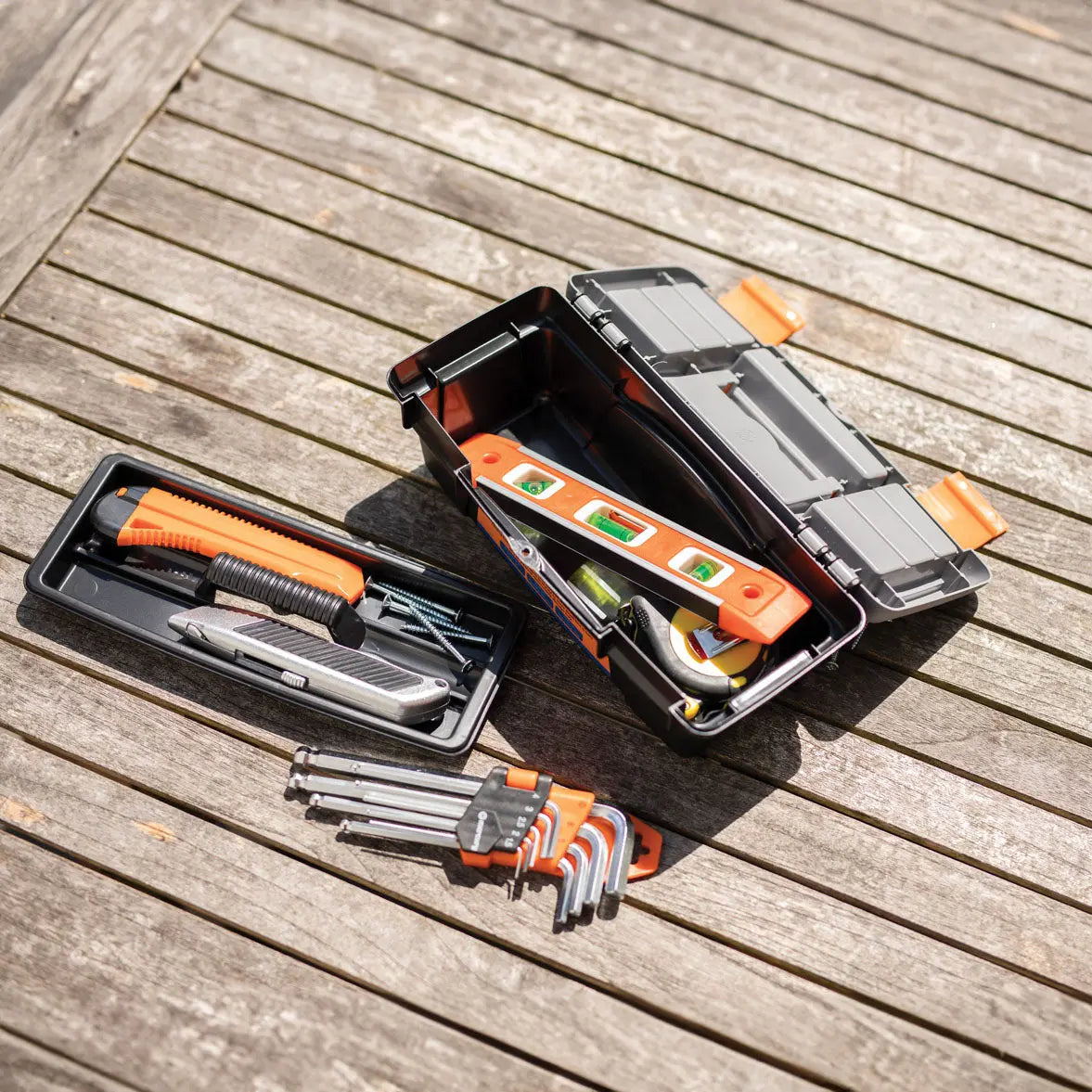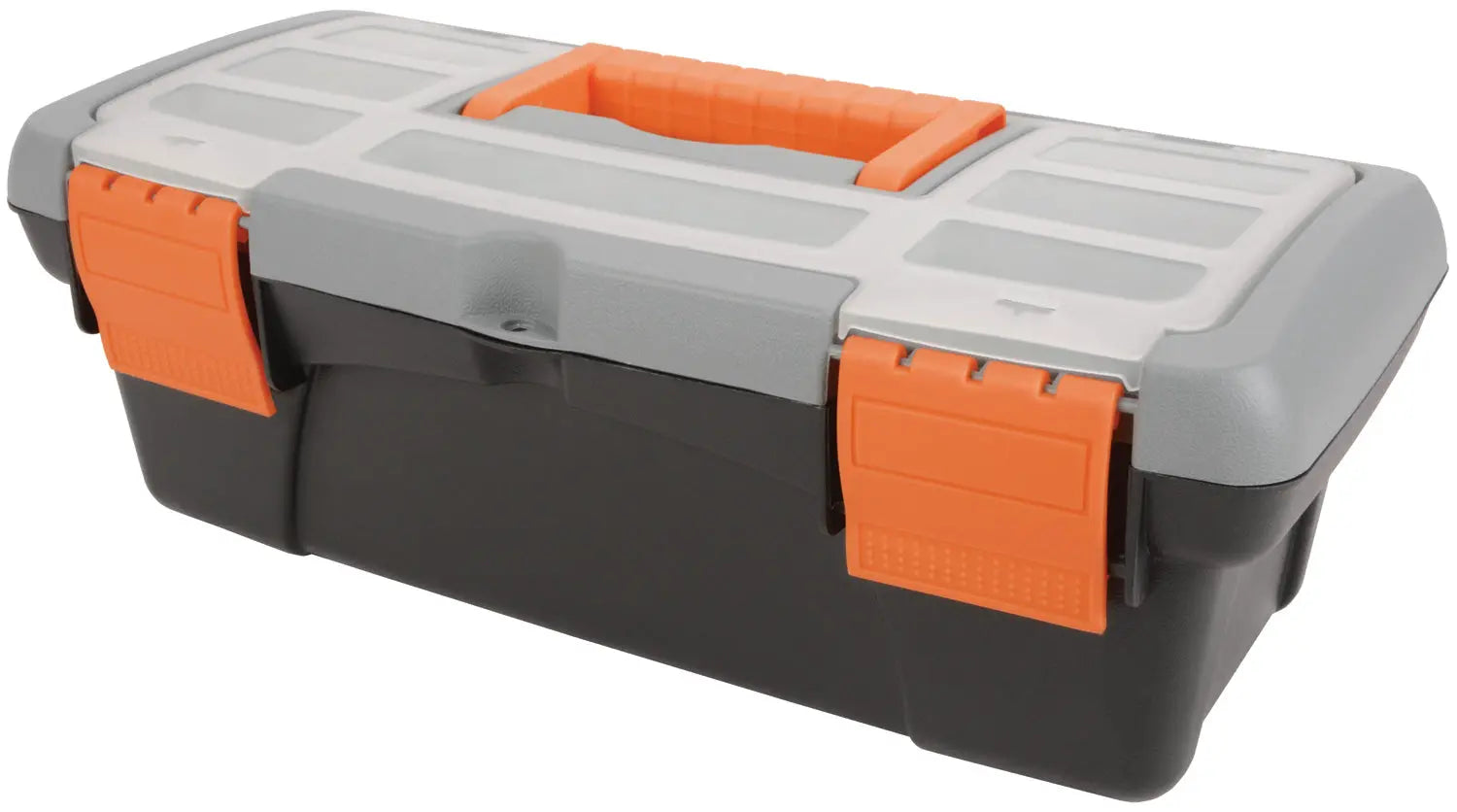 A compact yet versatile toolbox, ideal for storing small hand tools but equally suitable for fixings; fishing tackle; craft and hobby paraphernalia or sewing supplies. Made from tough, durable plastic, the hinged chassis features a top carry handle, robust fastening clips and an overlapping padlock eyehole between the chest and lid for added security. Small items can be stored within the multi-chambered lid, which has a transparent plastic top for clear sight of its contents. A removable tote tray within the main chest allows for further organisation and separation of items.