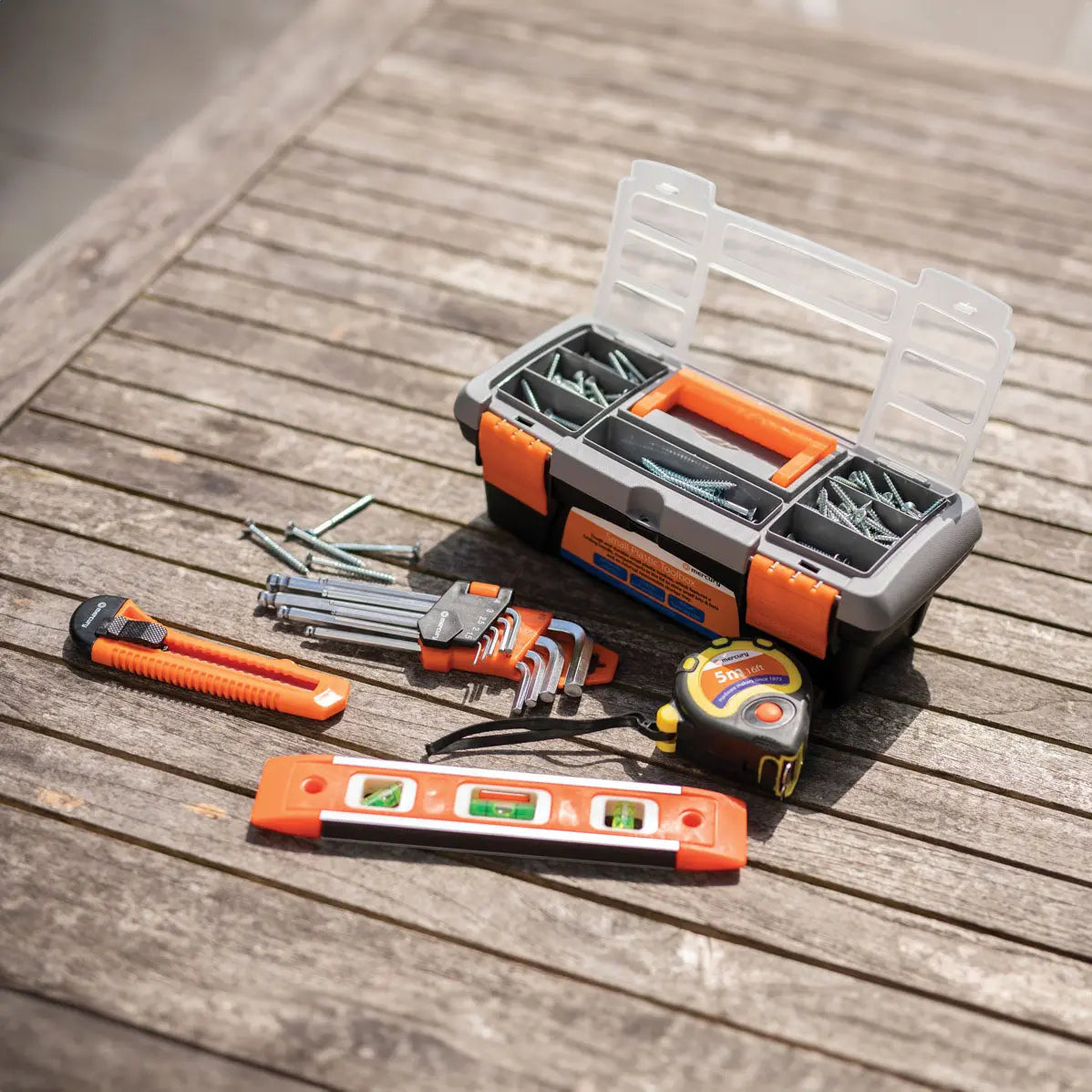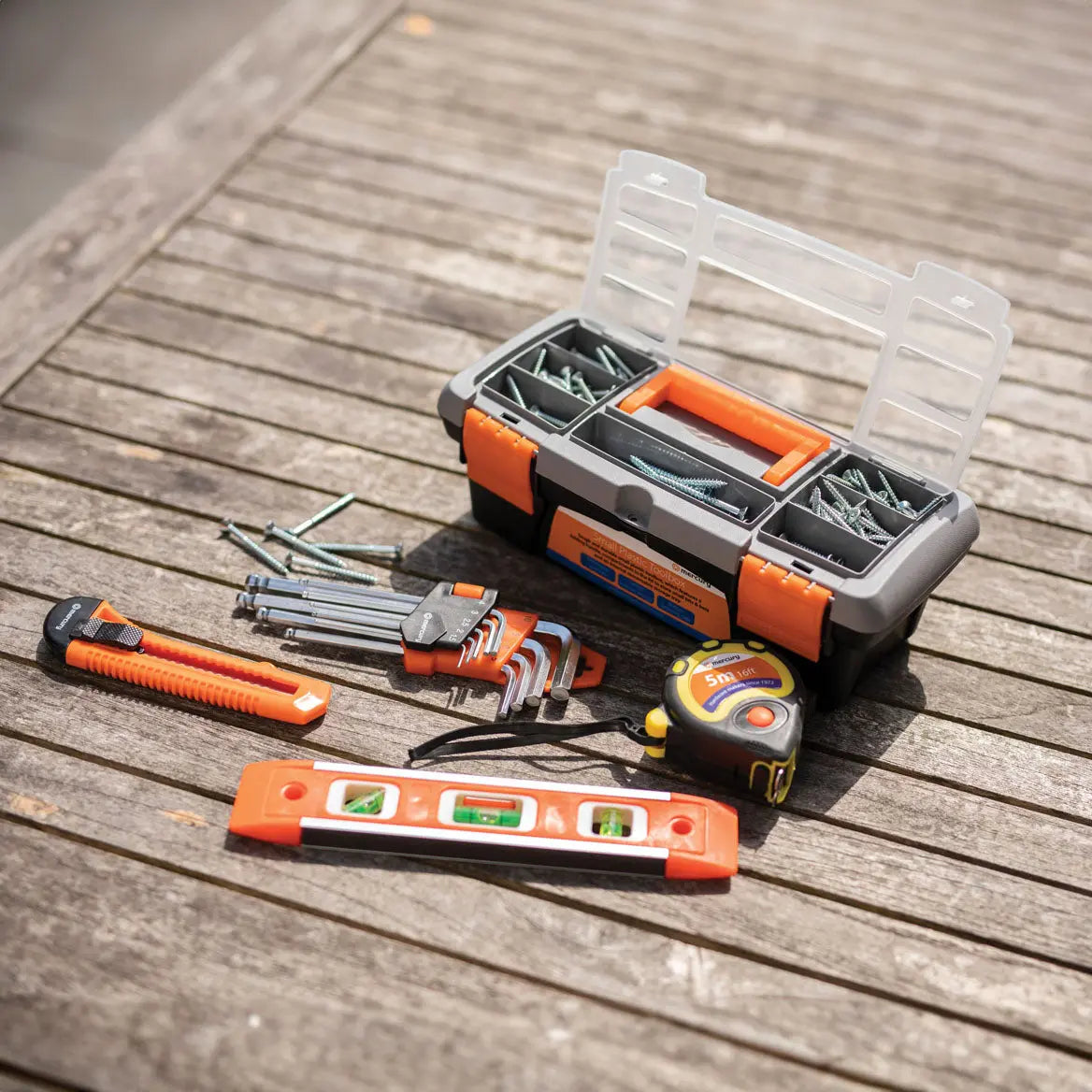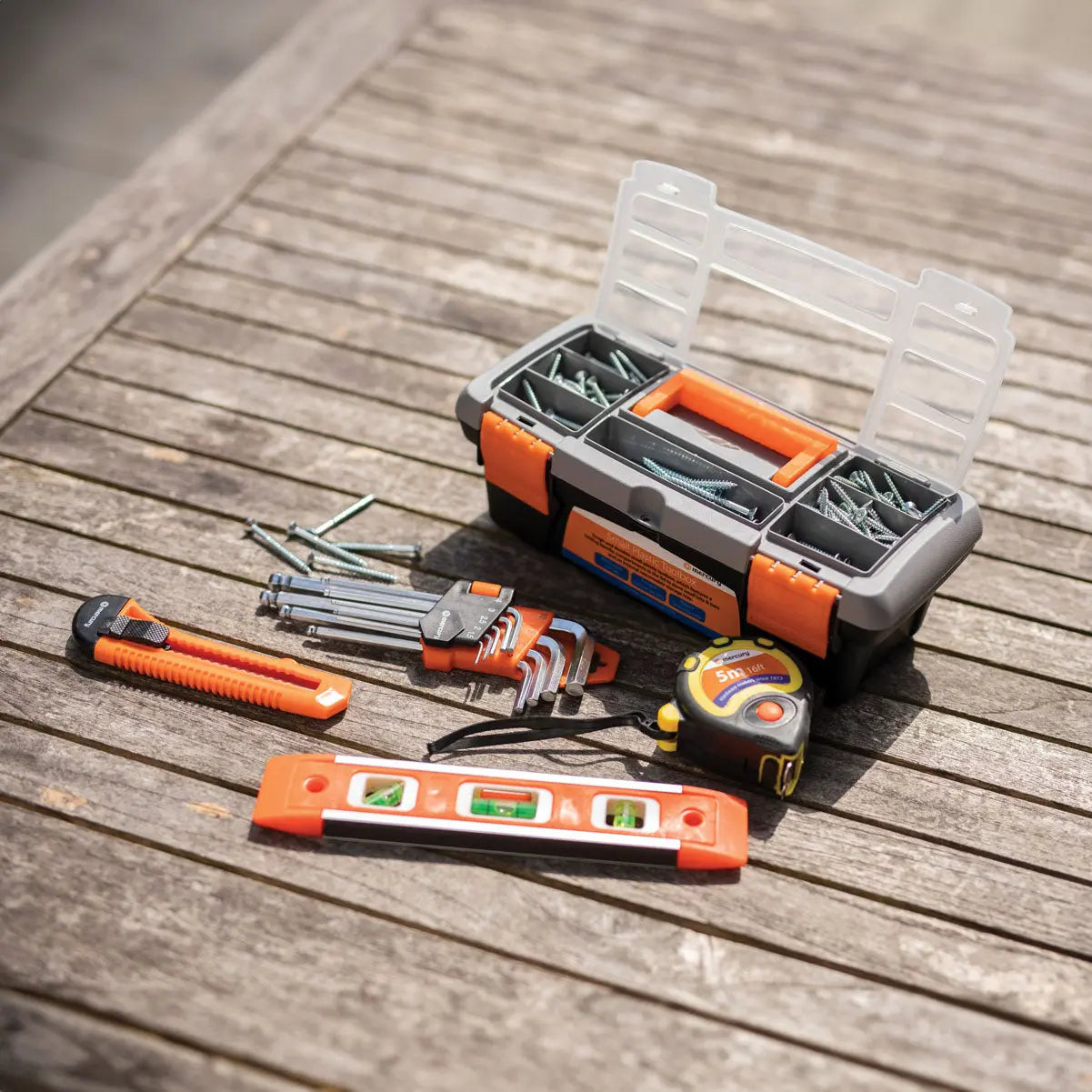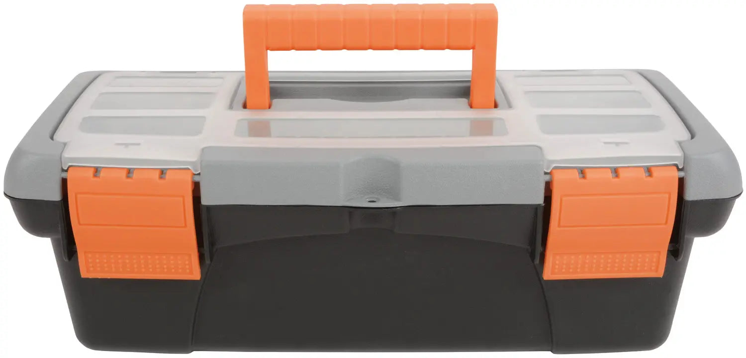 A compact yet versatile toolbox, ideal for storing small hand tools but equally suitable for fixings; fishing tackle; craft and hobby paraphernalia or sewing supplies. Made from tough, durable plastic, the hinged chassis features a top carry handle, robust fastening clips and an overlapping padlock eyehole between the chest and lid for added security. Small items can be stored within the multi-chambered lid, which has a transparent plastic top for clear sight of its contents. A removable tote tray within the main chest allows for further organisation and separation of items.