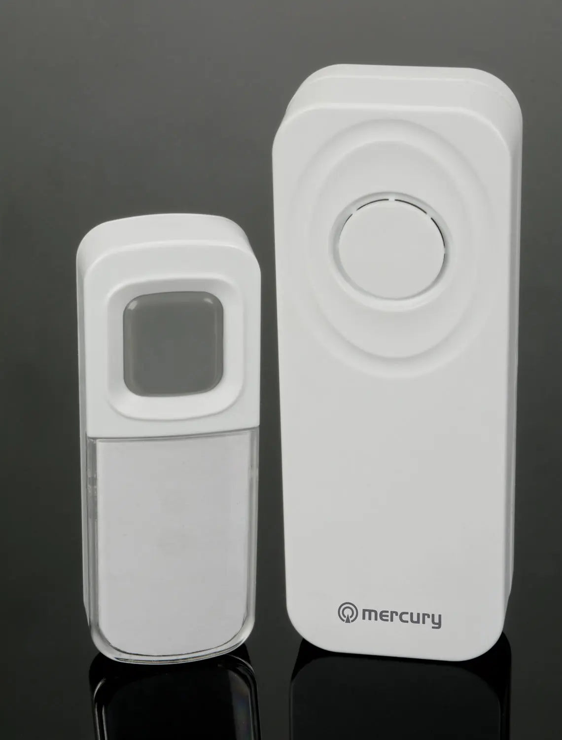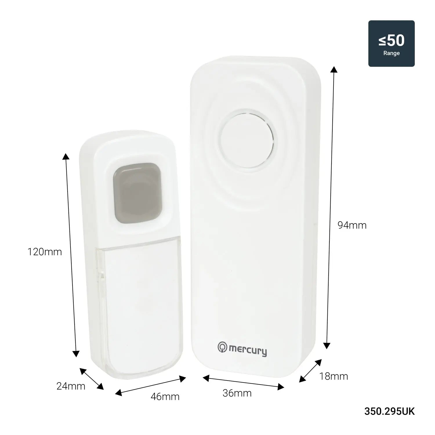 An understated, battery powered doorbell and portable chime with up to 50m wireless range. The IP54-rated waterproof push button simply installs against a door frame using the self-tapping screws provided. House numbers and names can be displayed on the removable name card, protected beneath a clear plastic cover. A simple ‘ding dong’ melody alerts users to visitors via a compact, lightweight chime that can be moved as required within a 50m operating range of the push button; ideal for large buildings and people with impaired hearing.