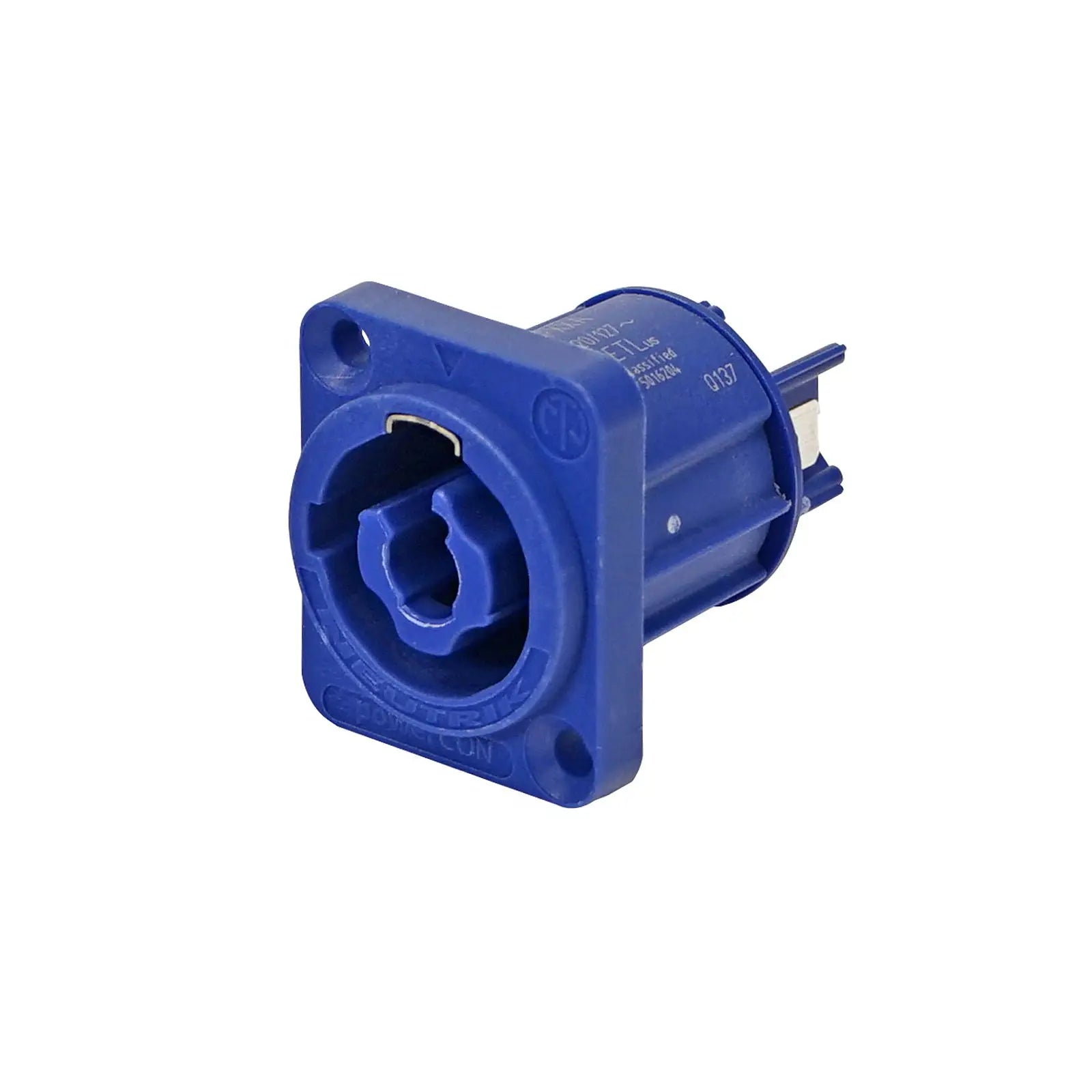 Chassis connector power-in 3/16' flat tab terminals blue. The powerCON is a locking 3 conductor equipment AC connector with contacts for line neutral and pre-mating ground contact. It replaces appliance couplers wherever a very rugged solution in combination with a locking device is needed in order to guarantee a safe power connection. Attention: The powerCON is a connector without breaking capacity i.e. the powerCON should not be connected or disconnected under load or live! Locking 20A / 250V AC appliance coupler 3 contacts for line neutral and premating safety ground Power-in (blue) and power-out (grey) versions with different keying to avoid the possibility of intermating Fast and easy twist lock latching system Extremely robust and reliable Ergonomic design User friendly latch design for easy handling Unique Neutrik chuck type strain relief UL cUL recognized components VDE certified SEV approved Branded with unique hologram - guarantees genuine and authentic Neutrik product