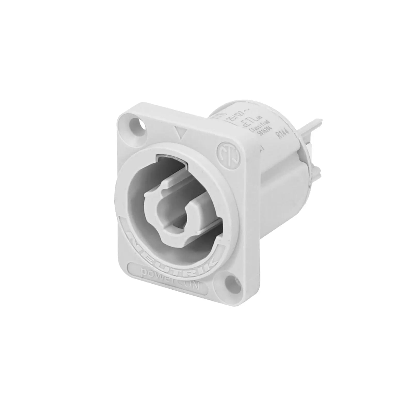 Chassis connector power-out 3/16" flat tab terminals grey.The powerCON is a locking 3 conductor equipment AC connector with contacts for line neutral and pre-mating ground contact. It replaces appliance couplers wherever a very rugged solution in combination with a locking device is needed in order to guarantee a safe power connection. Attention: The powerCON is a connector without breaking capacity i.e. the powerCON should not be connected or disconnected under load or live! Locking 20A / 250V AC appliance coupler 3 contacts for line neutral and premating safety ground Power-in (blue) and power-out (grey) versions with different keying to avoid the possibility of intermating Fast and easy twist lock latching system Extremely robust and reliable Ergonomic design User friendly latch design for easy handling Unique Neutrik chuck type strain relief UL cUL recognized components VDE certified SEV approved Branded with unique hologram - guarantees genuine and authentic Neutrik product
