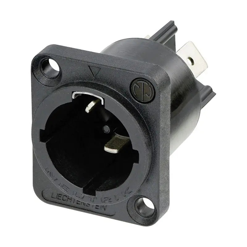 The powerCON TRUE1 TOP is a locking 16A true mains connector for indoor or outdoor applications. It replaces appliance couplers wherever a very rugged solution in combination with a locking device is needed in order to guarantee a safe power connection. The connector can be connected or disconnected under load or live ideal for use in the harsh and demanding environment applications of entertainment equipment like PA systems LED screens or lighting. Chassis mount power inlet connector 1/4" flat tab terminals Heavy-duty sealed power connector for harsh and demanding environment Outdoor protection according to IP65 and UL50E enclosure type 4 (in mated condition or in combination with the rubber sealing cover SCNAC-FPX) Uses high impact UV-resistant materials True mains connector with breaking capacity (CBC) Lockable 16A single phase connector (USA: 20A) Easy and reliable twist lock system Extremely robust and reliable Unique Neutrik cable retention ENEC certified according to IEC 60320