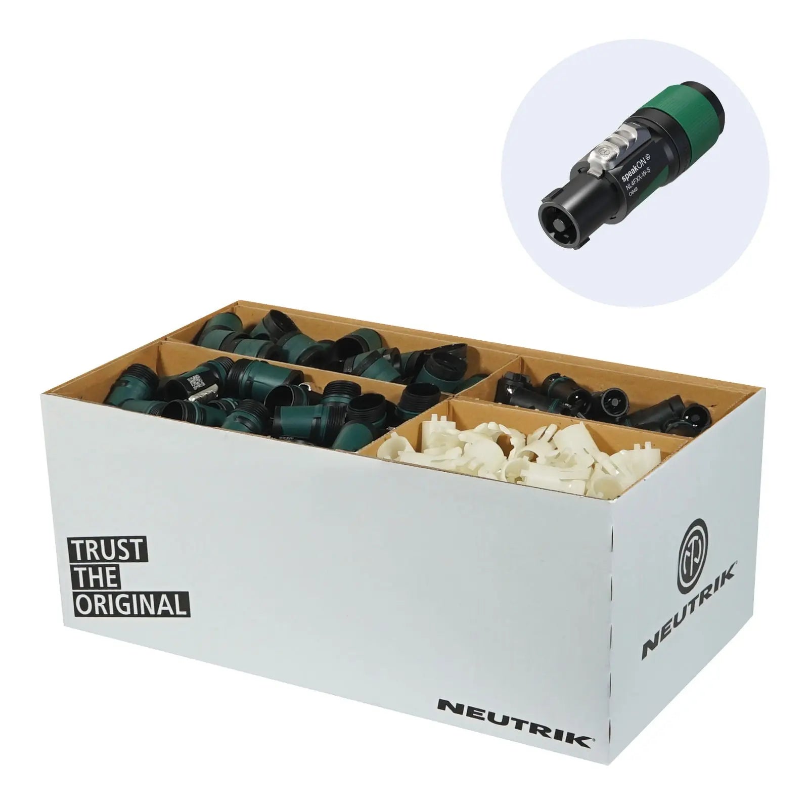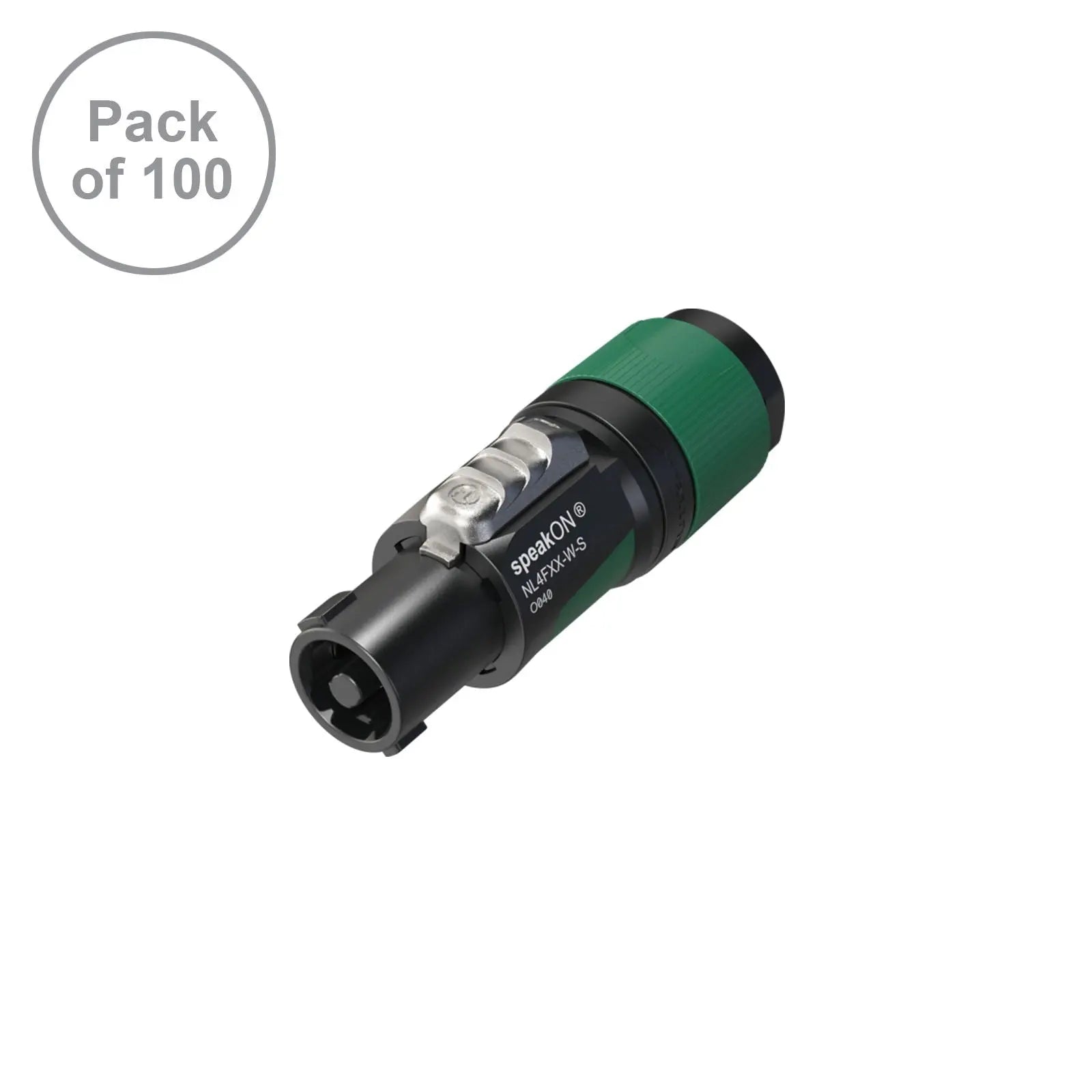 4 pole speakON connector screw terminal assembly chuck type strain relief for cable diameters 6 to 12mm. Neutrik speakON connectors are the industry-standard for loudspeaker connections. This product series offers extremely reliable and robust cable connectors with a proven twist lock system. speakON cable connectors feature solid contacts with screw-type terminals including a stranded wire protection Manufacturers part code: NL4FXX-W-S-D Disassembled pack of 100 Mates with 4-Pole chassis connectors Ergonomic design with slip-proof two-component moulded housing Up to 37A rms current rating Unique Neutrik locking bushing and strain relief for cable diameters 6 mm to 12 mm IEC 61984 certified thus accepted as a component of equipment acc. to IEC 62368-1 Superior NEUTRIK quality standard extremely robust and reliable Easy and reliable twist lock system Easy to assemble because the strain relief locks with the insert mechanically and aligns with the housing Improved kink protection by two-component bushing