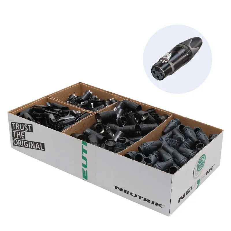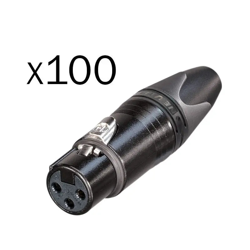 The next generation of the worldwide accepted standard of XLR cable connectors. The successor of the X series offers several new features which make it more reliable easier to assemble and improves contact integrity as well cable strain relief. Disassembled pack of 100 3 pole female cable connector with black metal housing and gold contacts Unique cage design of female contact for low contact resistance and high integrity Female contact incorporates a solder barrier to prevent solder running into the contact mating area Female connector with improved solid metal latch Additional ground spring contacts for better shell ground continuity Improved chuck type strain relief Polyurethane gland gives high protection to cable bending stresses Rugged zinc diecast shell long lasting and dependable Internal thread on shell is well protected against any damage Branded with unique hologramguarantees genuine and authentic Neutrik product