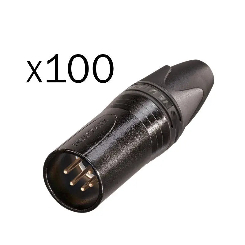 The next generation of the worldwide accepted standard of XLR cable connectors. The successor of the X series offers several new features which make it more reliable easier to assemble and improves contact integrity as well cable strain relief. Disassembled pack of 100 5 pole male cable connector with black metal housing and gold contacts Male connector with improved locking recess without "window" more stringent housing increases durability Additional ground spring contacts for better shell ground continuity Improved chuck type strain relief Polyurethane gland gives high protection to cable bending stresses Rugged zinc diecast shell long lasting and dependable Internal thread on shell is well protected against any damage Branded with unique hologram - guarantees genuine and authentic Neutrik product