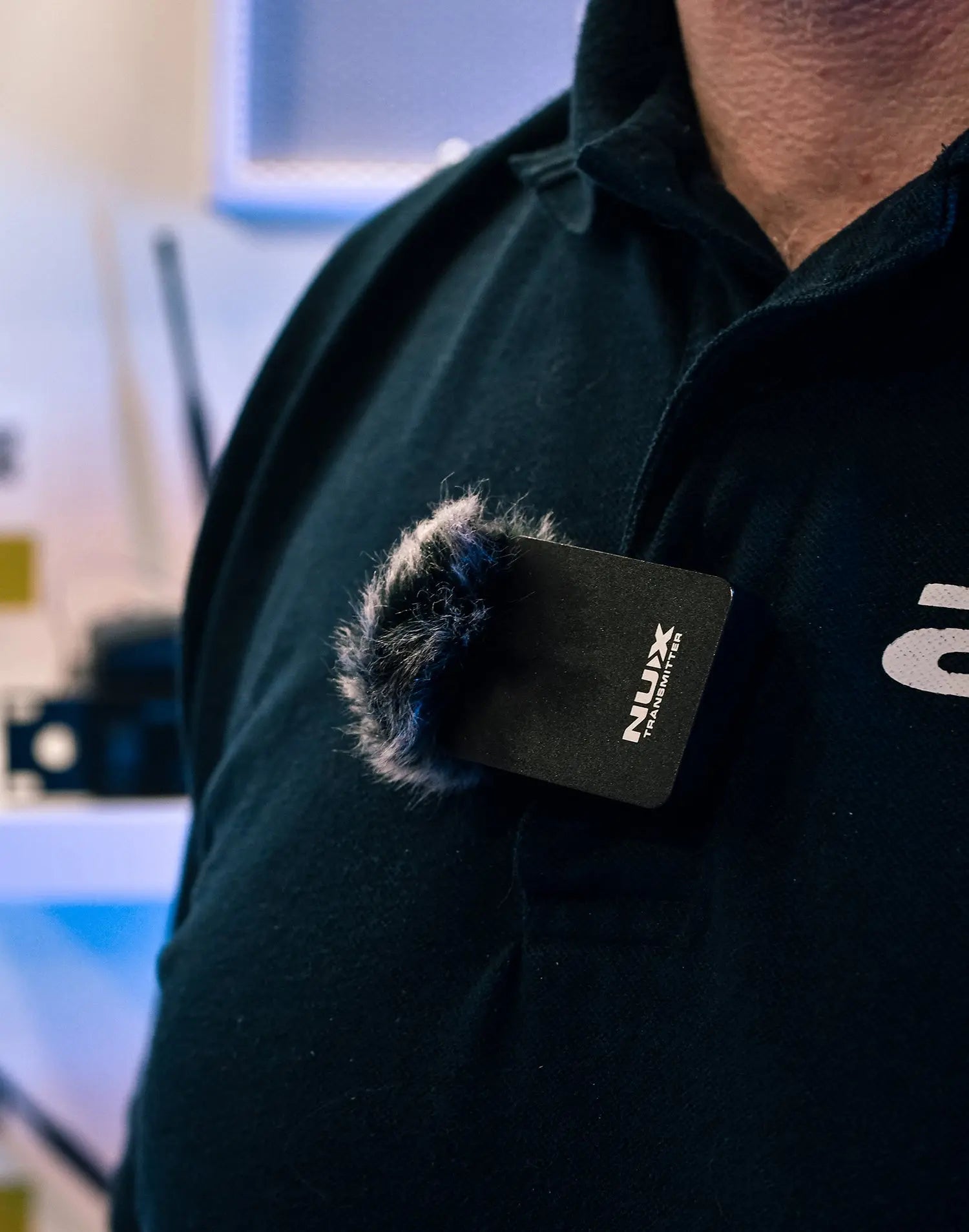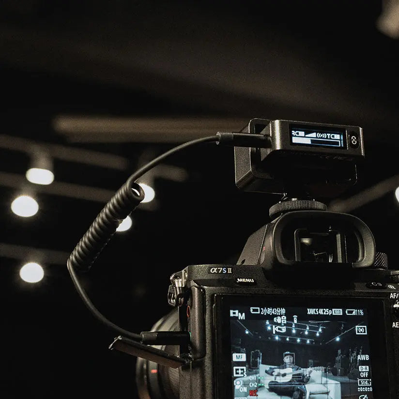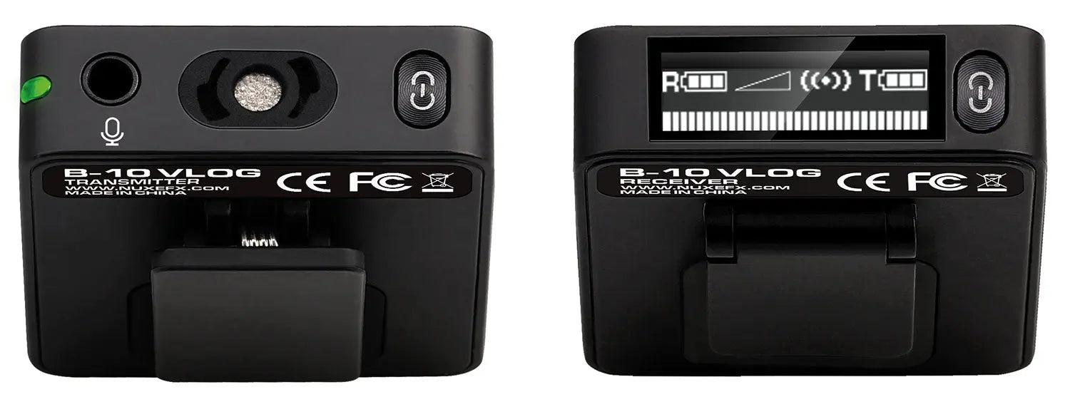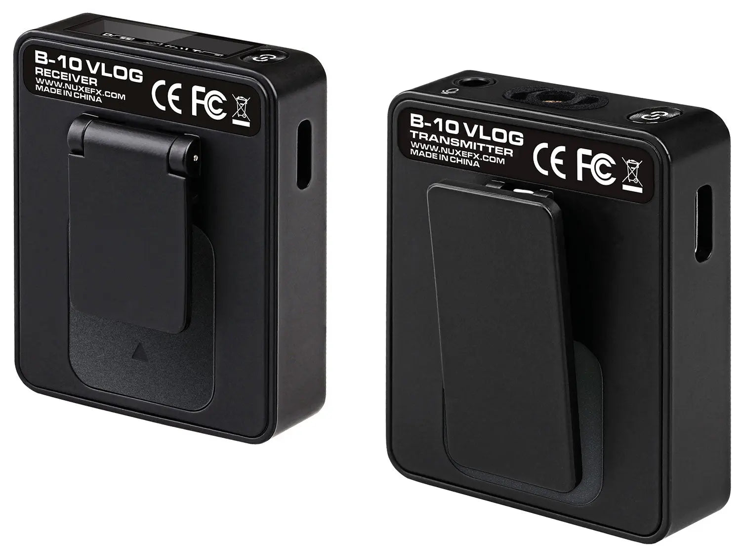 B-10 is a compact and convenient wireless microphone system comprising a USB rechargeable transmitter and receiver with a complete set of connecting leads and accessories. The system operates on the license-free 2.4GHz band with intelligent frequency-hopping technology, providing a stable wireless connection. The transmitter has an integral omni-directional microphone and can clip onto clothing for use as a lavalier microphone, and also has a 3.5mm input for a separate microphone is preferred. The receiver also has a spring clip and is supplied with a cold shoe mount for connecting directly to a camera or photographic stand. The top of the receiver has an OLED display for charge and signal status and the 3.5mm output jack can feed headphones or into the camera or smartphone audio inputs. Designed for vloggers or as a discreet lavalier microphone system for presenters and performers alike.