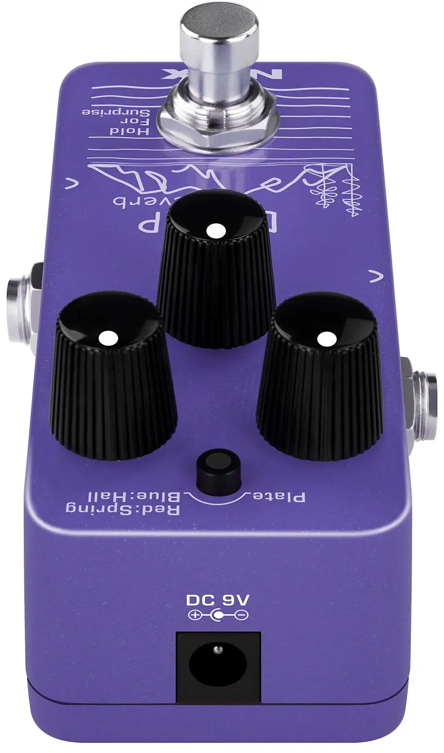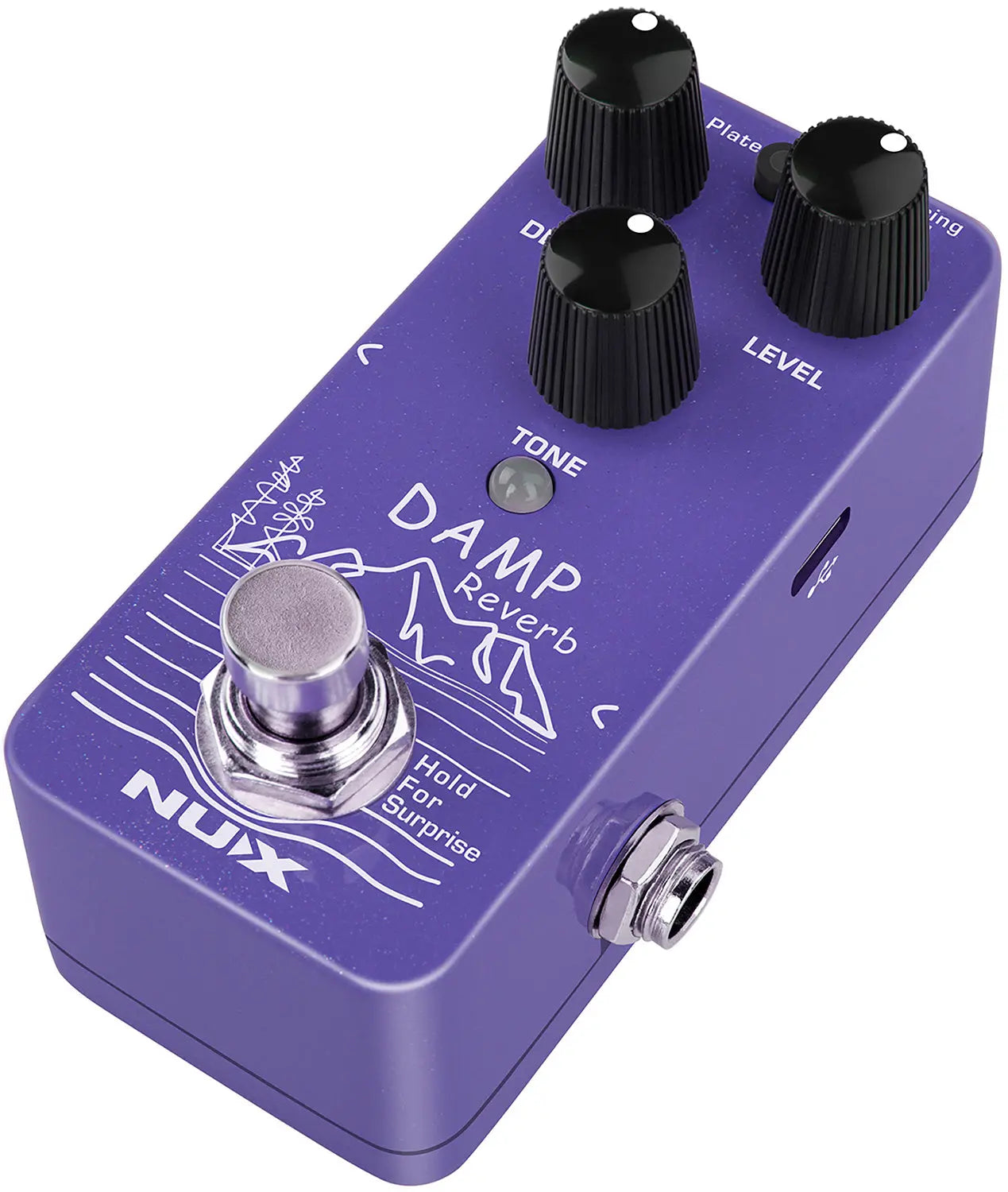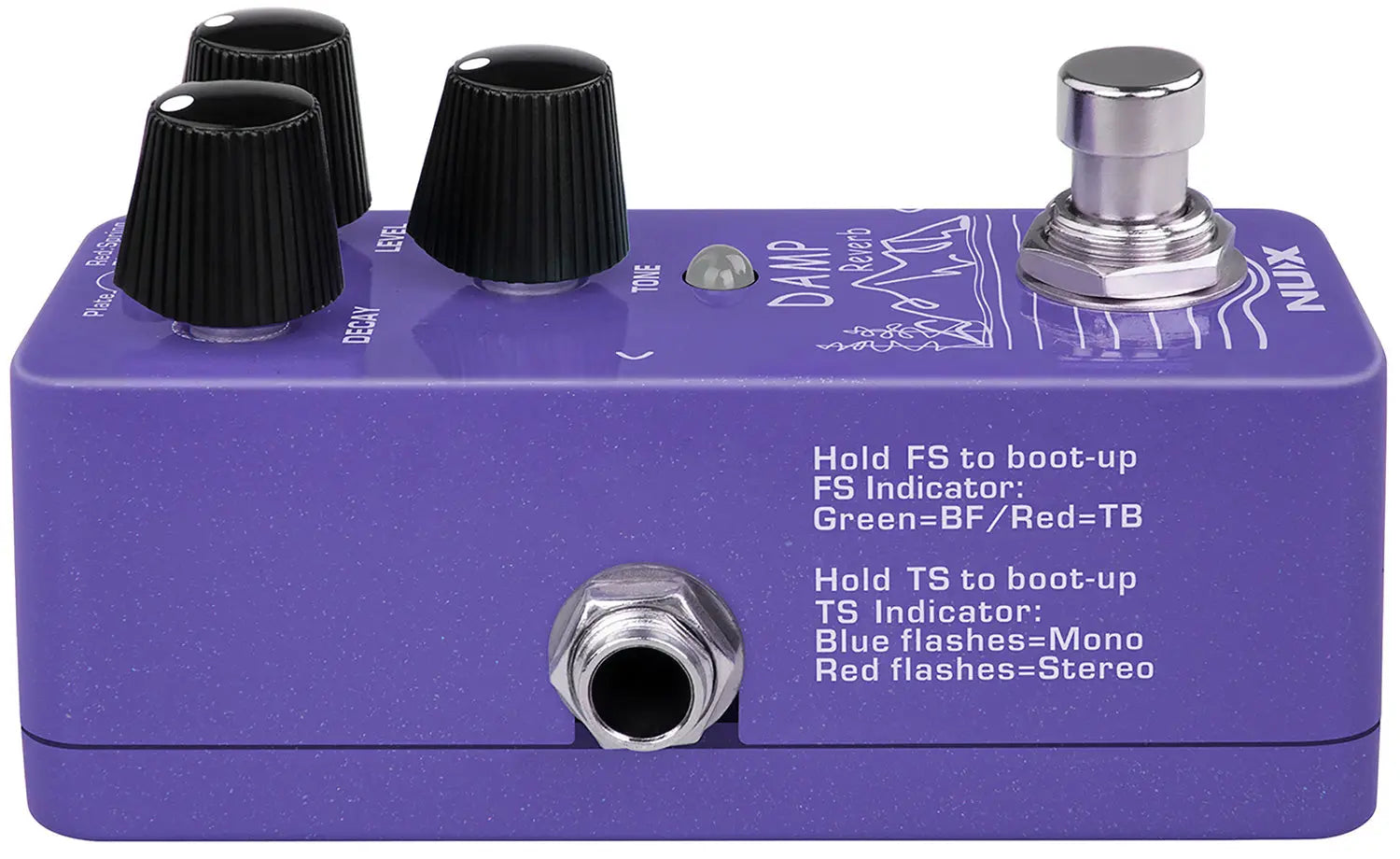 Damp is the name given to this miniature digital reverb pedal to describe the immersive sound image provided by its 3 inbuilt reverb models. A choice of Spring, Plate or Hall reverberation types can be selected by the illuminated push button at the top of the pedal. Holding this button down during power-up selects between mono output or stereo output, which requires a stereo jack lead. Three rotary controls adjust Decay, Level and Tone settings as required. Pressing the footswitch activates or deactivates the effect, whilst holding this pedal enables a secondary effect - Shimmer in Plate mode or Freeze in Spring or Hall modes. The Damp pedal is versatile enough to cover a wide range of reverb styles with a minimal footprint on guitarists' pedalboards or for patching into an effects loop for other instruments or even vocals.