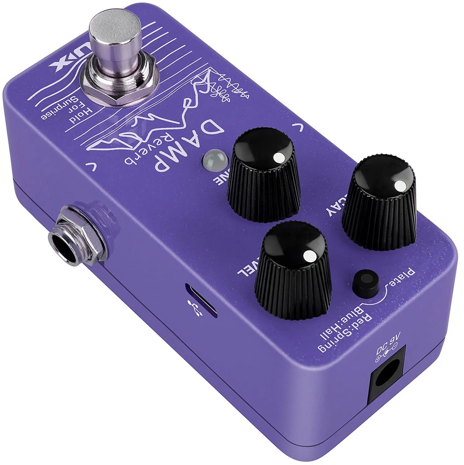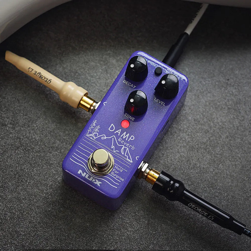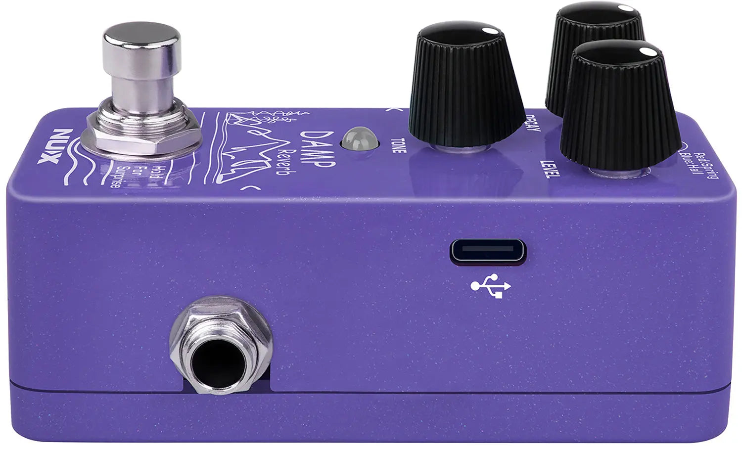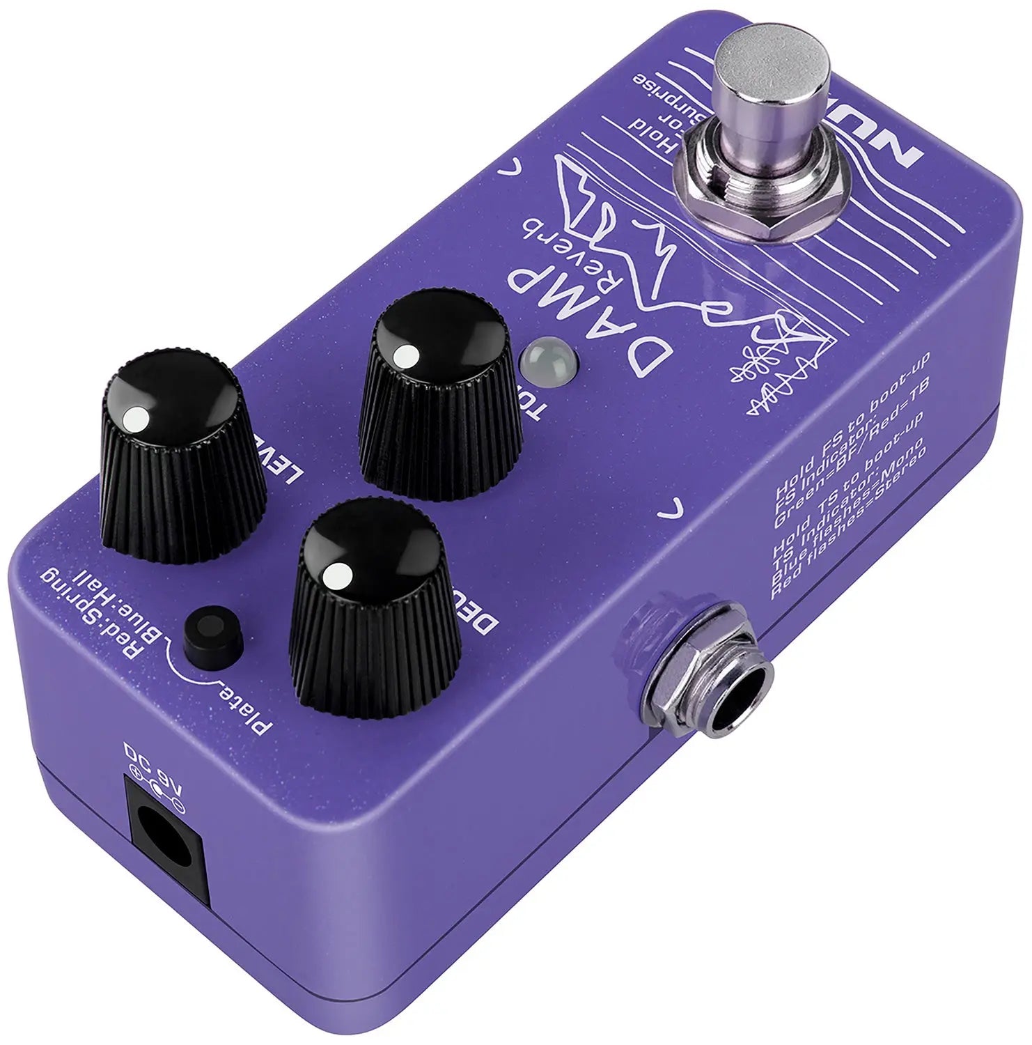 Damp is the name given to this miniature digital reverb pedal to describe the immersive sound image provided by its 3 inbuilt reverb models. A choice of Spring, Plate or Hall reverberation types can be selected by the illuminated push button at the top of the pedal. Holding this button down during power-up selects between mono output or stereo output, which requires a stereo jack lead. Three rotary controls adjust Decay, Level and Tone settings as required. Pressing the footswitch activates or deactivates the effect, whilst holding this pedal enables a secondary effect - Shimmer in Plate mode or Freeze in Spring or Hall modes. The Damp pedal is versatile enough to cover a wide range of reverb styles with a minimal footprint on guitarists' pedalboards or for patching into an effects loop for other instruments or even vocals.