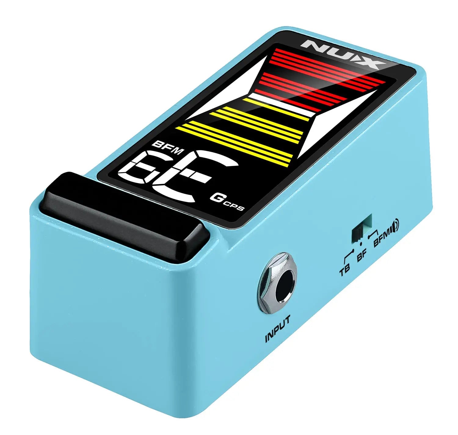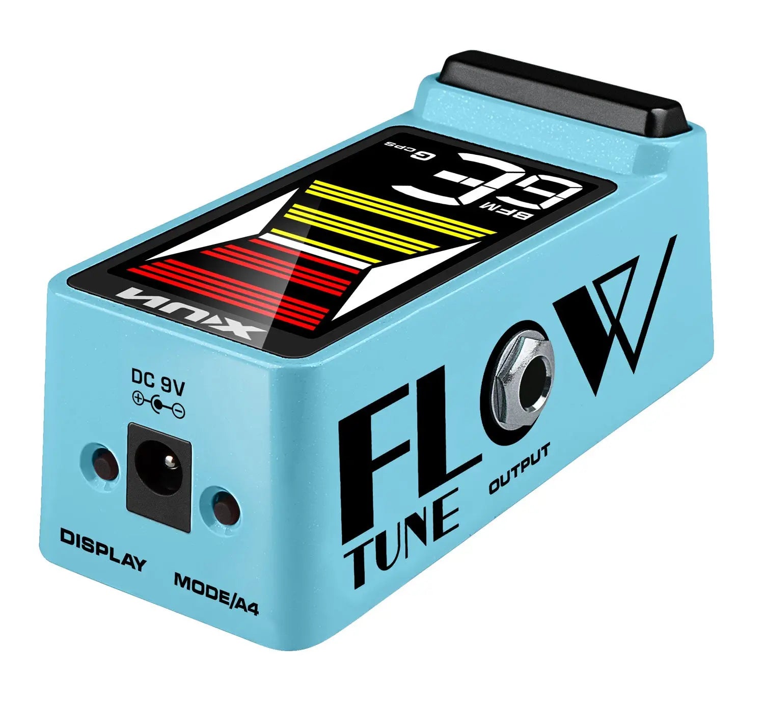Mini Core style guitar and bass pedal tuner with large HD colour diplay for easily visible tuning status. The signal throughput can be set to true-bypass (TB) or buffered (BF) where the output is muted during tuning. An additional buffered mode (BFM) keeps the output unmuted during tuning to keep showing tuner status whilst playing live. Three different display modes can be selected, including a strobe simulation. Modes for Guitar, Bass or Chromatic tuning can be selected and holding the same button allows A4 tuning frequency to be set. Overall, an ultra-compact yet rugged pedal tuner with maximum display for stage performances.
