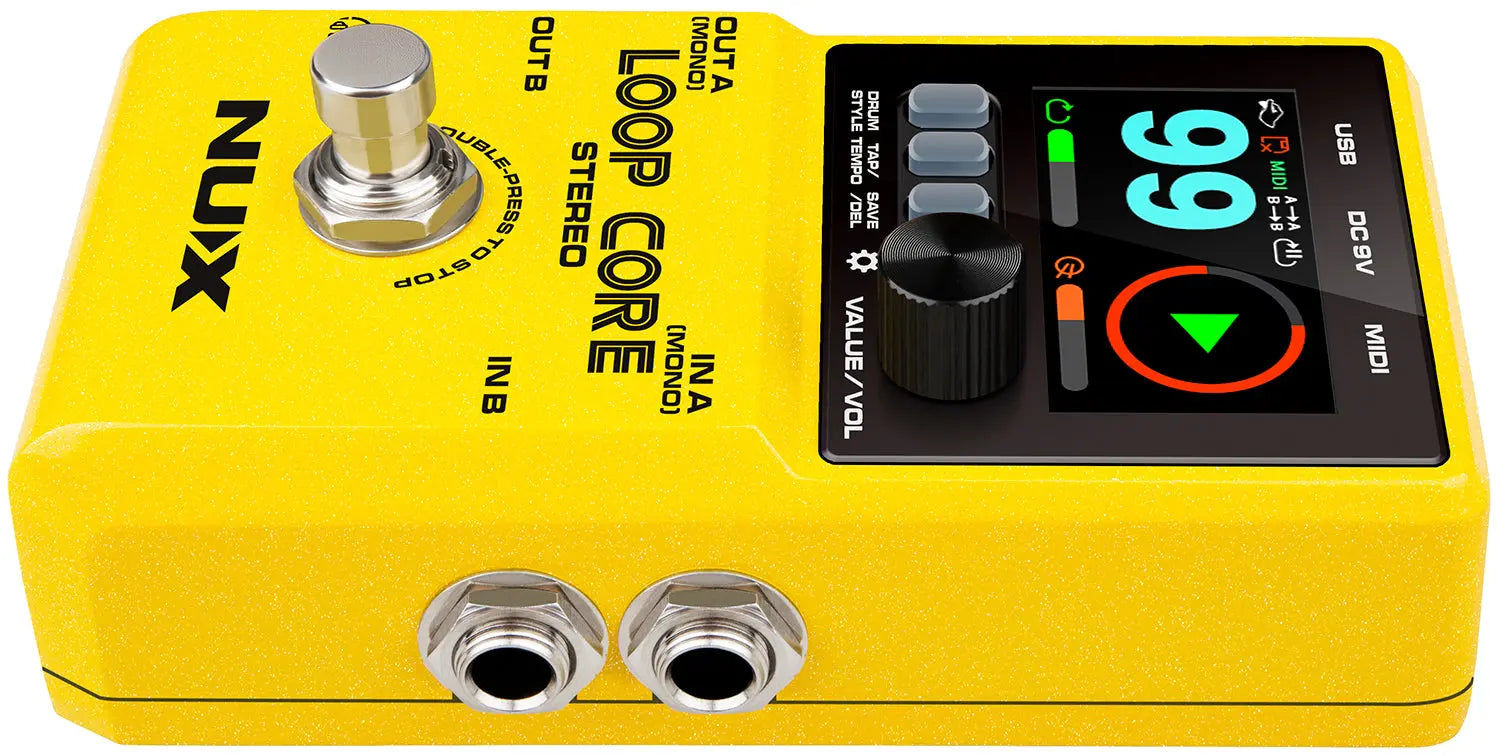 Next generation looper pedal with a high-definition colour LCD display, stereo inputs/outputs, and optional MIDI control. Loop Core Stereo allows you to create up to 6 hours of music phrases, save them in one of 99 provided memory slots, and play back as stereo loops or even backing tracks. 50 internal drum patterns can also be selected from for rhythm backing. Signal path can be mono, true stereo, split stereo (loop / drum machine) or direct to mixer (with cabinet simulation). A headphones output completes the package for silent loop practice or personal monitoring. A comprehensive looping machine in a standard compact pedal format.