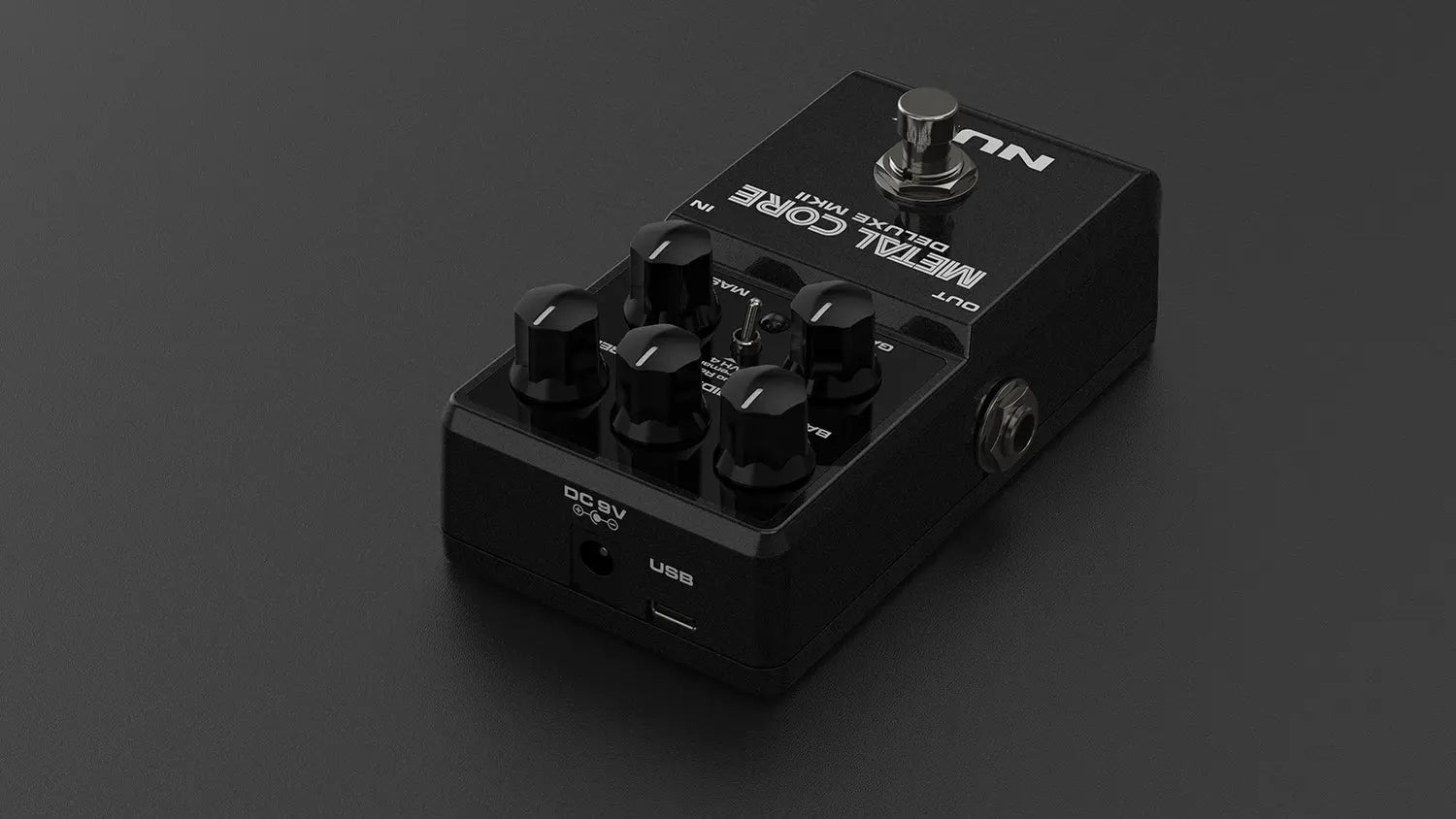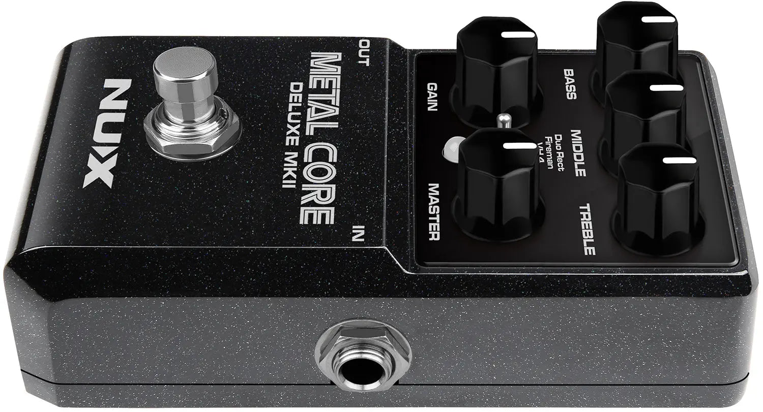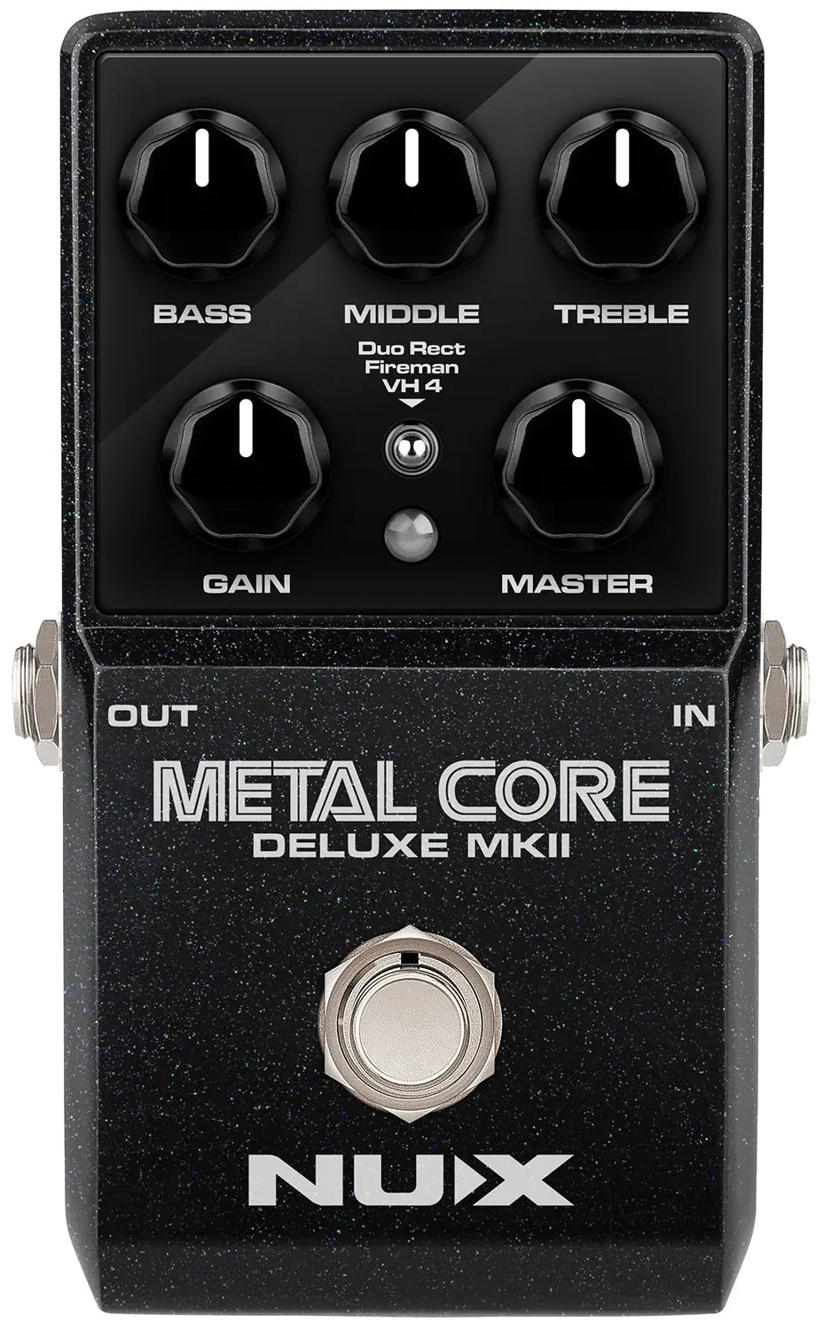 Evolving from the popular Metal Core Deluxe pedal, the mkII version now has 3 selectable amplifier models based on much-revered high gain valve amplifiers. Now with an additional Middle control, the 3-band EQ pairs with Gain and Master to offer a full completement of real amplifier controls, with settings stored into each of the 3 amp models for fast recall. Metal Core Deluxe mkII goes a step further to include IR cabinet simulation, meaning that it can be used directly into a full-range PA system, or without IR simulation into the front of a guitar amplifier as a hard-edged drive pedal. Whichever wiring method is used, Metal Core Deluxe mkII delivers the full breadth of metal tones for hard rock to thrash.