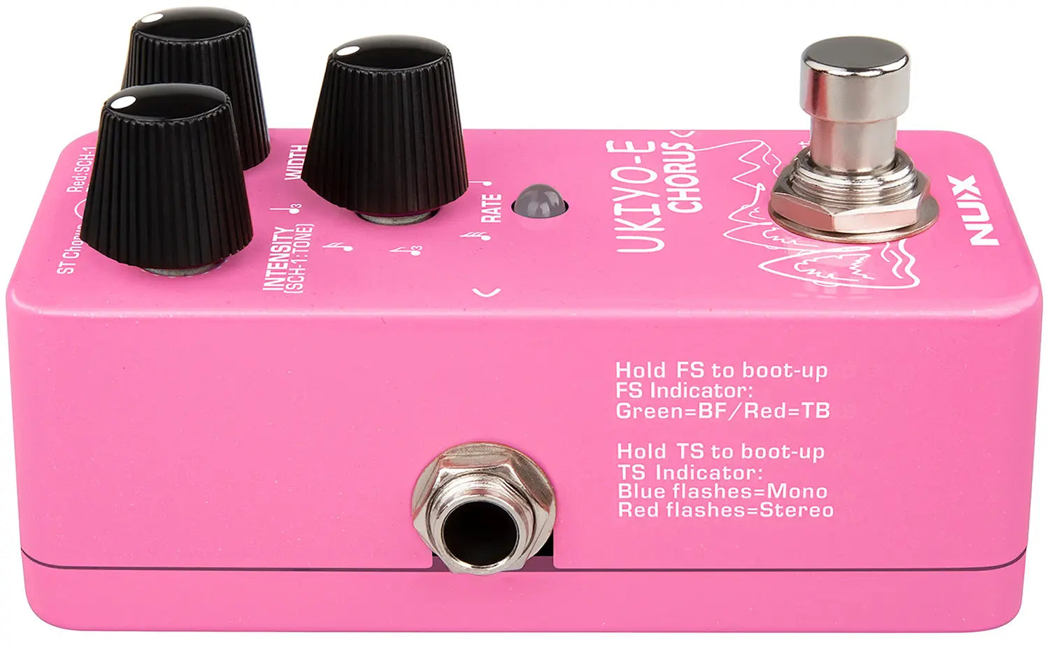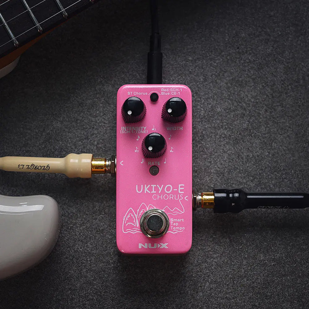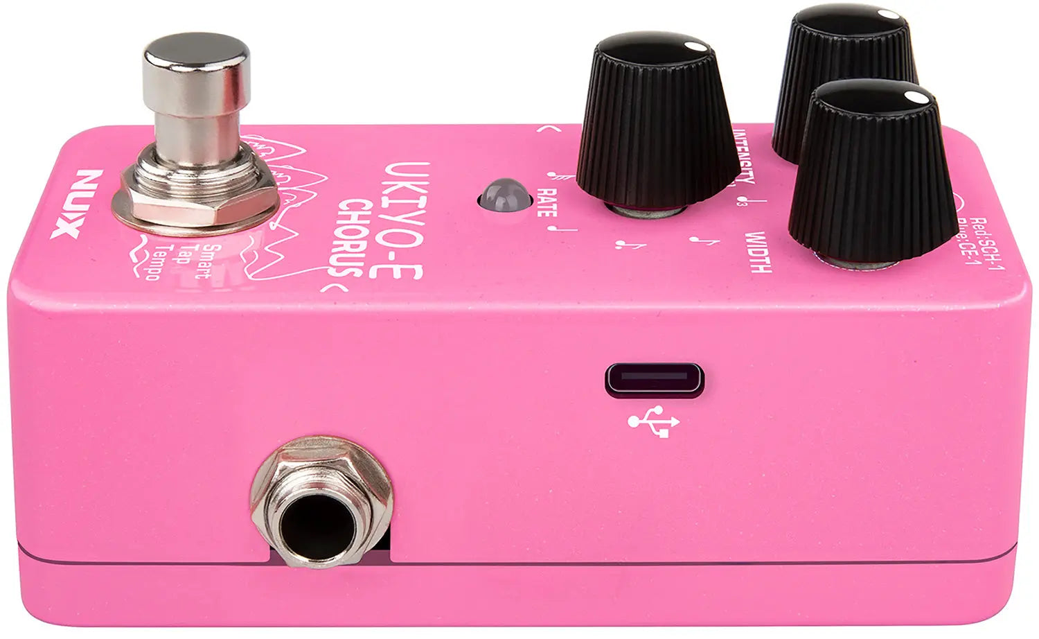 Ukiyo-E translates from Japanese as "pictures of the floating world", describing the dreamscape-type sounds created by 3 classic chorus pedals that this unit emulates. ST Chorus is modelled on a rock classic stereo chorus pedal, SCH-1 delivers a true-to life emulation of a much-revered classic pedal from Japan and CE-1 is the grand patriarch of all chorus effects, emulating the soft analog tones of the first mass production chorus effect. All 3 are selected by an illuminated push button above the controls. Holding this button down during power-up selects between mono output or stereo output, which requires a stereo jack lead. Controls include Rate, Width and Intensity to adjust each effect as required, Pressing the footswitch engages or disengages the effect. The smart tap tempo feature means that the pedal recognises pressing the footswitch twice or in a short space of time and responds to the timing as a tap tempo function to adjust the rate setting. Perfect for chordal washes and adding jangle to strummed or picked passages.