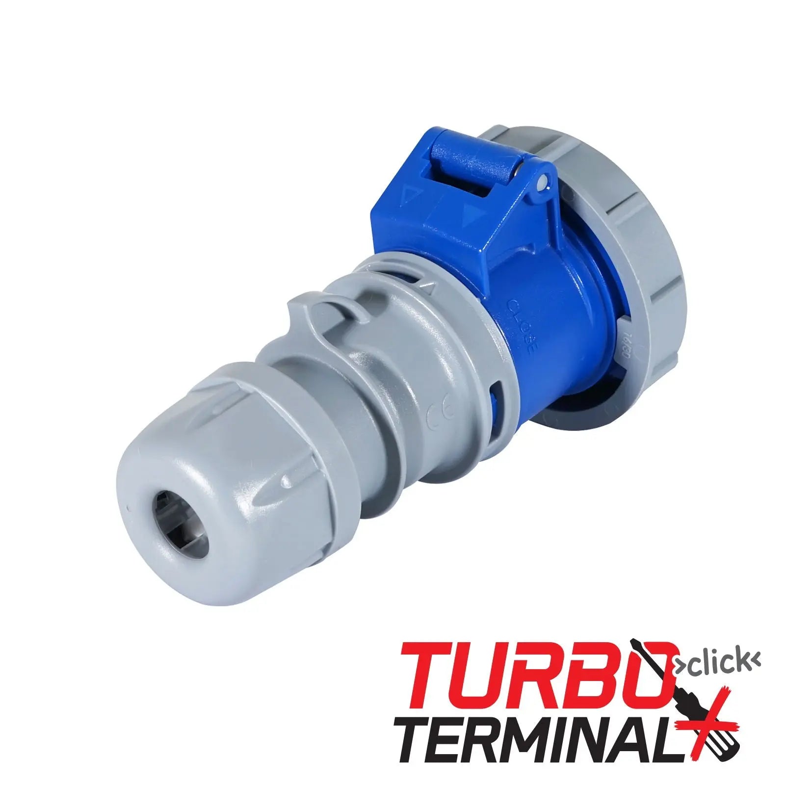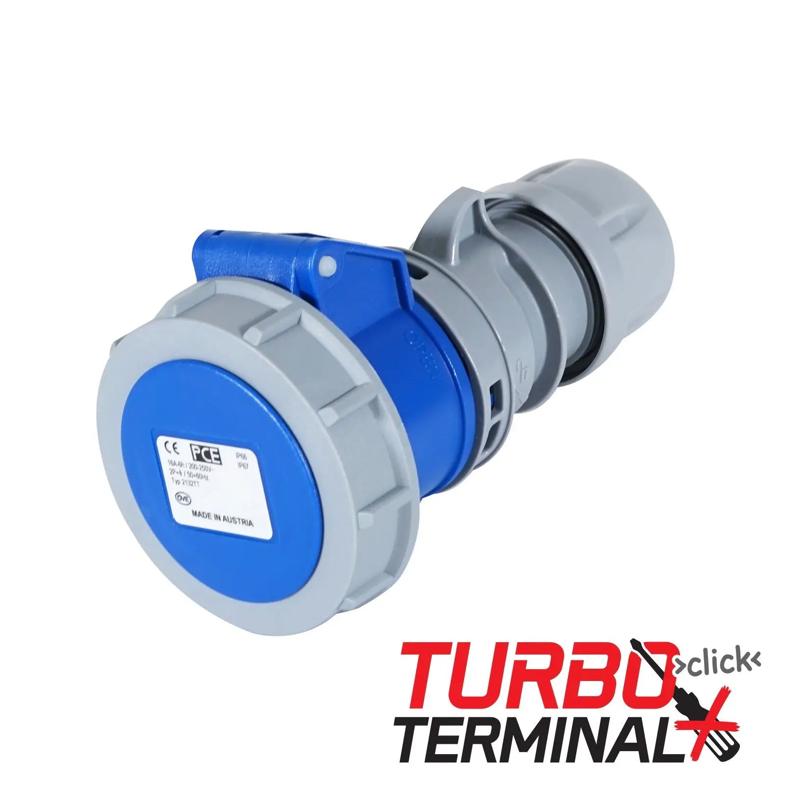 16A IP67 rated CEE-type cable socket suitable for power connections in the event and rental industry. Internal connections are made using the PCE Turbo Terminals a spring loaded connection designed for speed of assembly while delivering constant pressure for trouble free continuity. Turbo Terminals - Screwless terminals for rapid assembly Polyamide 6 body offers excellent impact resistance High abrasion resistance Multi-ramp quick lock body closure system Twist grip cable gland IP67 rated Made in the EU Grey body blends into lighter coloured environments better than all black or all blue connectors