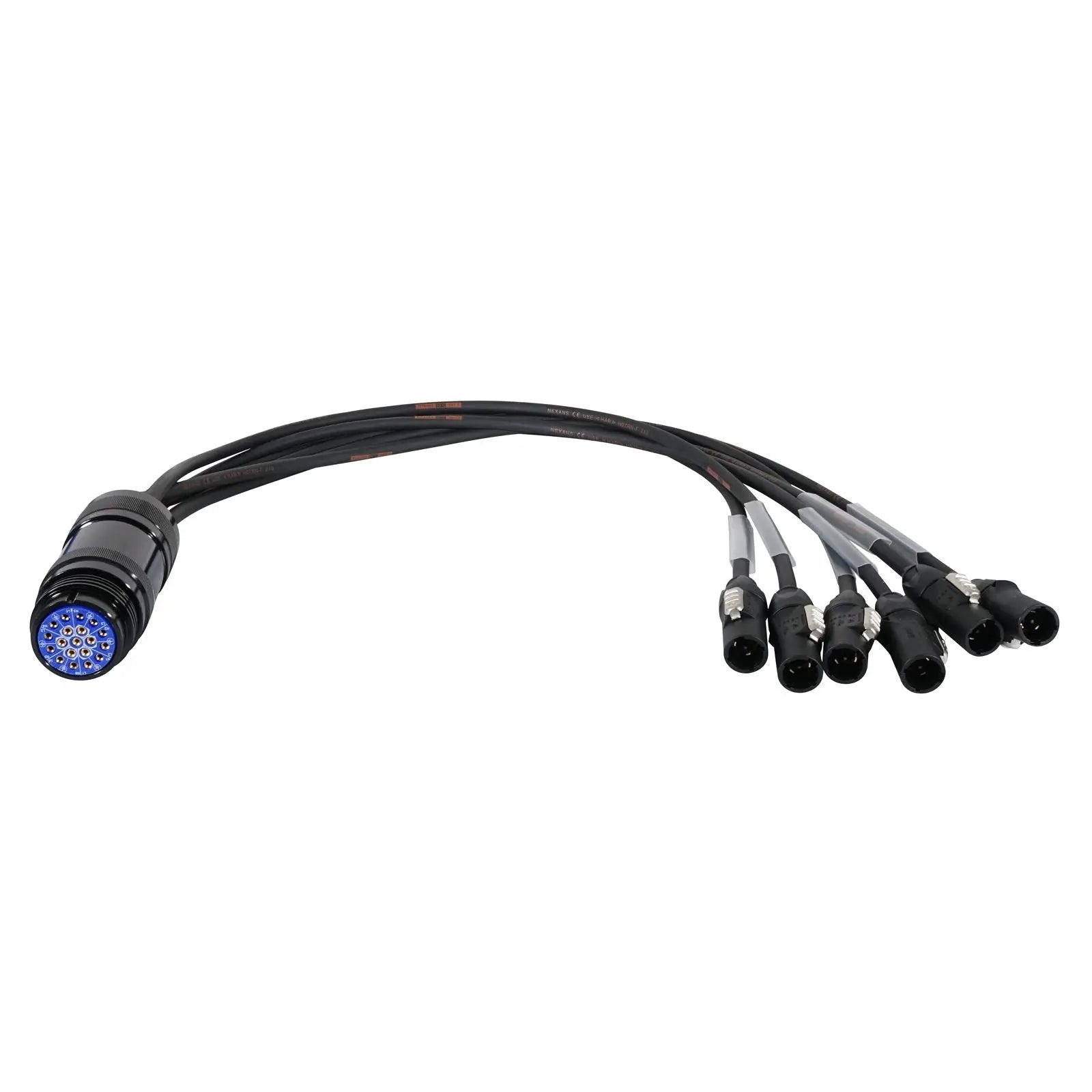 High quality rental-ready Socapex fan in cable made in Britain from Titanex H07RN-F cable and Elumen8 Showsafe 19-Pin UL certified Socapex connectors. The cables are finished with a short length of clear heatshrink ready for identification or asset label and each tail is numbered to aid circuit identification. Made in Britain Titanex H07RN-F 1.5mm cable Elumen8 Showsafe 19-Pin connectors complete with 6-way cable gland 6 x Neutrik NAC3MX-W-TOP powerCON TRUE1 connectors Clear heatshrink suitable for identification or asset label Oil resistant and flame retardant according to IEC/EN 60332-1-2 standard Chemical resistant cross-linked elastomer insulation Bare copper conductors Operating temperature range: -25 to 55°C Maximum conductor temperature in service: 90°C Amphenol Socapex SL419 compatible IP67* ingress protection when mated (*Socapex end) FMLB (first make last break) earth contacts Multi-point gold plated contacts Individual tail length: 1m