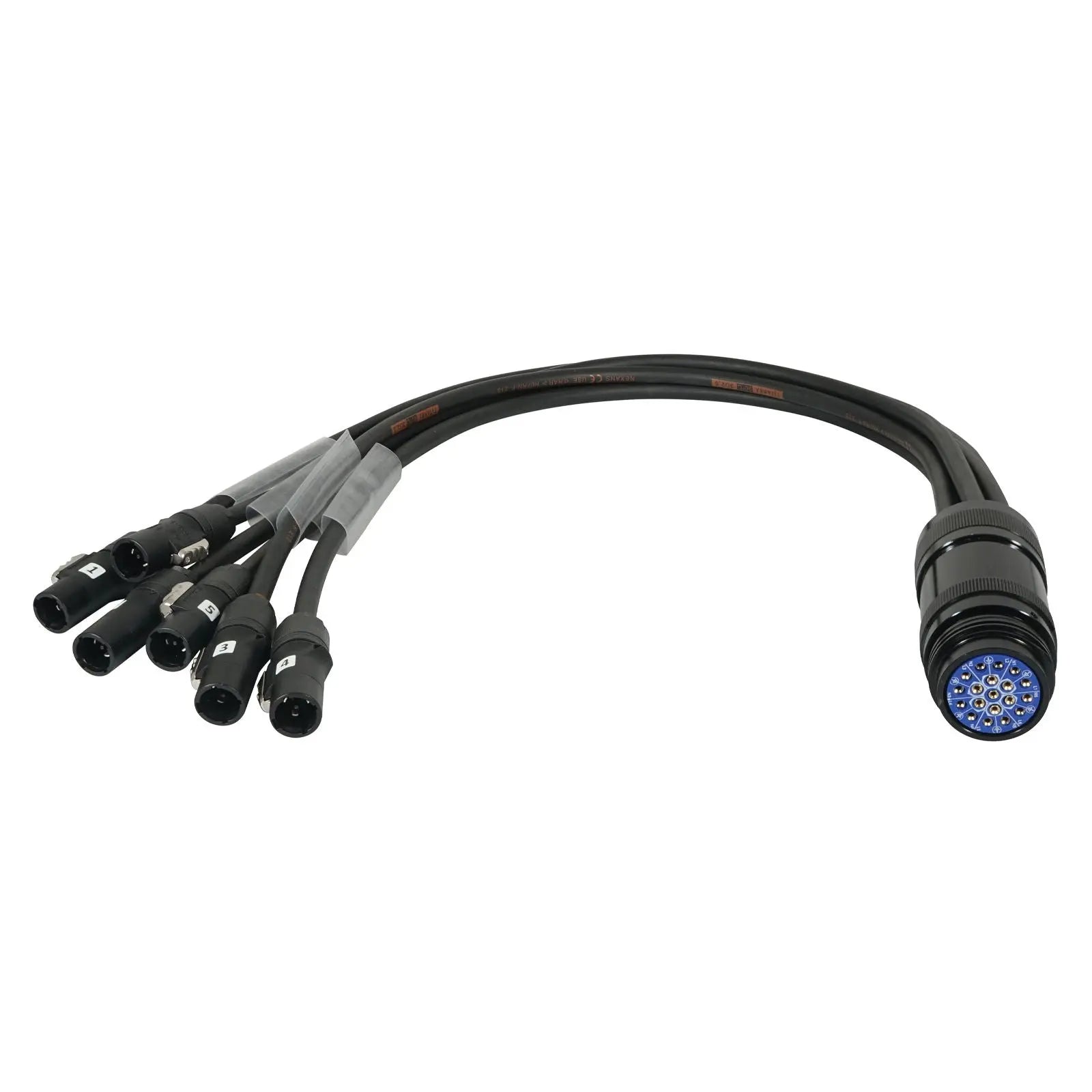 High quality rental-ready Socapex fan in cable made in Britain from Titanex H07RN-F cable and Elumen8 Showsafe 19-Pin UL certified Socapex connectors. The cables are finished with a short length of clear heatshrink ready for identification or asset label and each tail is numbered to aid circuit identification. Made in Britain Titanex H07RN-F 2.5mm cable Elumen8 Showsafe 19-Pin connectors complete with 6-way cable gland 6 x Neutrik NAC3MX-W-TOP powerCON TRUE1 connectors Clear heatshrink suitable for identification or asset label Oil resistant and flame retardant according to IEC/EN 60332-1-2 standard Chemical resistant cross-linked elastomer insulation Bare copper conductors Operating temperature range: -25 to 55°C Maximum conductor temperature in service: 90°C Amphenol Socapex SL419 compatible IP67* ingress protection when mated (*Socapex end) FMLB (first make last break) earth contacts Multi-point gold plated contacts Individual tail length: 1m