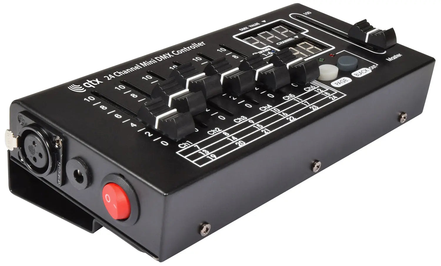 Easy to set up and operate this 24 channel mini DMX controller is ideal for less experienced users or smaller functions and events. 2 bright and clear LED displays show both the channel number and value at the same time making the accurate control of fixtures a breeze. 6 channel sliders combine with a 4-way page selector and LED panel for simple range selection and a Blackout button is also included for fast shut off of fixtures when required.