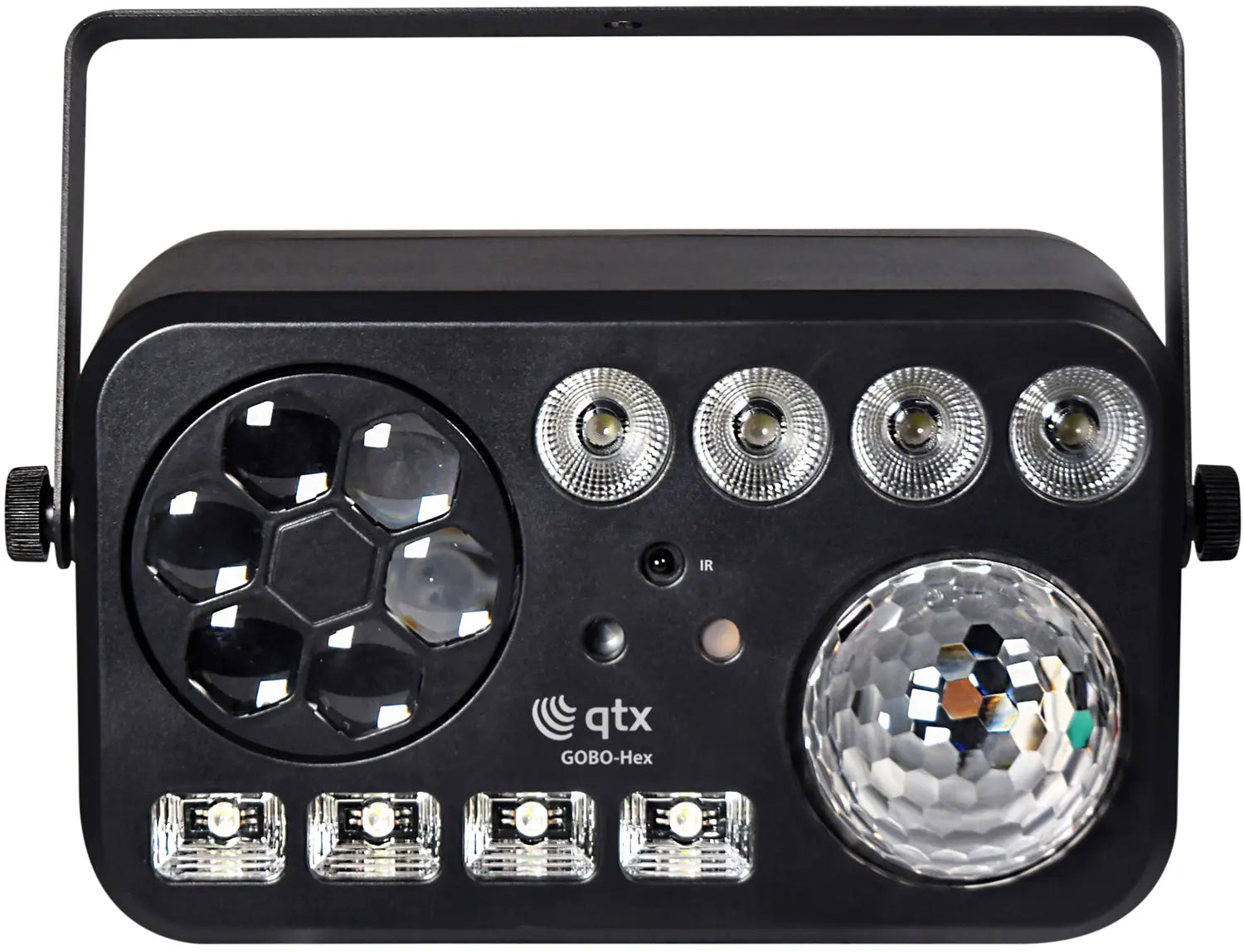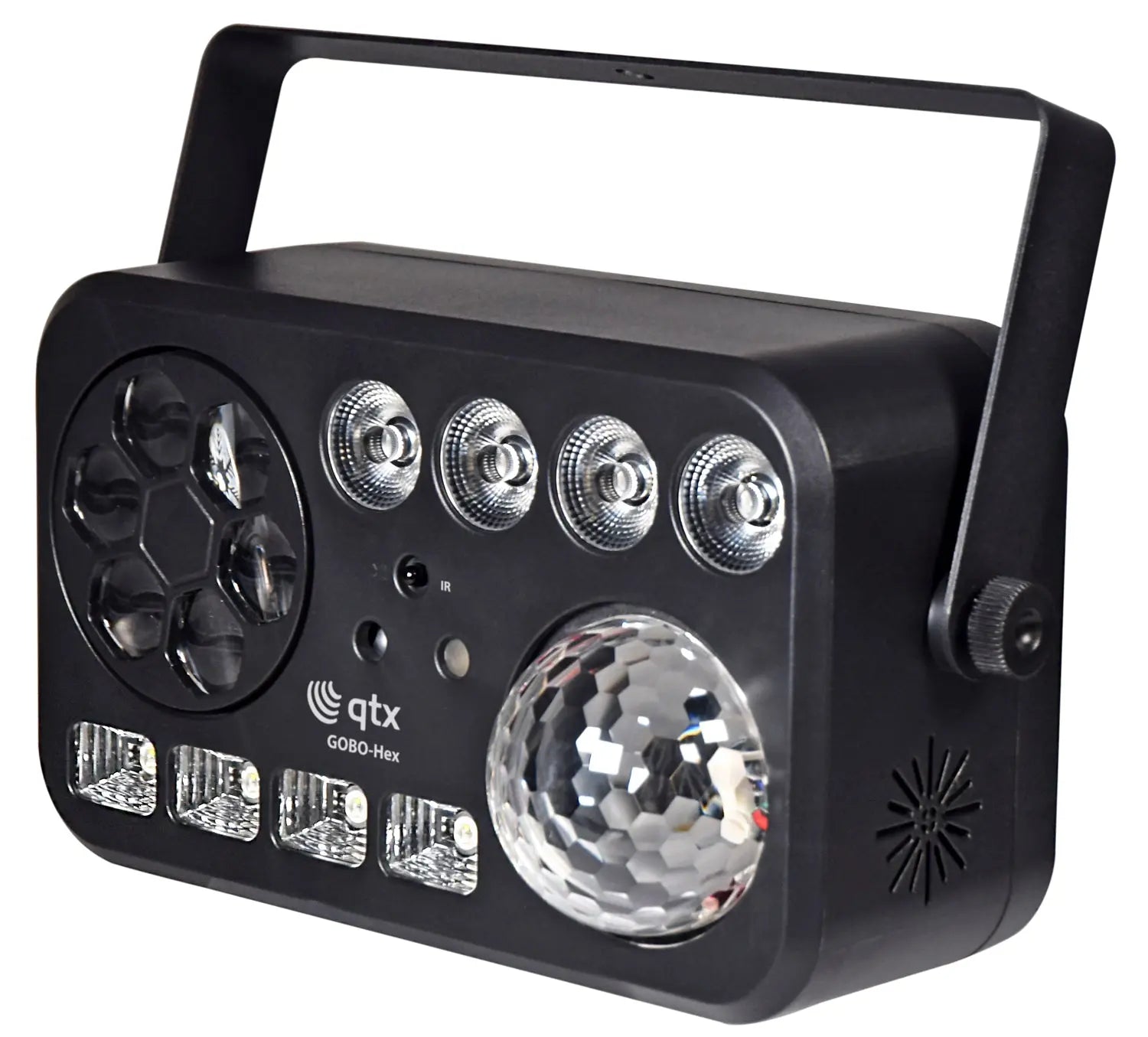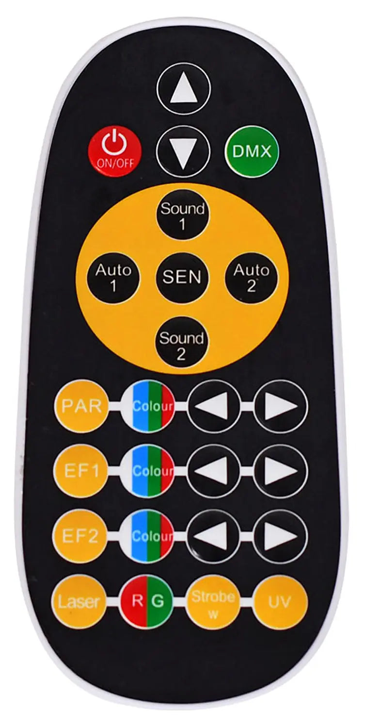 A lightweight 6-in-1 light effect combining a range of colourful GOBOs, 10W RGBW magic ball, 4x White Strobe/UV LEDs, 4x 4W RGBW PARs and Dual colour Laser in one convenient fixture. Easy to setup and use via an array of integrated automatic programs or sound to light. More precise control is provided via either 16-channel DMX connection or the included IR remote control.