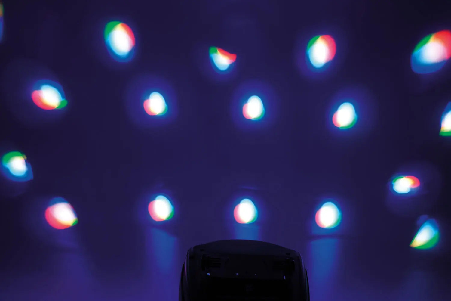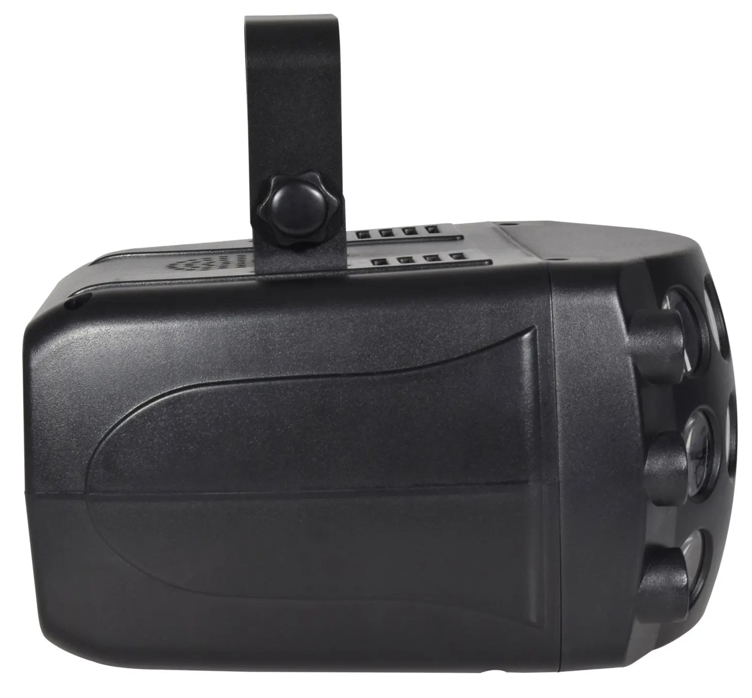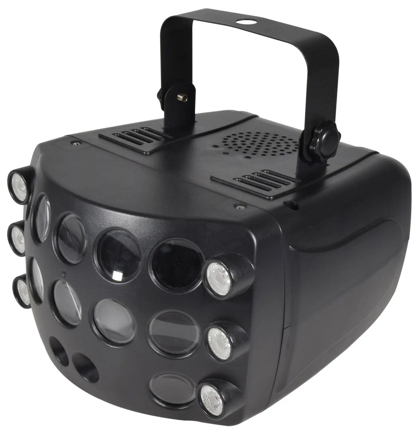 A compact 3-in-1 light effect combining a colourful butterfly effect, 6x 1W RGB PARs and Dual colour Laser in one convenient fixture. Easy to setup and use via an array of integrated automatic programs or sound to light. More precise control is provided via either 13-channel DMX connection or the included IR remote control.