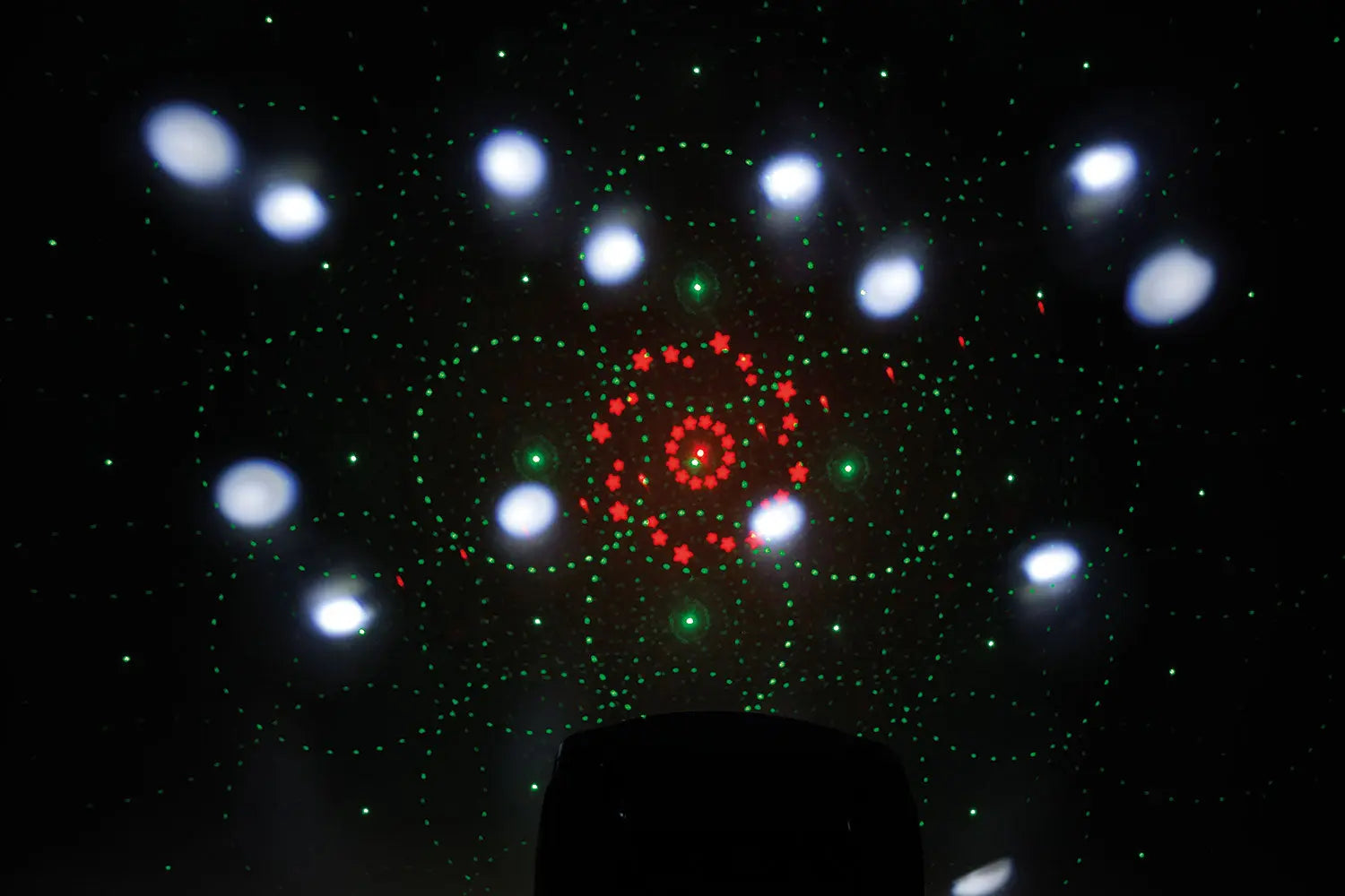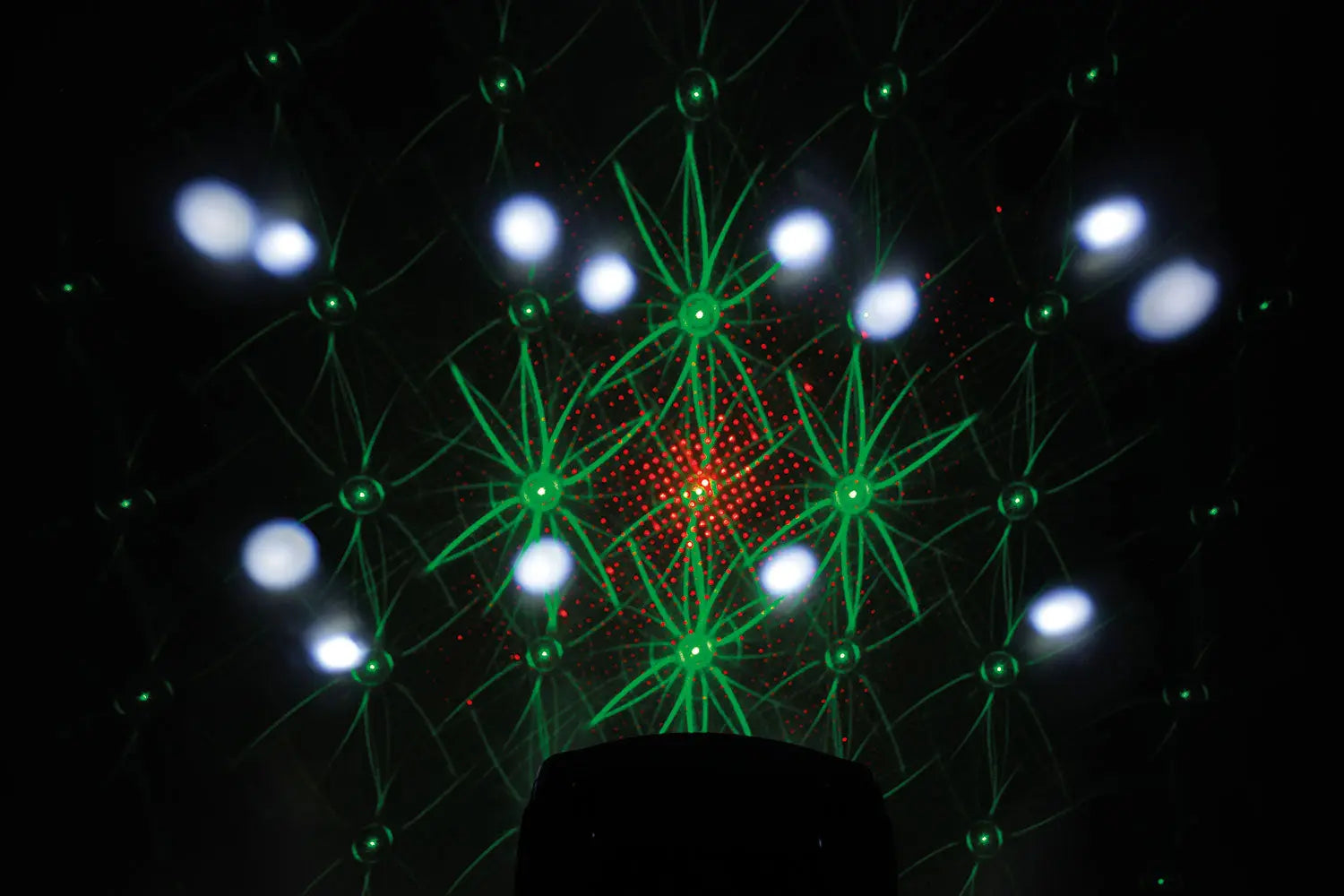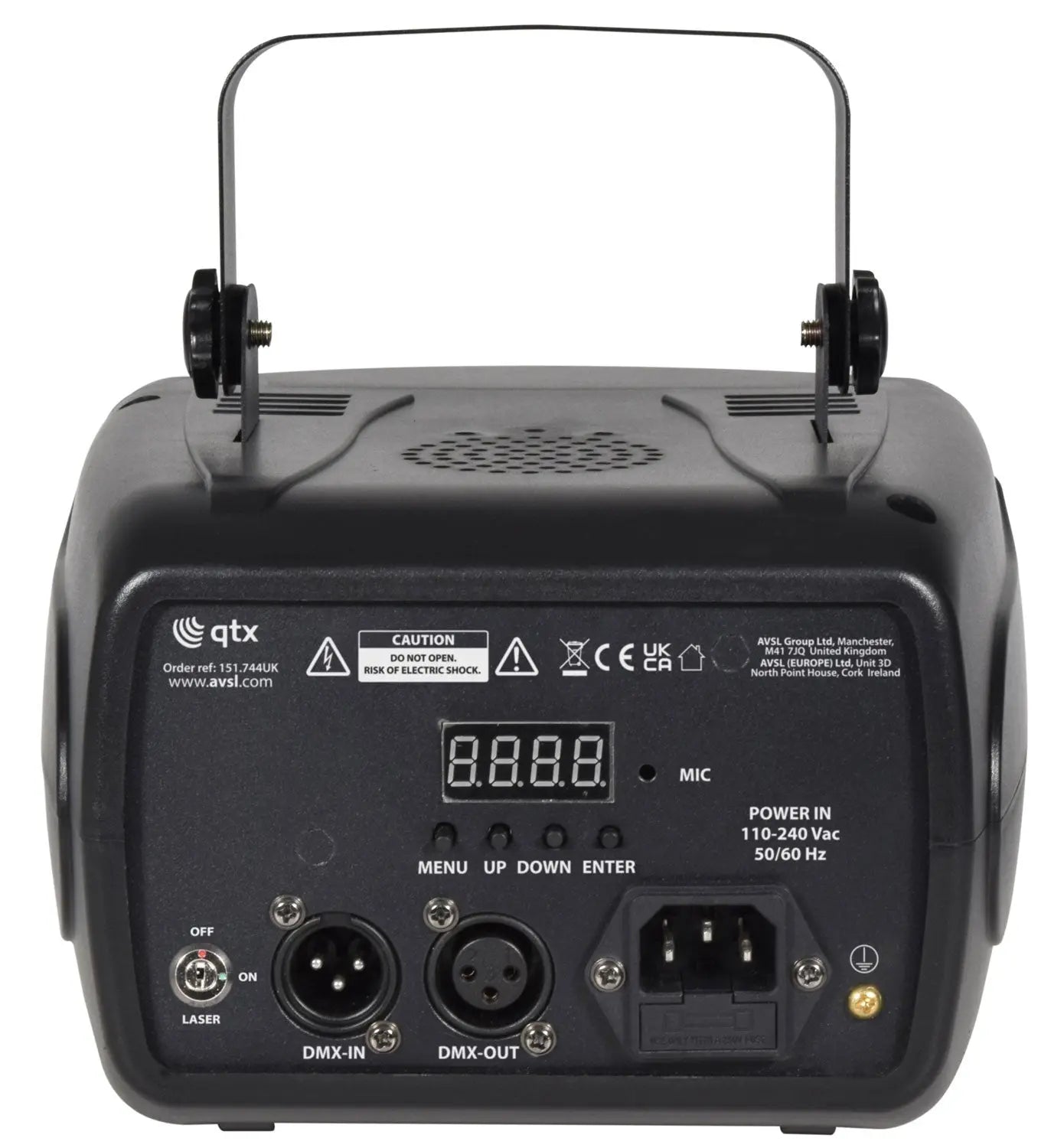 A compact 3-in-1 light effect combining a colourful butterfly effect, 6x 1W RGB PARs and Dual colour Laser in one convenient fixture. Easy to setup and use via an array of integrated automatic programs or sound to light. More precise control is provided via either 13-channel DMX connection or the included IR remote control.
