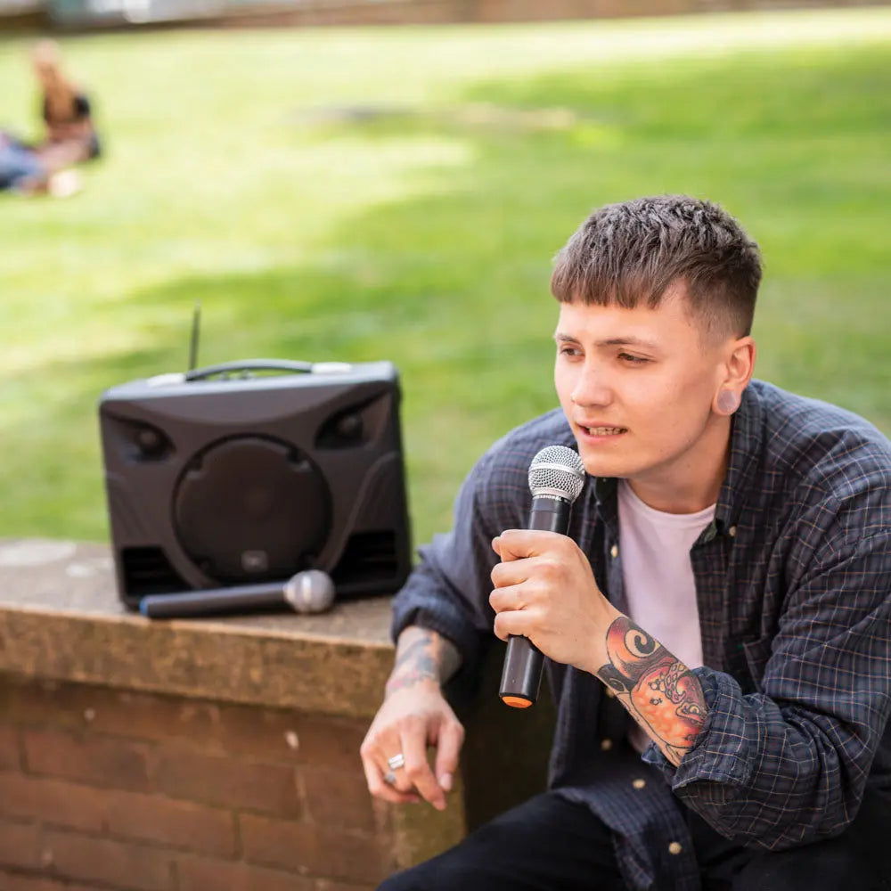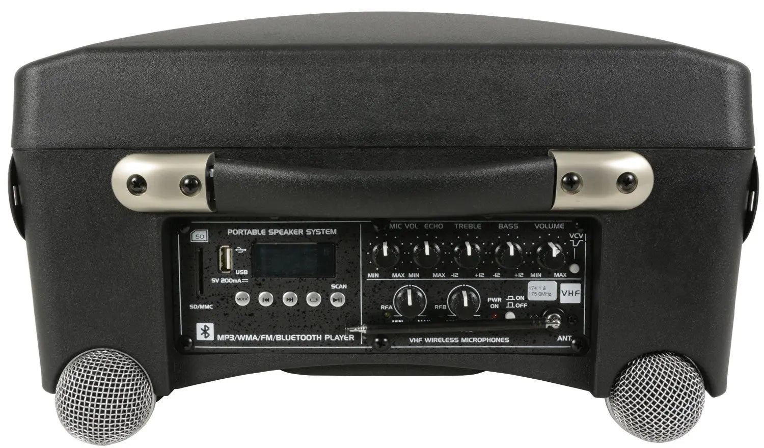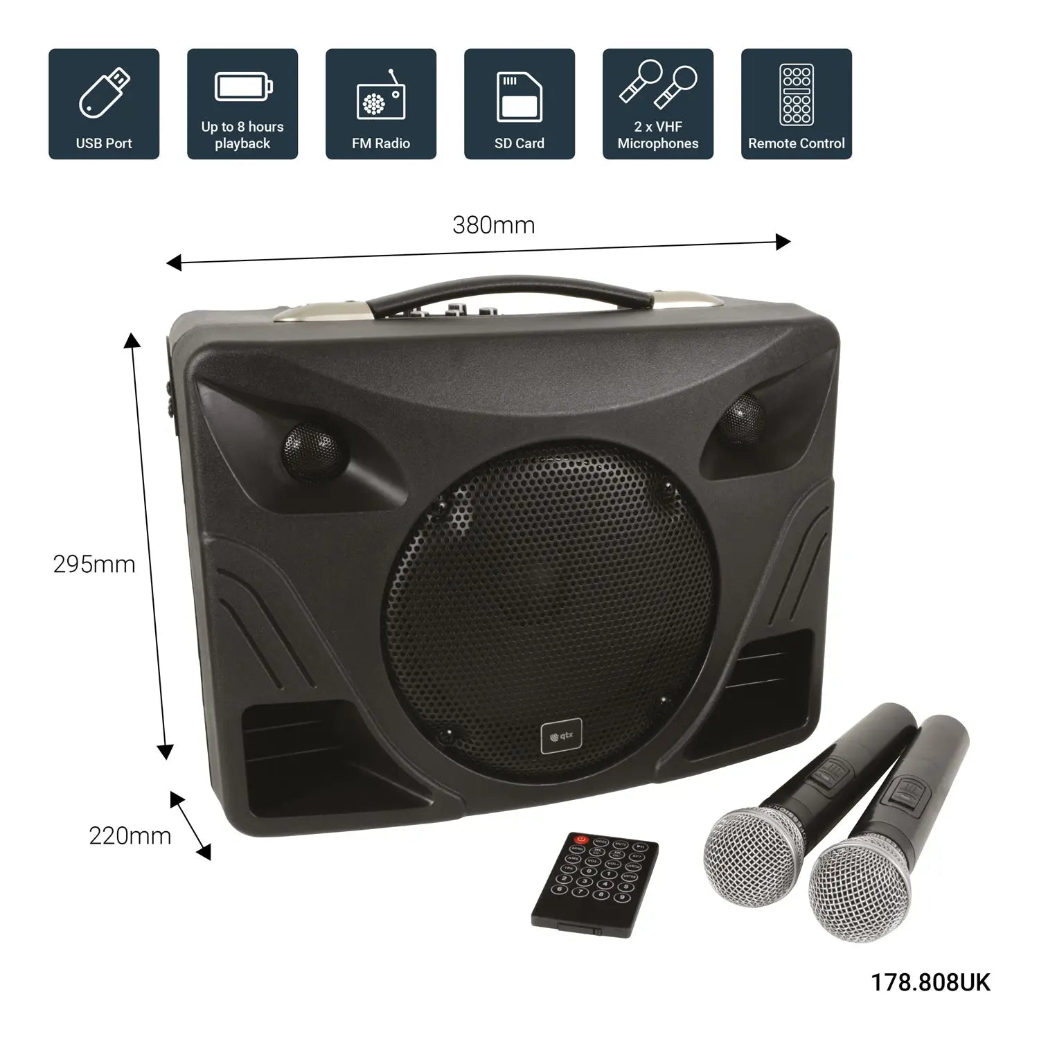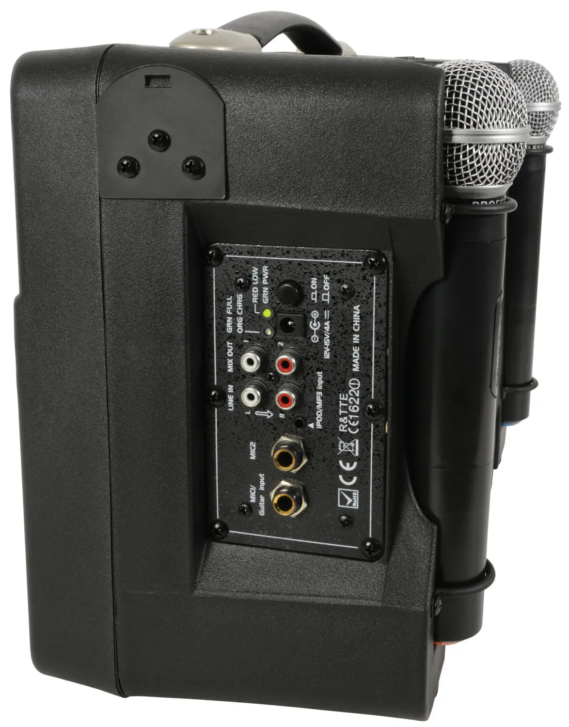 Self-contained PA unit with a compact PP moulded cabinet in a desktop format. Built-in USB/SD/FM player with Bluetooth receiver and dual handheld VHF microphone system make this a comprehensive solution for tasks as diverse as classroom activities, meetings and singing rehearsal. Mains or internal re-chargeable battery operation and very manageable size enable this unique product to be used practically anywhere.