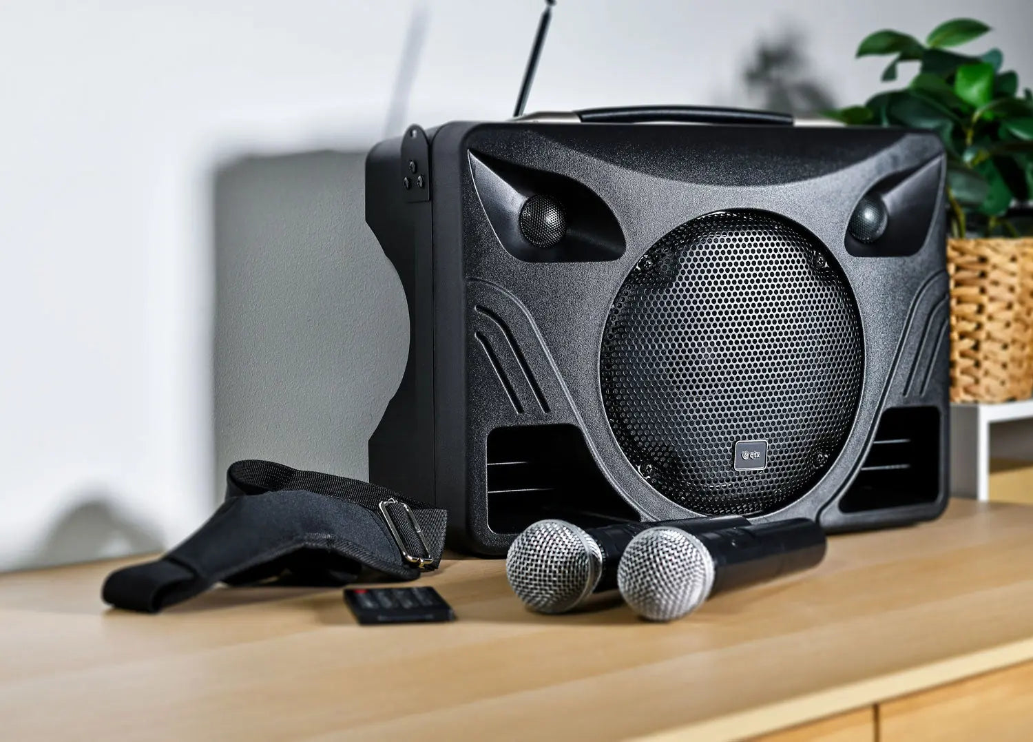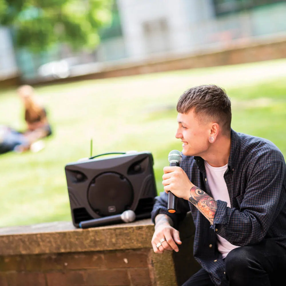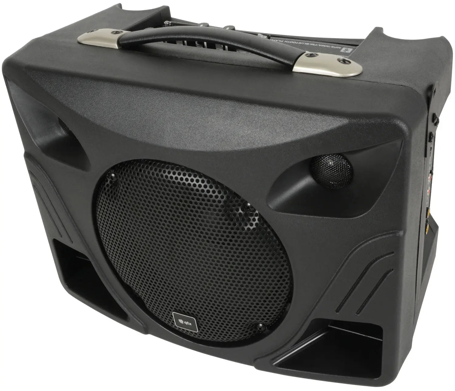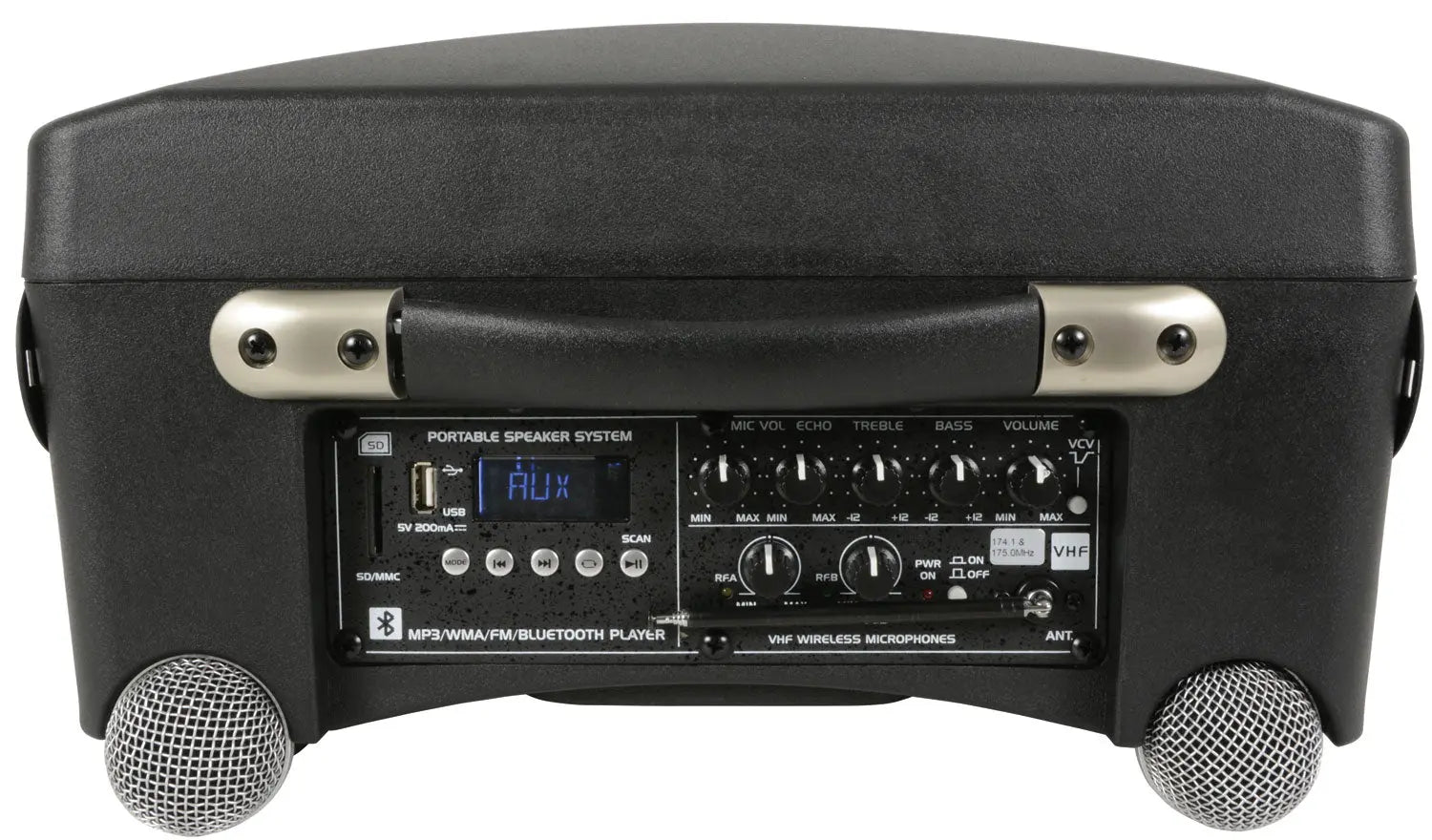 Self-contained PA unit with a compact PP moulded cabinet in a desktop format. Built-in USB/SD/FM player with Bluetooth receiver and dual handheld VHF microphone system make this a comprehensive solution for tasks as diverse as classroom activities, meetings and singing rehearsal. Mains or internal re-chargeable battery operation and very manageable size enable this unique product to be used practically anywhere.