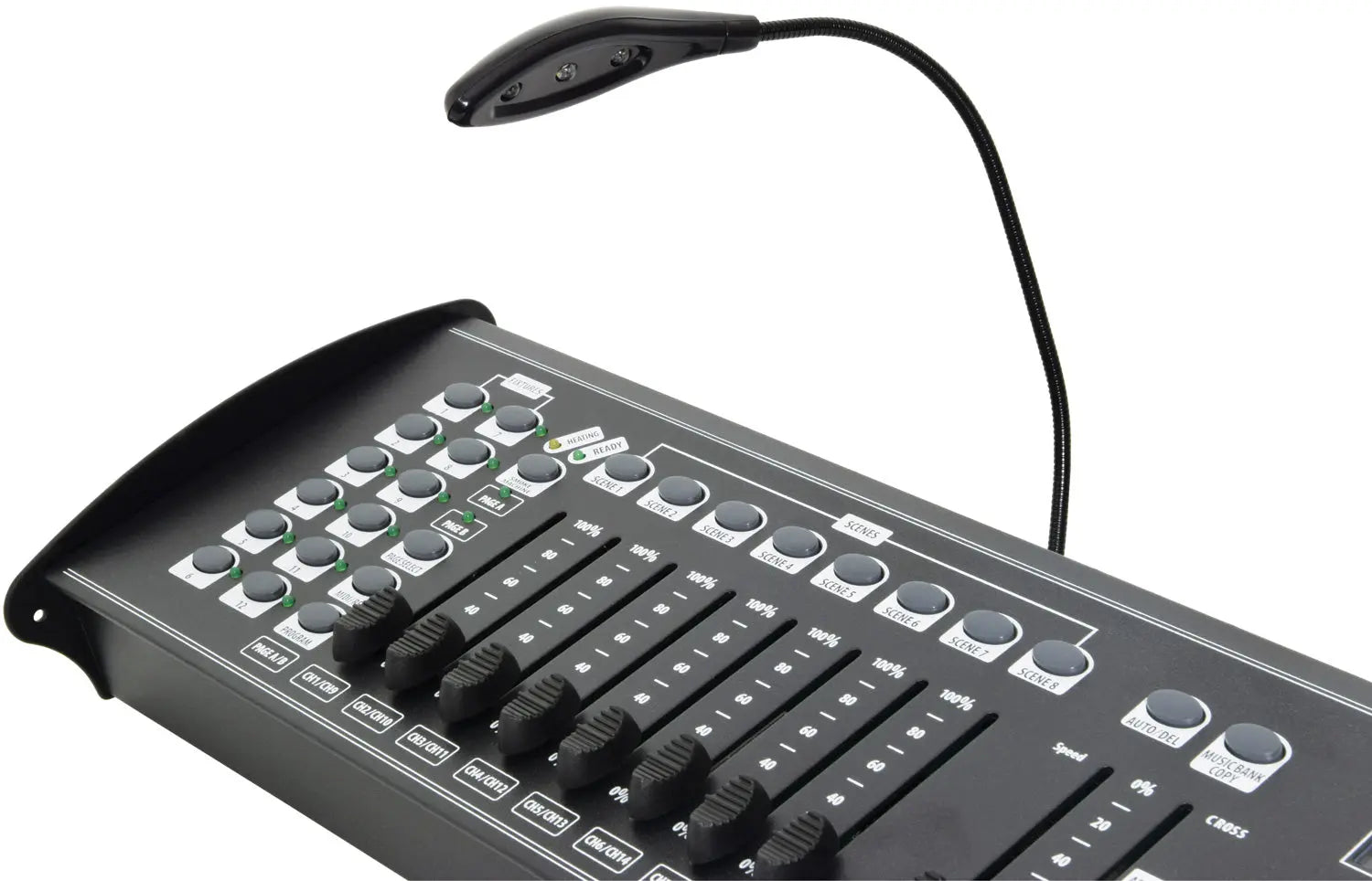 This 192 channel DMX controller has a joystick which can be programmed to control certain channels. This is then an ideal tool to fine tune the pan and tilt movements on a moving head or scanner. It comes complete with an LED gooseneck light that can be plugged in to the rear and help in dark environments. The unit itself has 12 scanner buttons, each controls up to 16 channels on each fixture, whilst the 30 programmable bank buttons hold 8 scenes each. These scenes can be programmed into 6 chase sequences each holding up to 240 scenes which can be triggered by sound, manually by tap or automatically by the time faders between 0.1 seconds and 10 minutes. This controller is ideal for small theatres or stage applications.