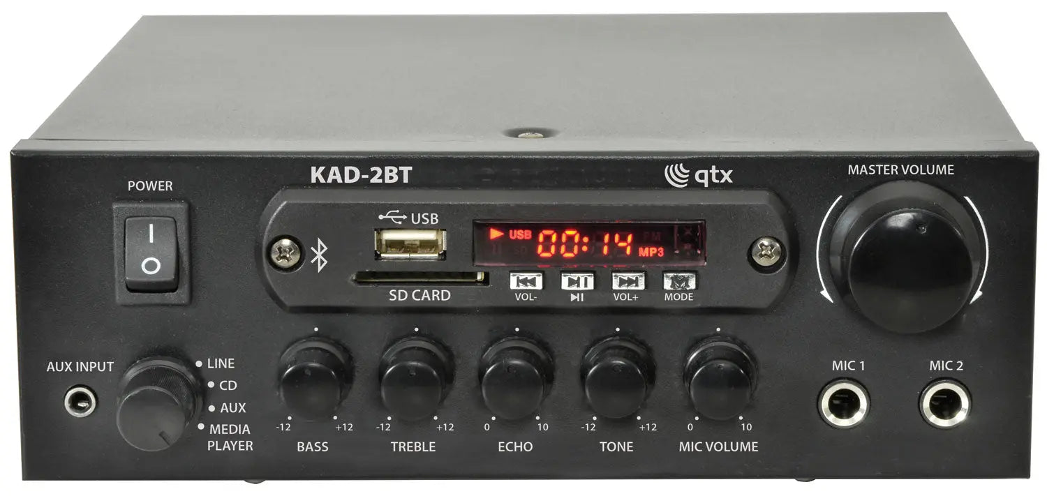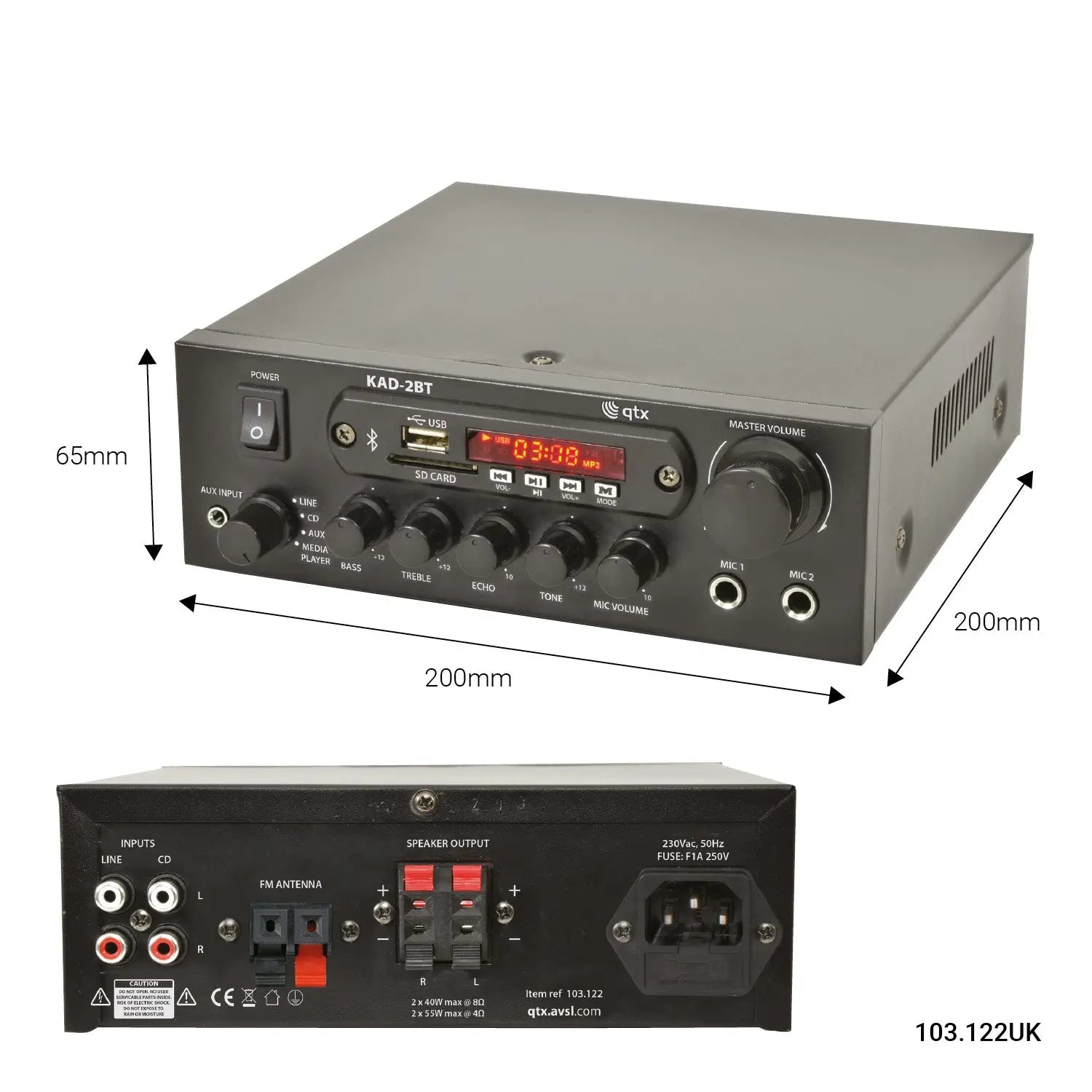 This compact digital amplifier has three selectable stereo inputs, two microphone inputs and is capable of delivering up to 55W max. per side. Mic volume, tone and echo effects are adjustable through rotary controls. Master Volume, Treble and Bass rotaries control tone and overall output. This amp also features built-in media player, Bluetooth connectivity and FM receiver. A multi-functional amplifier suitable for both domestic and commercial use.