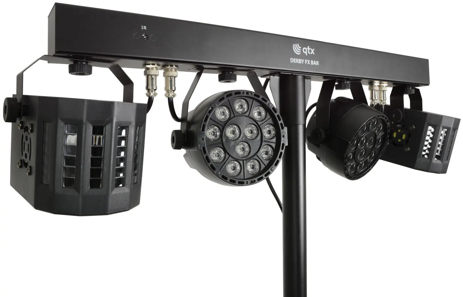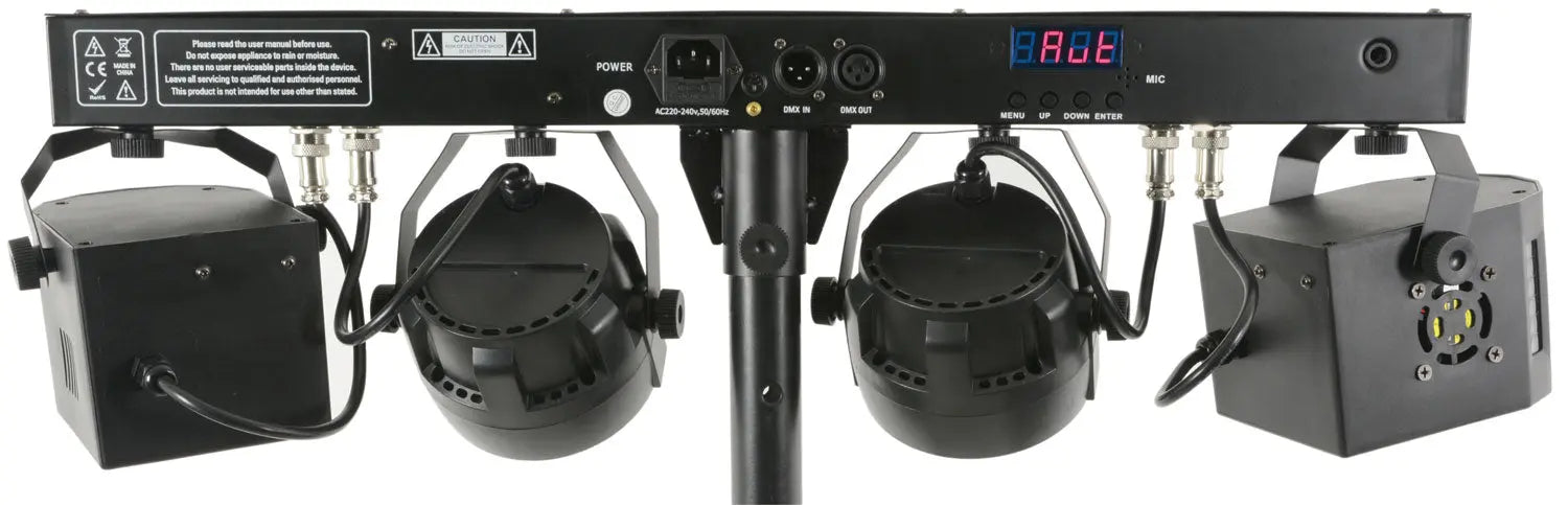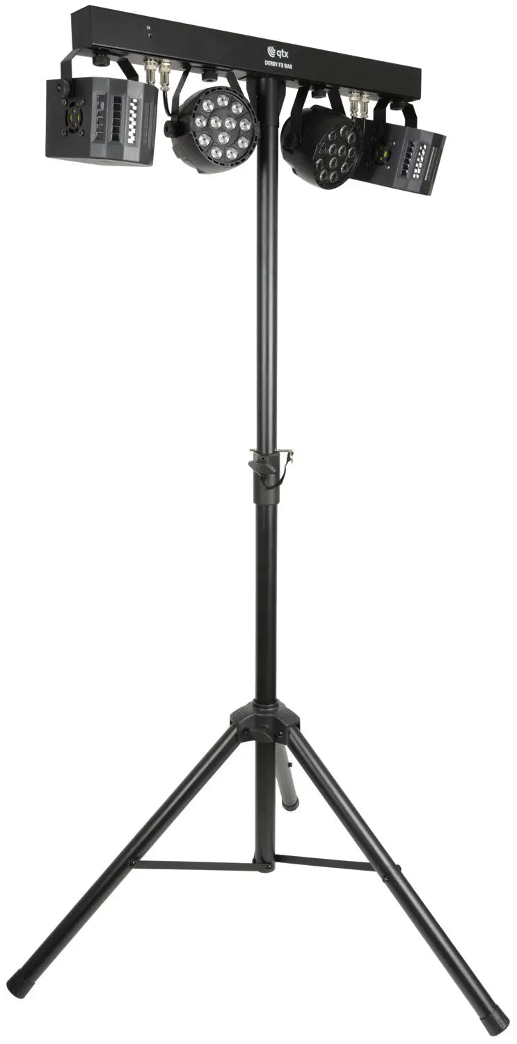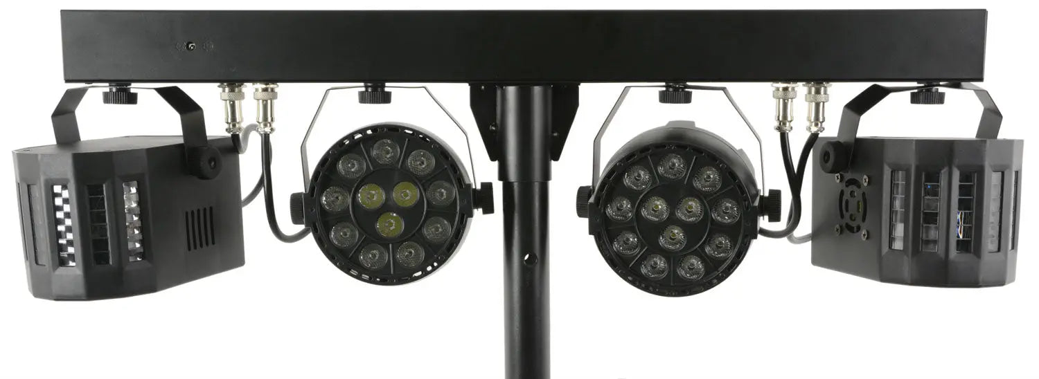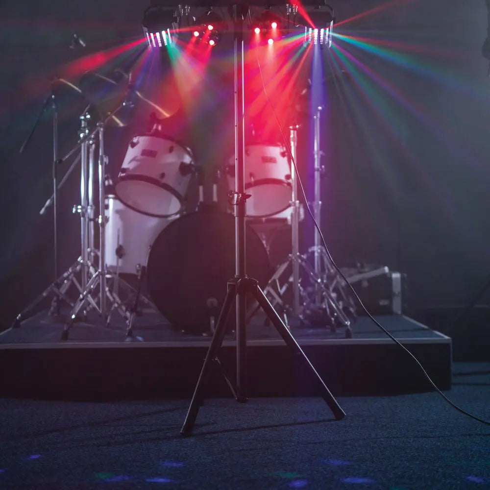Portable lighting set with 2 PAR cans and 2 LED Derby effects powered from a main T-bar. Controlled via DMX, infrared remote control or internal auto and sound-activated programs selectable from a control panel. Each lighting fixture is angle-adjustable to distribute colour washes and effects around the room. Designed as a complete light effects solution for parties, performers and special events.