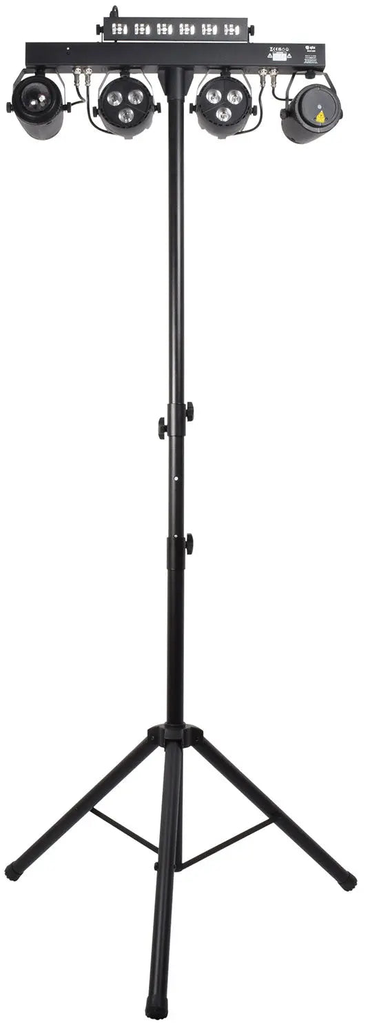 Complete portable lighting solution comprising 2 PAR cans, Ball effect, laser and UV/Strobe units all powered from a main T-bar. Easily controlled via DMX, infrared remote control or internal auto and sound-activated programs selectable from the rear control panel. Each lighting fixture is angle-adjustable to distribute colour washes and effects around the room. Supplied with 2.3m telescopic tripod stand and carry bags making it ideal for transporting to parties and events.