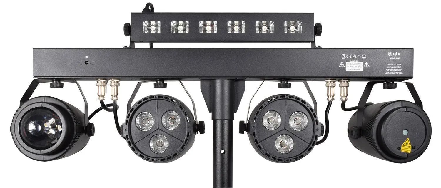 Multi effect T-bar comprising of 2x 12W RGBW PAR lights, 12W RGBW Ball effect, Red/Green Laser and top mounted 24W UV/Strobe units