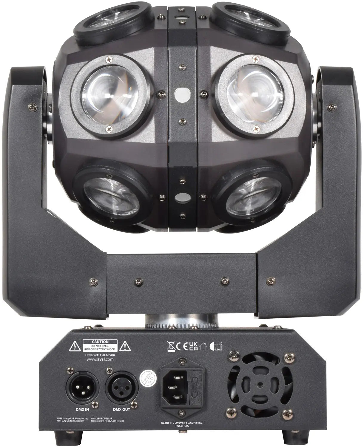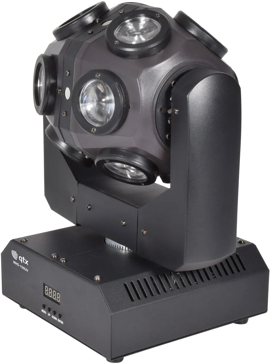 A dazzling moving head comprising 12 powerful 10W RGBW LEDs and 6 U/V LEDs which combine with 360° tilt movement to provide room filling effects from any position. The unit can be operated on auto, sound-to-light or DMX modes and can be free standing or mounted to trussing using the supplied fixing bracket and is ideal as a centrepiece light in bars, nightclubs and functions.