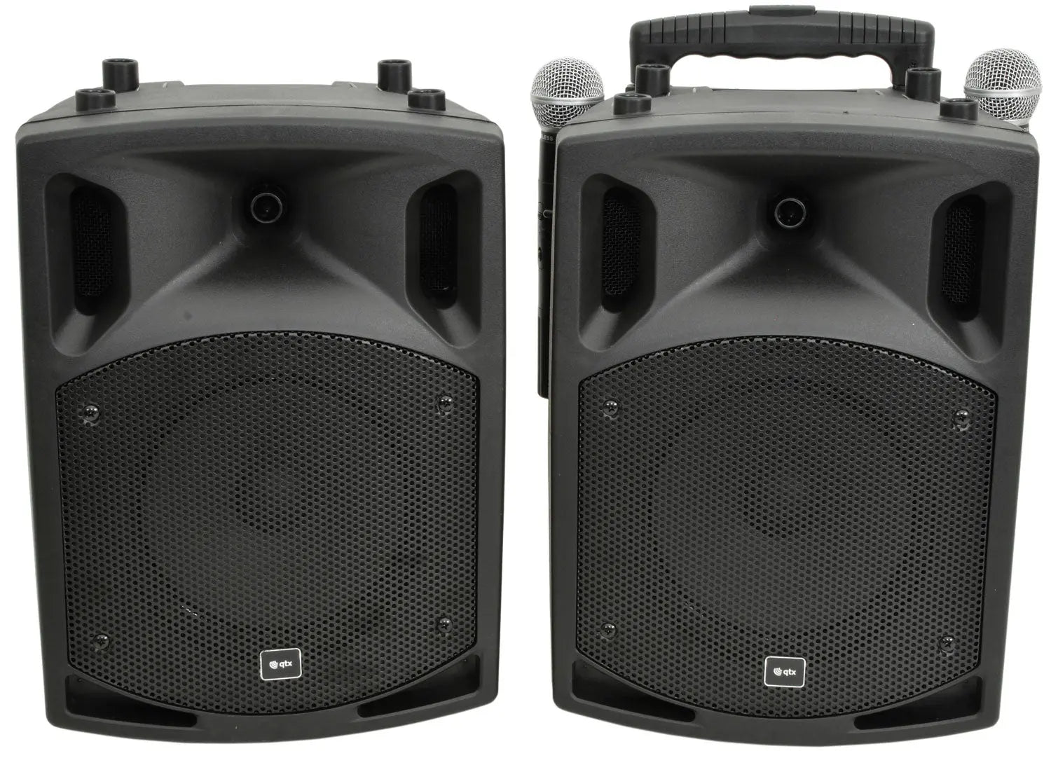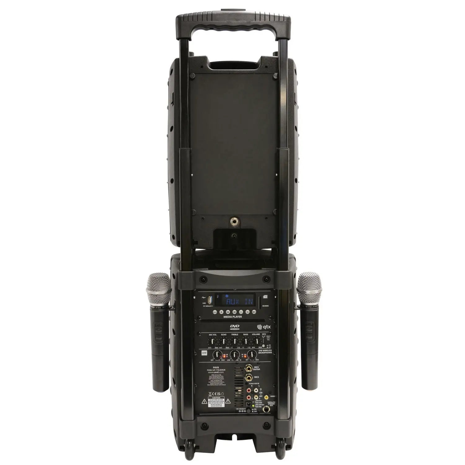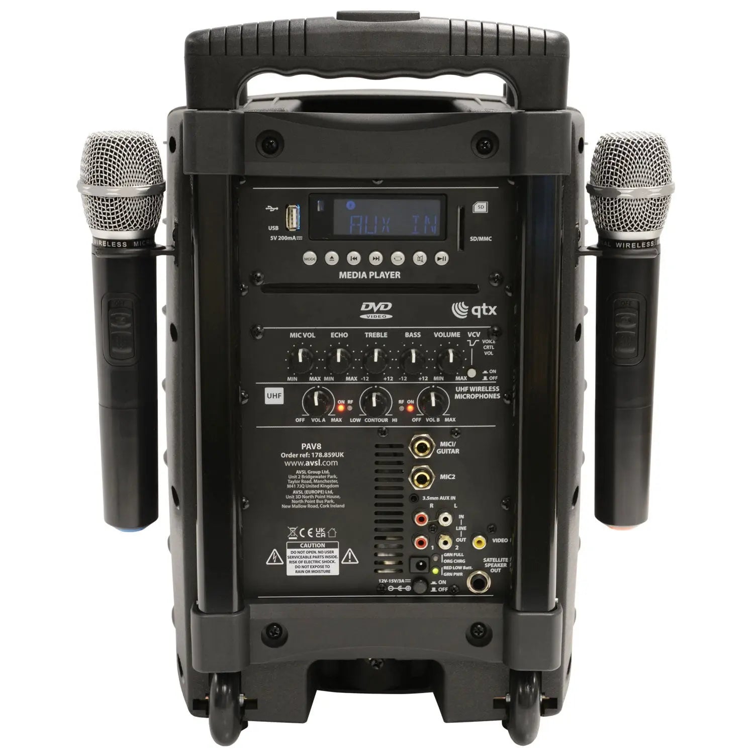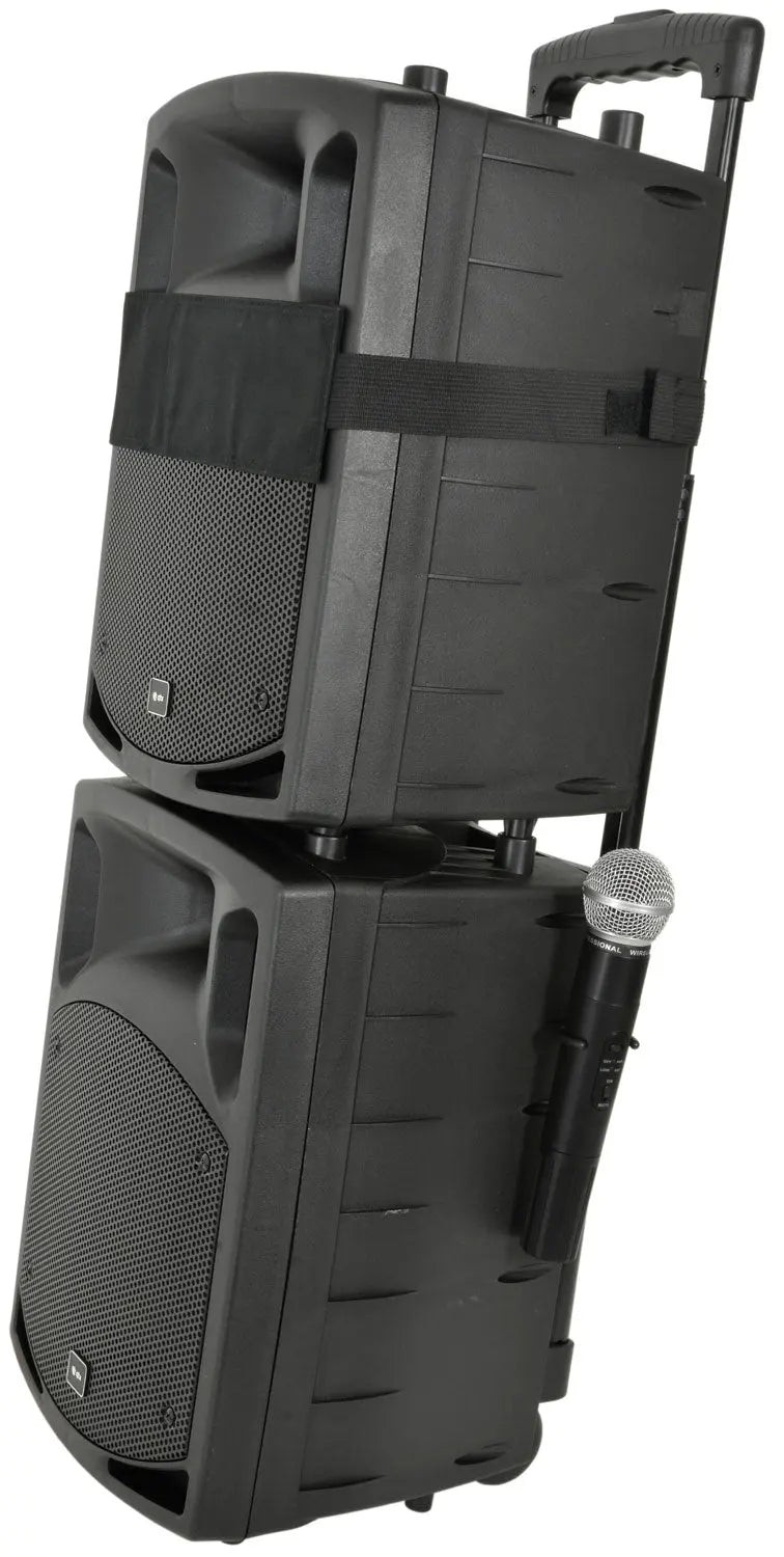 Portable PA set comprising a main active unit and passive satellite speaker. The main unit has a media player with options for playback from USB stick, SD card, Bluetooth or a slot fed disc player for CD and DVD. A pair of UHF handheld microphones are included in addition to 2 inputs for wired microphones with a built-in echo effect for vocalists and a VCV control enables mic priority over music. Operated from mains power or the internal rechargeable battery, the main unit also powers the passive satellite cabinet. Line input, output and composite video output offer easy connection to other equipment for expanded AV systems. A comprehensive multi-functional system for leisure, teaching and performances.