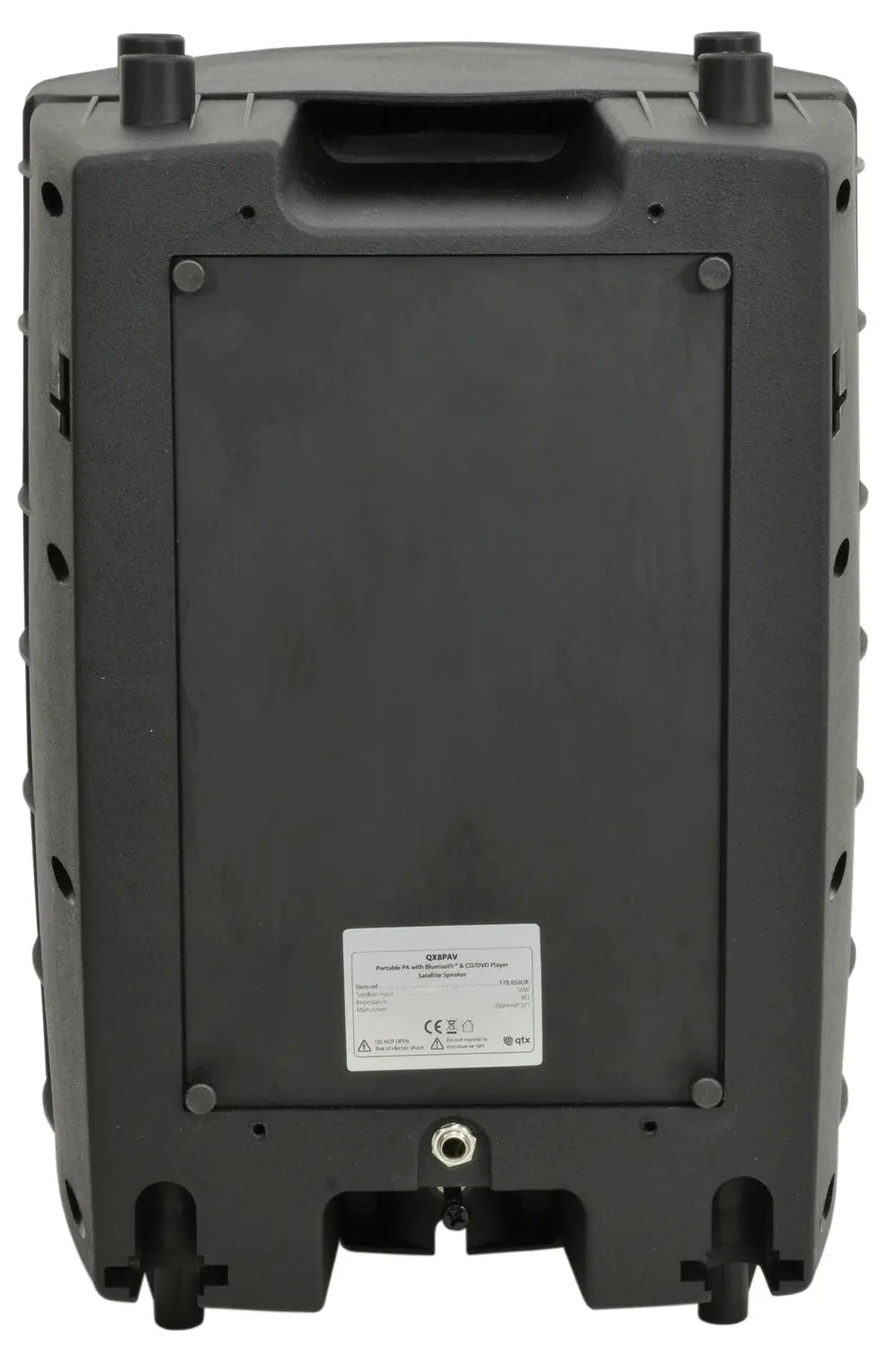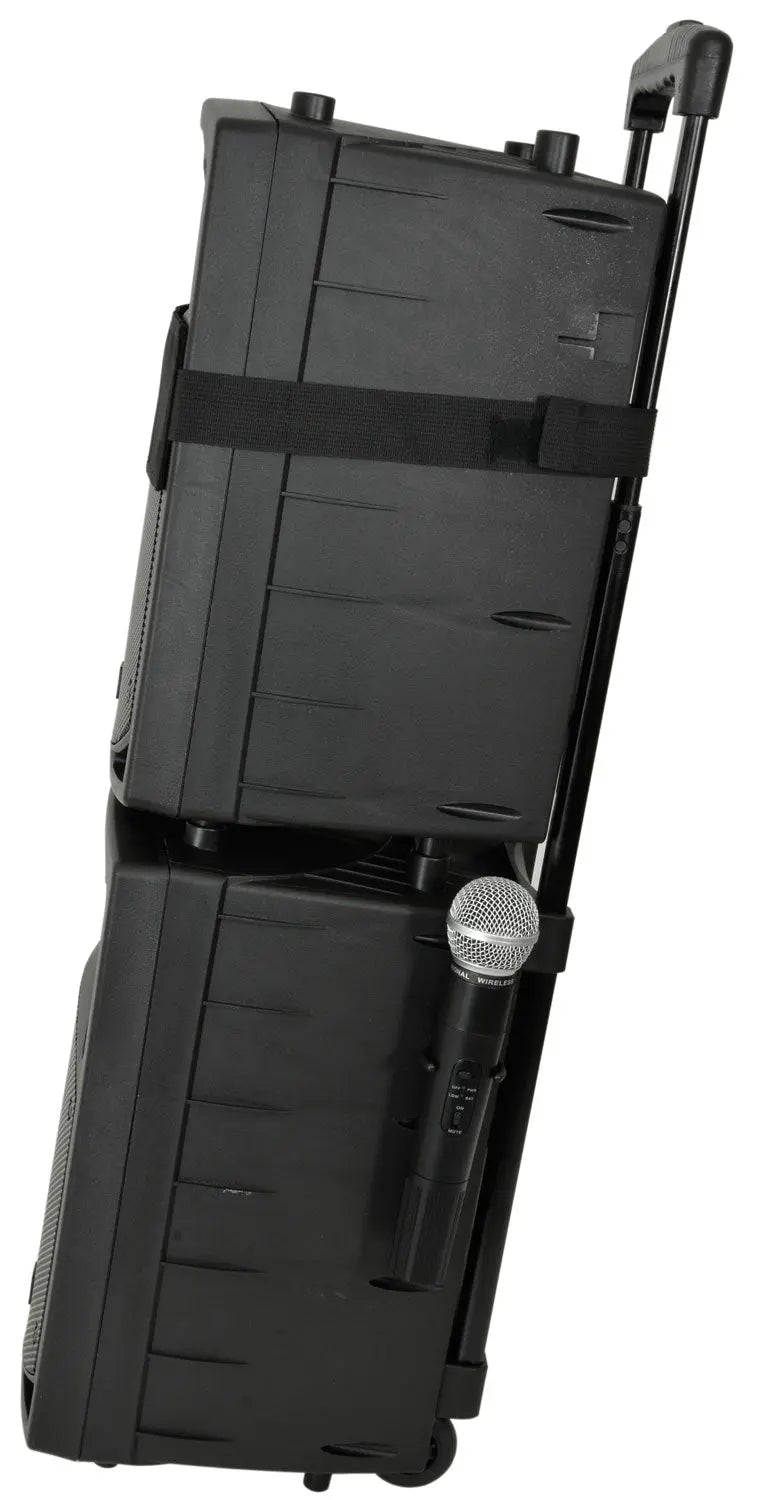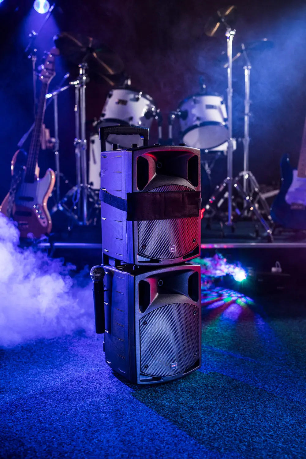 Portable PA set comprising a main active unit and passive satellite speaker. The main unit has a media player with options for playback from USB stick, SD card, Bluetooth or a slot fed disc player for CD and DVD. A pair of UHF handheld microphones are included in addition to 2 inputs for wired microphones with a built-in echo effect for vocalists and a VCV control enables mic priority over music. Operated from mains power or the internal rechargeable battery, the main unit also powers the passive satellite cabinet. Line input, output and composite video output offer easy connection to other equipment for expanded AV systems. A comprehensive multi-functional system for leisure, teaching and performances.