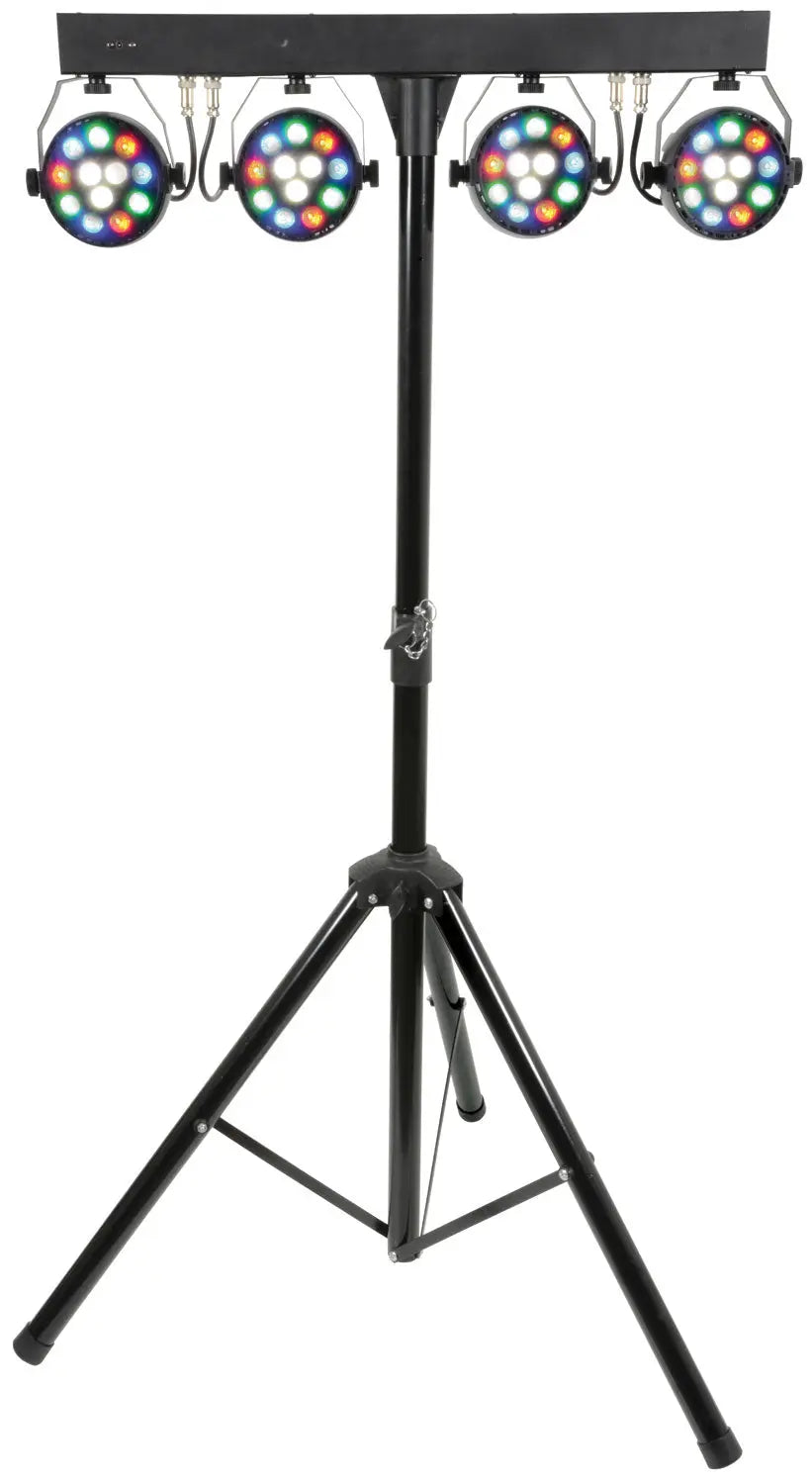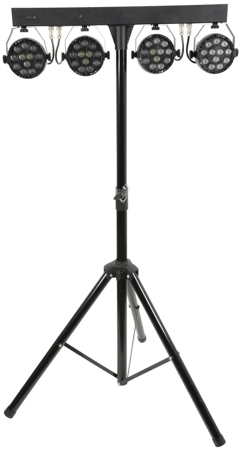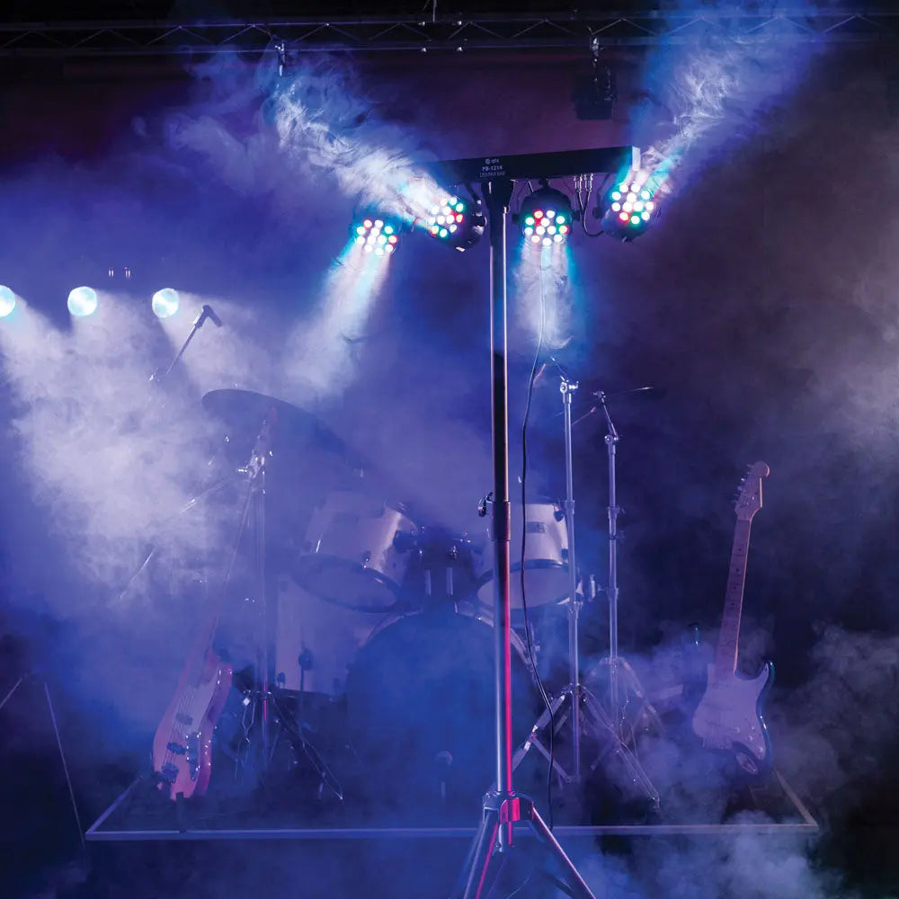A lightweight, versatile PAR bar system, perfect for mobile DJs and performers who need their lighting to be quick to set up and easily transportable. 4 PAR cans are each loaded with 12 LEDs in red, green, blue and white for super smooth colour blending.