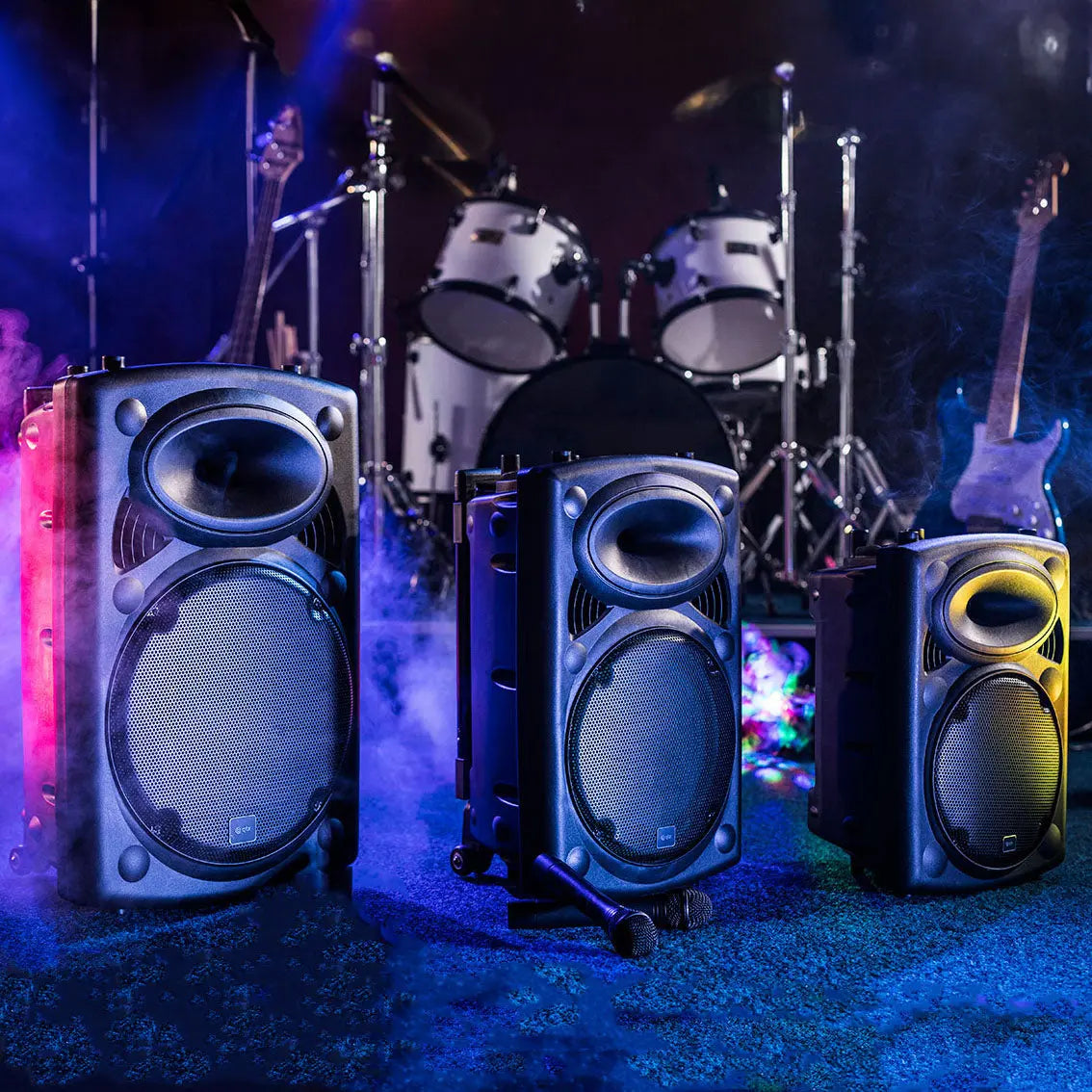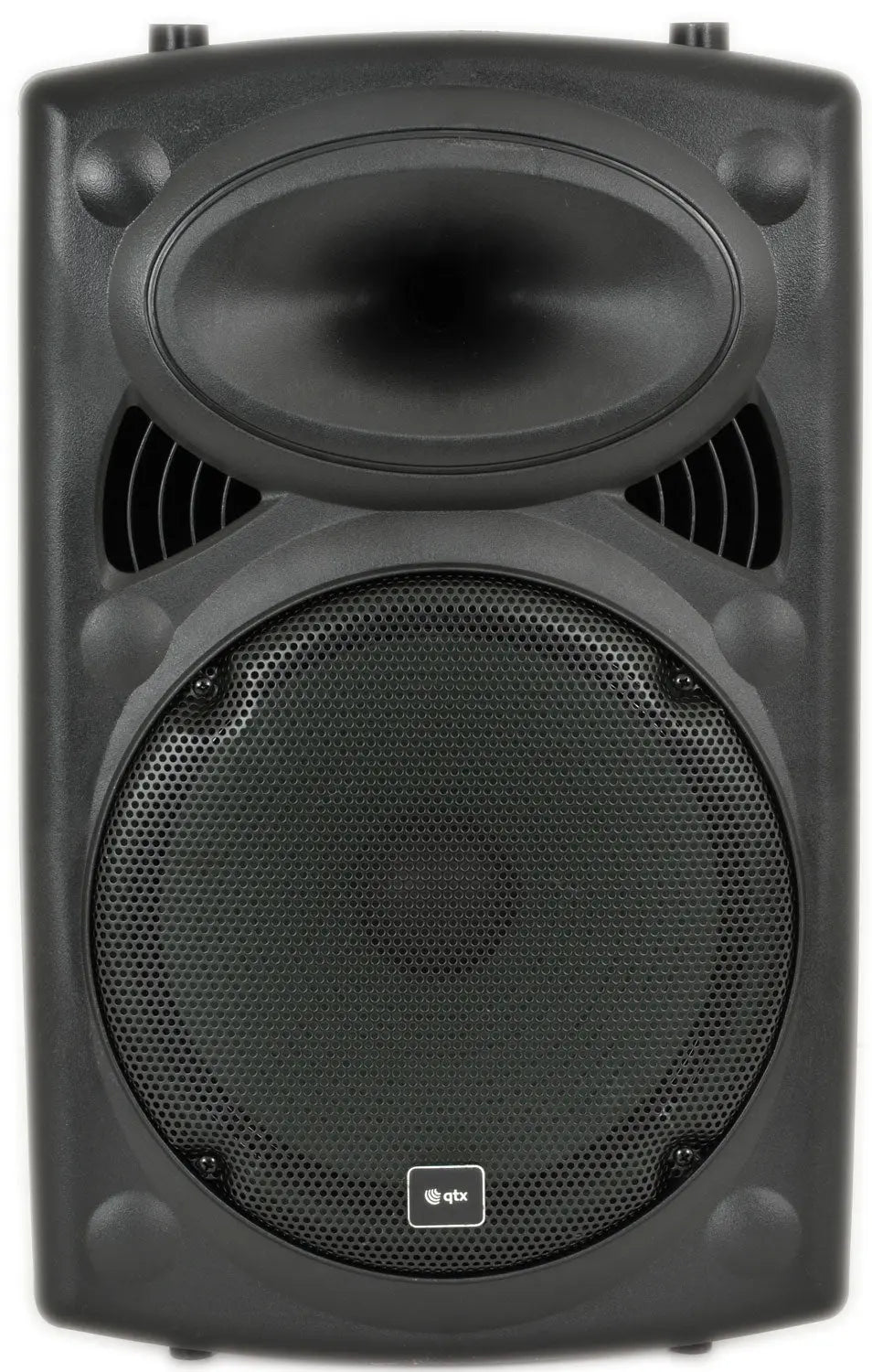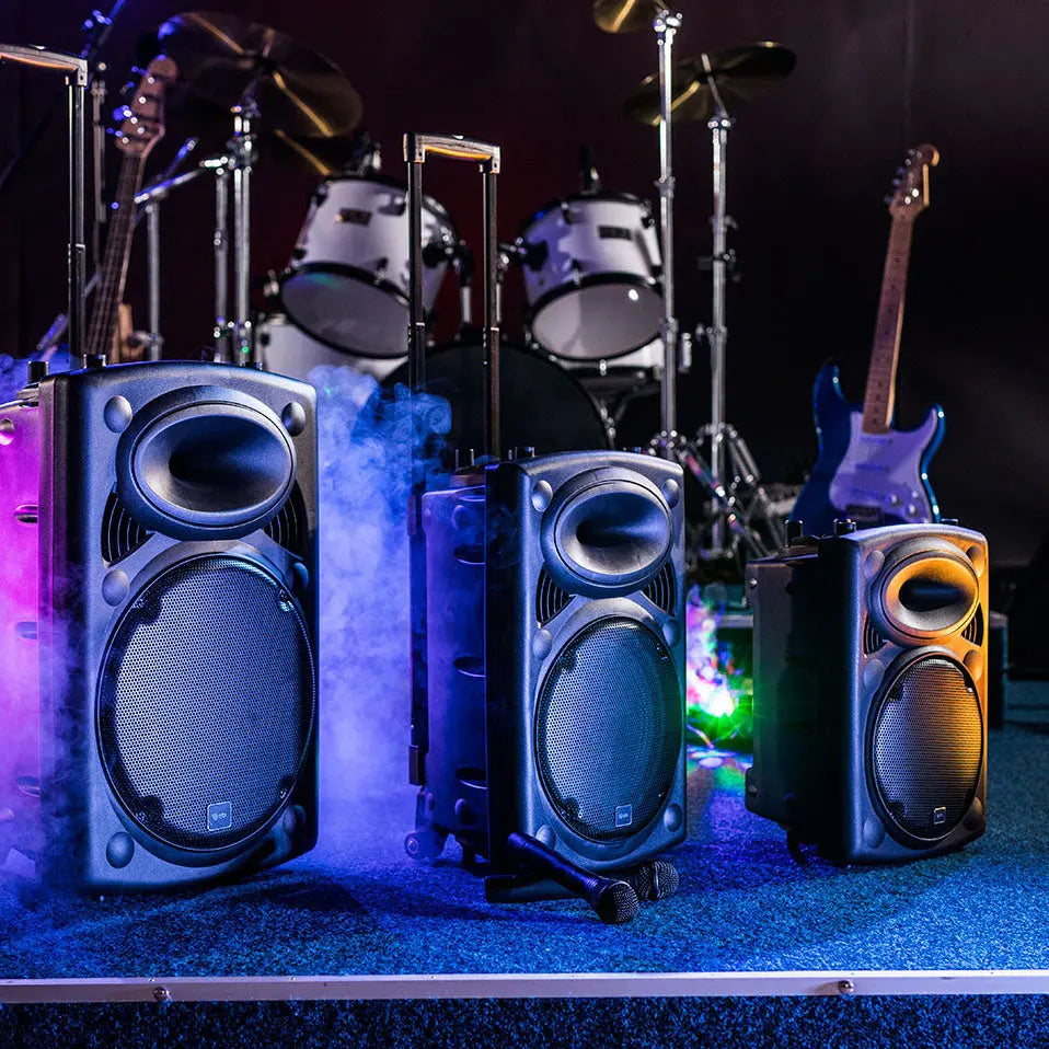 A compact, trolley-style wheeled portable PA unit with a top-mounted retractable pull handle and side-mounted carry handle. Versatile input options include 2 VHF wireless microphones (included), 2 further mic inputs (one can also be used for guitar), mini jack (for phones, tablets, laptops and mp3 players), and RCA in/out (ideal for DJs). An internal media player works directly from SD card or USB memory stick, and a switchable VCV ‘voiceover’ feature automatically lowers the volume of background music when the mics are used. A 35mm pole mount enables the unit to be used on a stand. Mains or internal battery power (up to 8 hours).