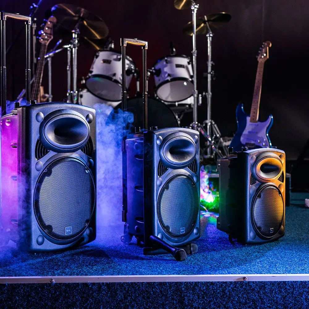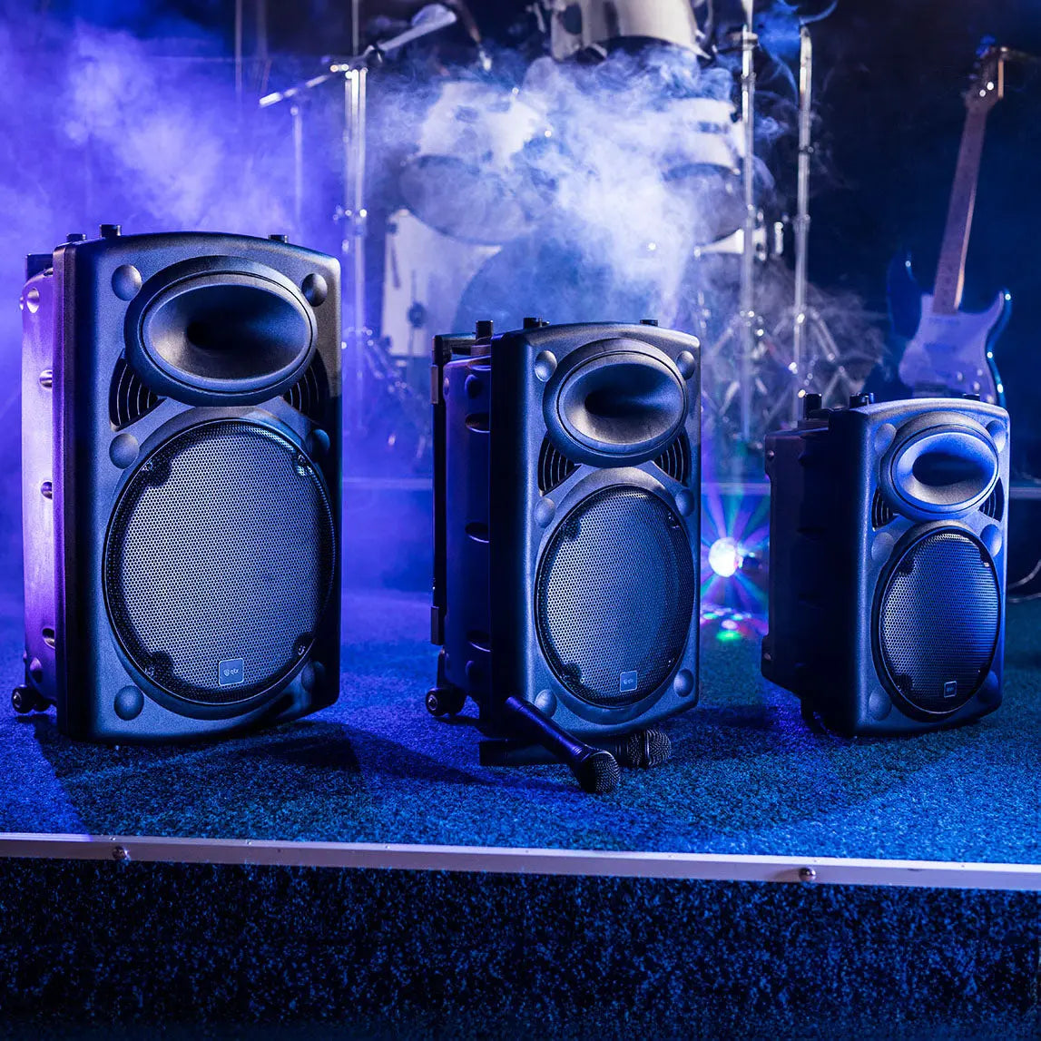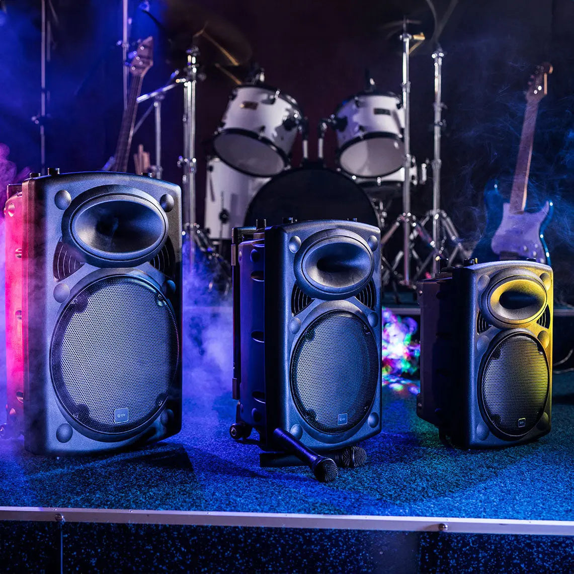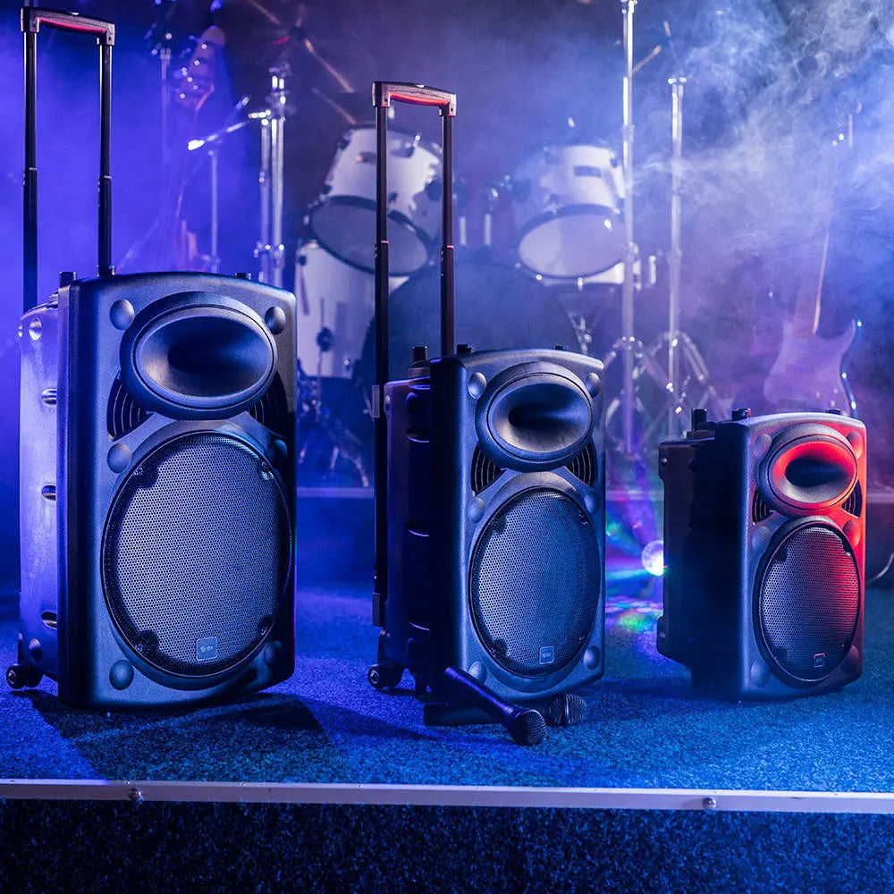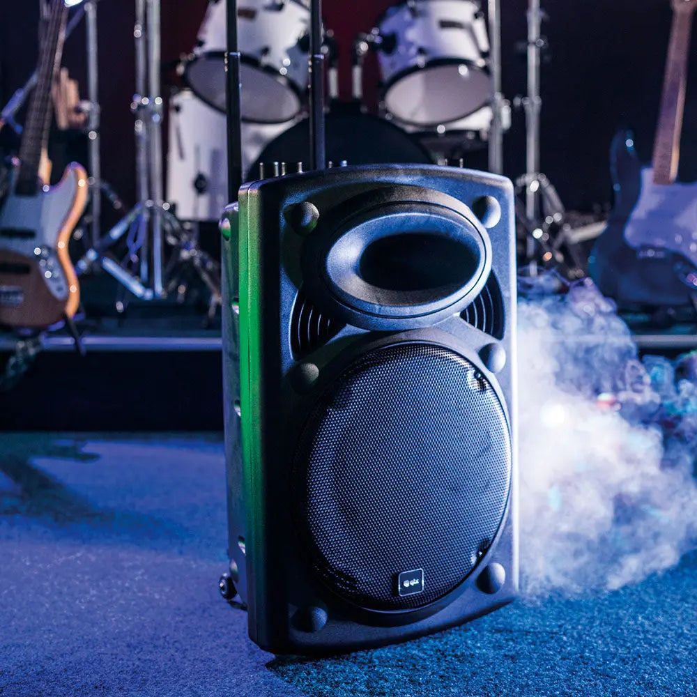 A compact, trolley-style wheeled portable PA unit with a top-mounted retractable pull handle and side-mounted carry handle. Versatile input options include 2 VHF wireless microphones (included), 2 further mic inputs (one can also be used for guitar), mini jack (for phones, tablets, laptops and mp3 players), and RCA in/out (ideal for DJs). An internal media player works directly from SD card or USB memory stick, and a switchable VCV ‘voiceover’ feature automatically lowers the volume of background music when the mics are used. A 35mm pole mount enables the unit to be used on a stand. Mains or internal battery power (up to 8 hours).