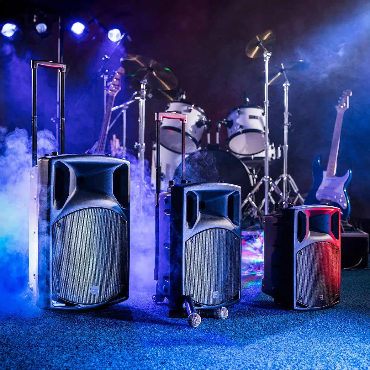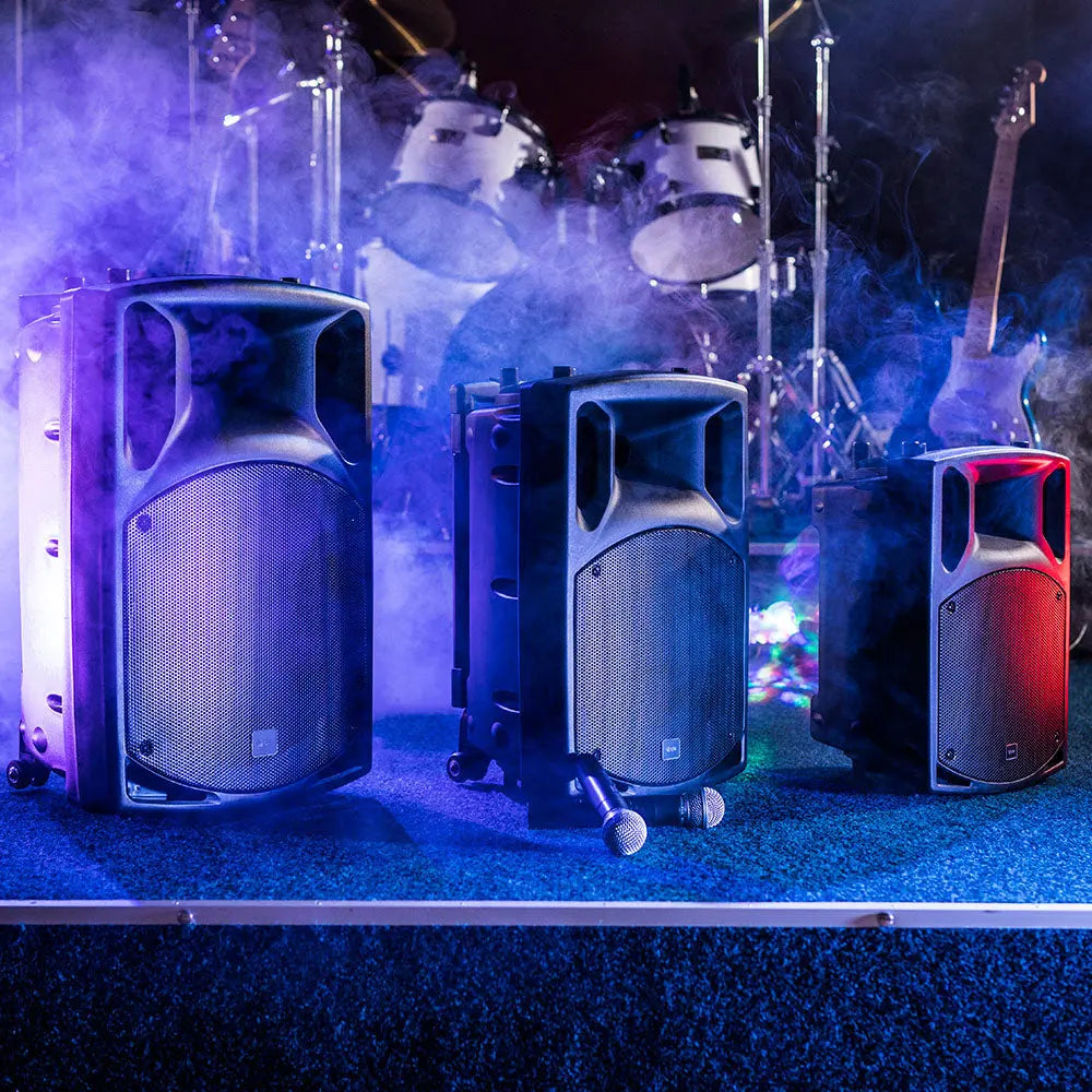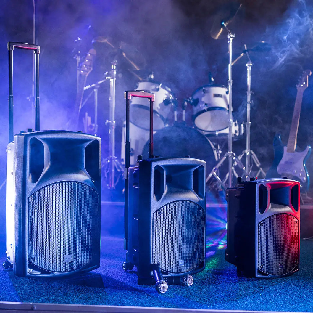A self-contained PA system with pull and carry handles for easy portability, and a host of connectivity options including Bluetooth. The unit is supplied with 2 VHF wireless microphones, and features 2 further mic inputs, one of which doubles as a guitar input. The aux input is ideal for phones, tablets, laptops and mp3 players; and the RCA in/out adds DJ connectivity and expansion/recording possibilities. SD and USB media, an integrated FM radio tuner, and paired Bluetooth devices can be controlled via the internal media player with IR remote control. A switchable VCV ‘voiceover’ function automatically lowers the volume of background music when a mic signal is received. Powered by mains or internal rechargeable battery (up to 8 hours), and pole/stand mountable.