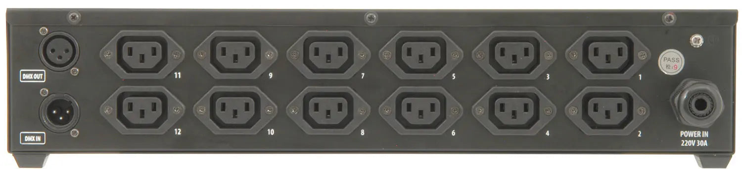 The RP12 is a relay pack with 12 IEC power outputs. Each output is controlled by an individual relay which turns the power on and off saving energy and preserving the lifespan of your light effects. This is ideal for use with low voltage LED light effects which, when used with dimmer packs, turn on and off randomly with the pulse voltage sent through the system. These outputs can be turned on or off using the controls on the digital LED front panel display or by DMX which can be configured so that there are 12, 6, 3, 2 or 1 channel DMX allowing you to suit the need for your setup.