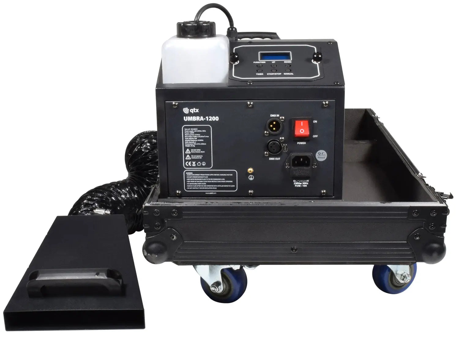 Stage effect machine producing 'dry ice' type low fog effects without the use of carbon dioxide or ice. New technology delivers a ground-hugging mist from standard fog fluid and water. Housed in a full flight case with castors for portability, the main unit has a removable fluid tank and easy access water reservoir with drain tap. the mist is delivered via a flexible duct and output funnel to allow the user to direct the effect onto a specific area of the stage. Operated by the onboard digital control panel, which can be detached as a wired remote or via DMX512. Designed to provide a dramatic low flowing mist scene for stages, theatres and themed events.