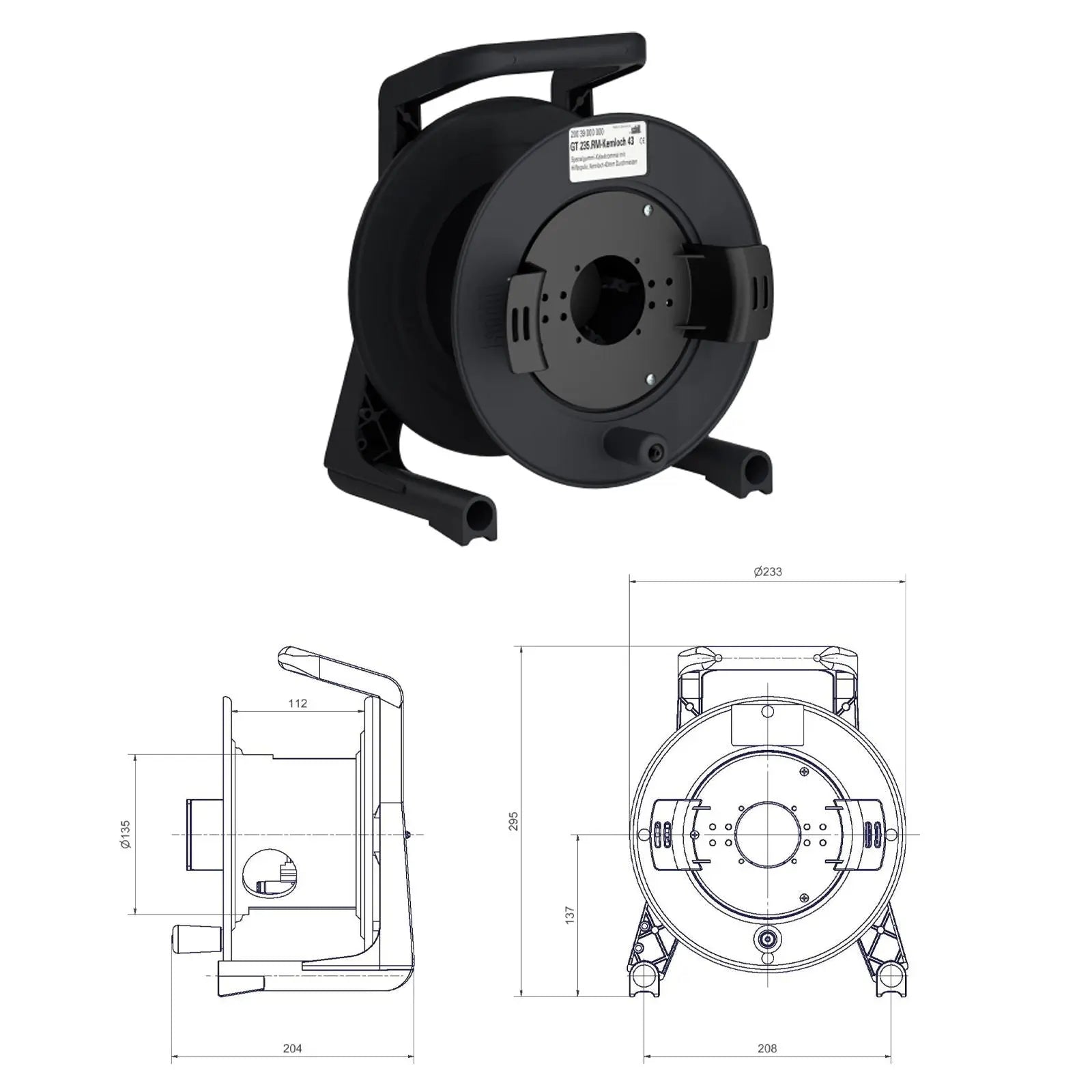 Rugged cable reels often classed as the industry standard within the sound lighting and events sectors. Manufactured in Germany using carefully selected materials to avoid breakages or failures onsite or in use. Being impervious to chemicals petrol and oil these cable reels are ideally suited to environments where such substances are prevalent. With an operating temperature of -20°C to +100°C and being weather-resistant these reels can cope with the most inhospitable conditions. The larger hole allows completed/terminated cable assembles to be wound on and fully-off with ease. When rewinding the cable connector can be fed through the hole wound and secured onto the RM flange ready for safe stowage or transport. 5 year warranty RM version features auxiliary spool to keep cable tails stored neatly Break-proof PVC frame with locking drum brake PVC winding reel with unbreakable one-piece side flanges made of synthetic rubber Supplied without cable Max. capacity: 75m microphone cable (approx.) Drum: 235mmØ 43mmØ hole Weight: 1.03kg Manufacturers part number: GT 235.RM